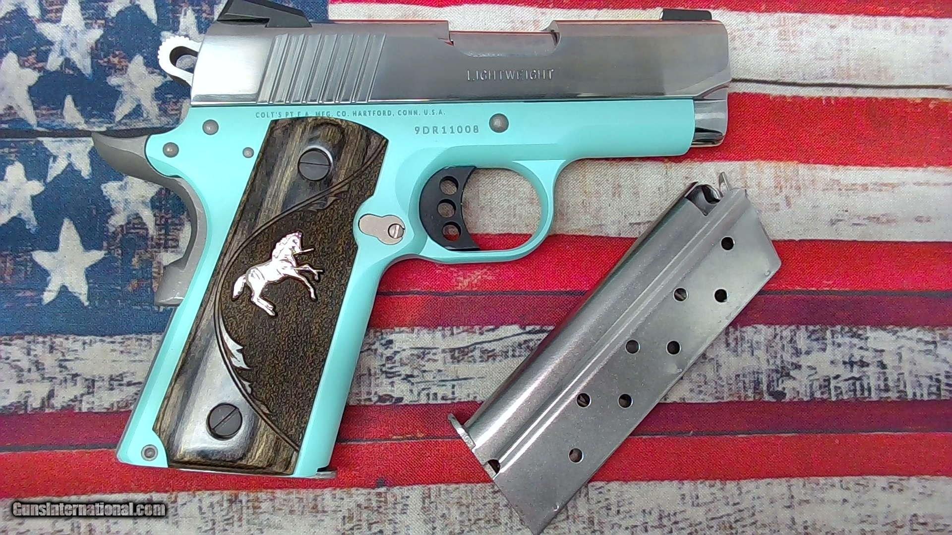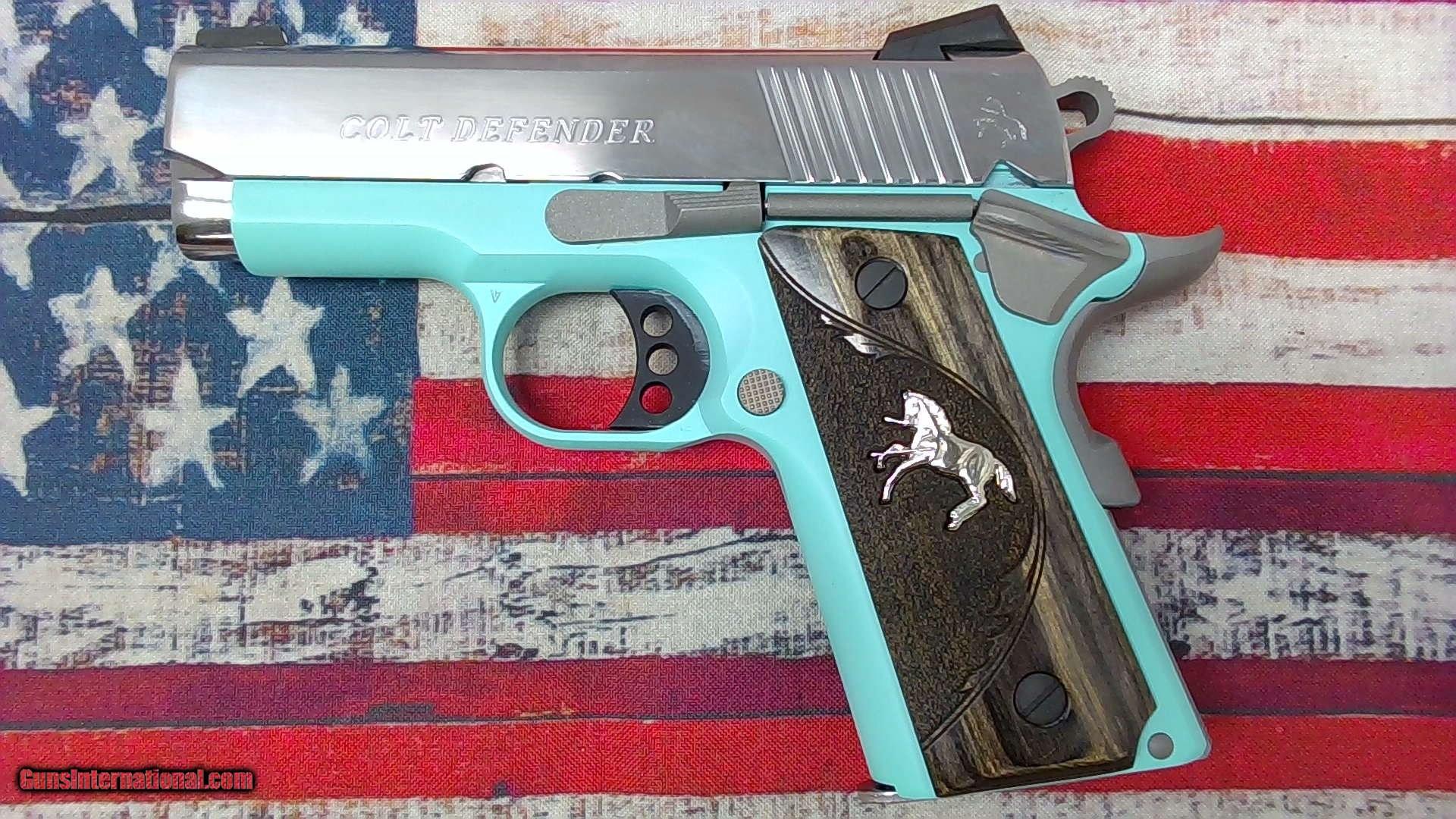 Description: Guns Listing ID: 593399 Pre-owned Colt Defender Lightweight 9mm 1911 compact pistol. This is an exclusive 1 of 300 in Robins Egg Blue. This gun is in excellent condition. This Colt Defender 9mm with Robins Egg Blue Cerakote frame is 1 of 300 made. It features a combination of a Blue cerakote frame and a stainless-steel slide, as well as special Colt Logo Diamondwood Grips. Other features include a manual thumb safety, beavertail grip and two 8-round magazines. Manufacturer: Colt Model: Defender Model Number: O7002D-REB Caliber: 9mm Luger Barrel Length: 3\" Overall Length: 6.75\" Frame Finish: Robins Egg Blue Cerakote Slide Finish: Polished Stainless Steel Weight: 24 oz. Safety: Manual Thumb Safety; Beavertail Grip Magazine Capacity: 8 Rounds Grips: Colt Logo Diamondwood Grips Action: Single Action Other Features: Brushed Stainless Controls; Black Trigger; 1 of 300 They say a picture is worth a thousand words. These photos are the best statement of condition; please review them carefully before purchasing. Manufacturer: COLT Model: defender lightweight Caliber Info: 9MM LUGER (9x19 PARA) Condition: Used - Non-Certified Barrels: 3" BARREL Action: SEMI AUTOMATIC Finish: ROBIN‚S EGG BLUE Price: $889.99 Contact Seller |