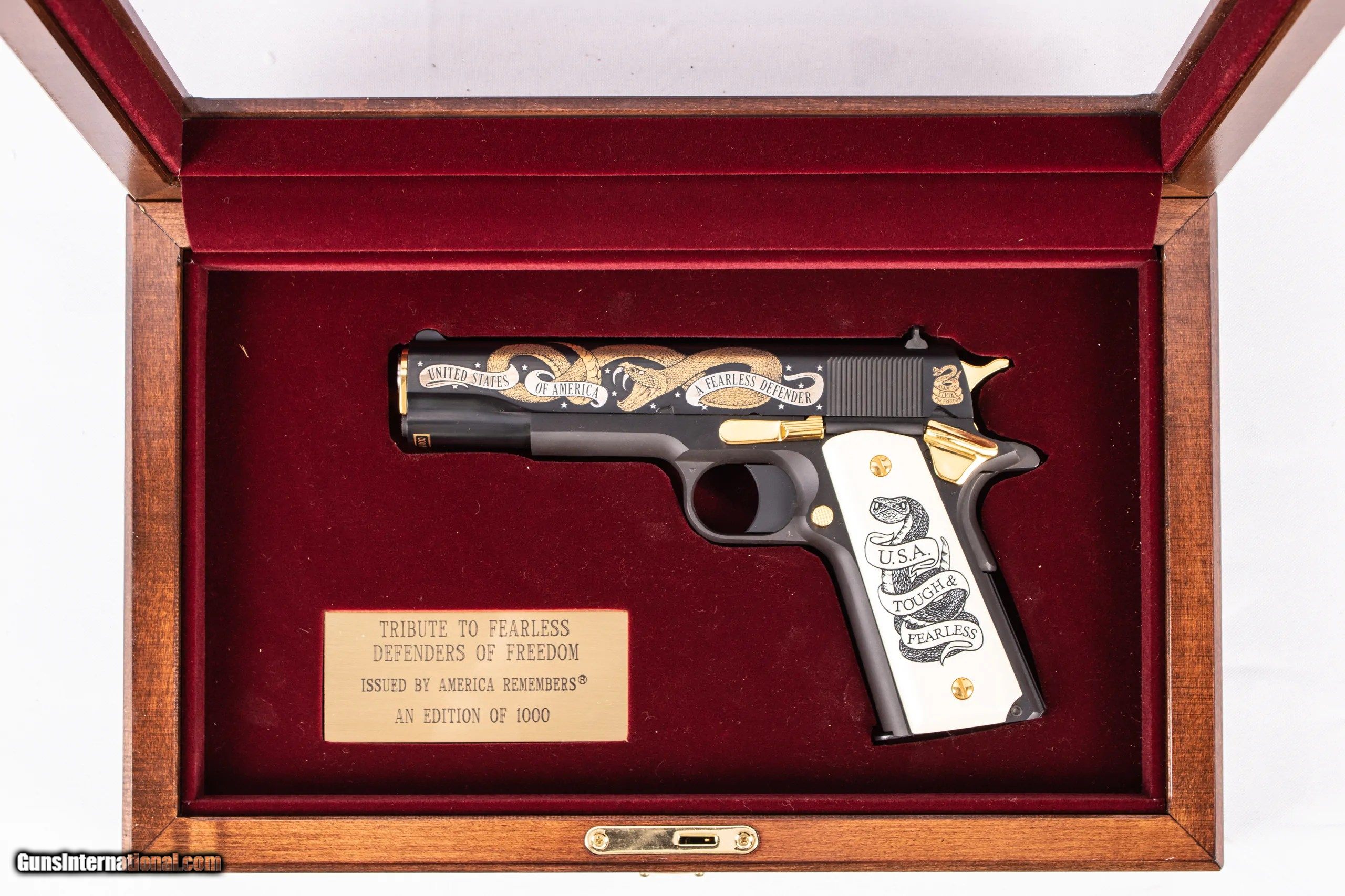 Description: *SUPER RARE 1911 #14 OF #1000 MADE* Colt Fearless Defender 1911 chambered in 45 ACP with 5 inch barrel, mirror shiny bore and sharp rifling. This firearm comes with presentation case, brass plaque, custom engraving, and gold inlay. The NRA grading condition for this USED firearm is Excellent. Dury's Lifetime Warranty: All firearms purchased from Dury’s Gun Shop, NEW or USED, are covered by a lifetime warranty. We will repair or replace, at our discretion, any firearm purchased from Dury’s Gun Shop, Inc. for as long as it is owned by the purchaser. This warranty is not transferable. WE BUY GUNS! NO COLLECTION TOO BIG OR SMALL FOR OUR GUNS INTERNATIONAL CUSTOMERS ALL OF OUR FIREARMS CAN BE PURCHASED DIRECTLY FROM OUR DURY'S GUNS ! SOLD Manufacturer: Colt Model: 1911 Caliber Info: 45 ACP Barrels: 5inches |