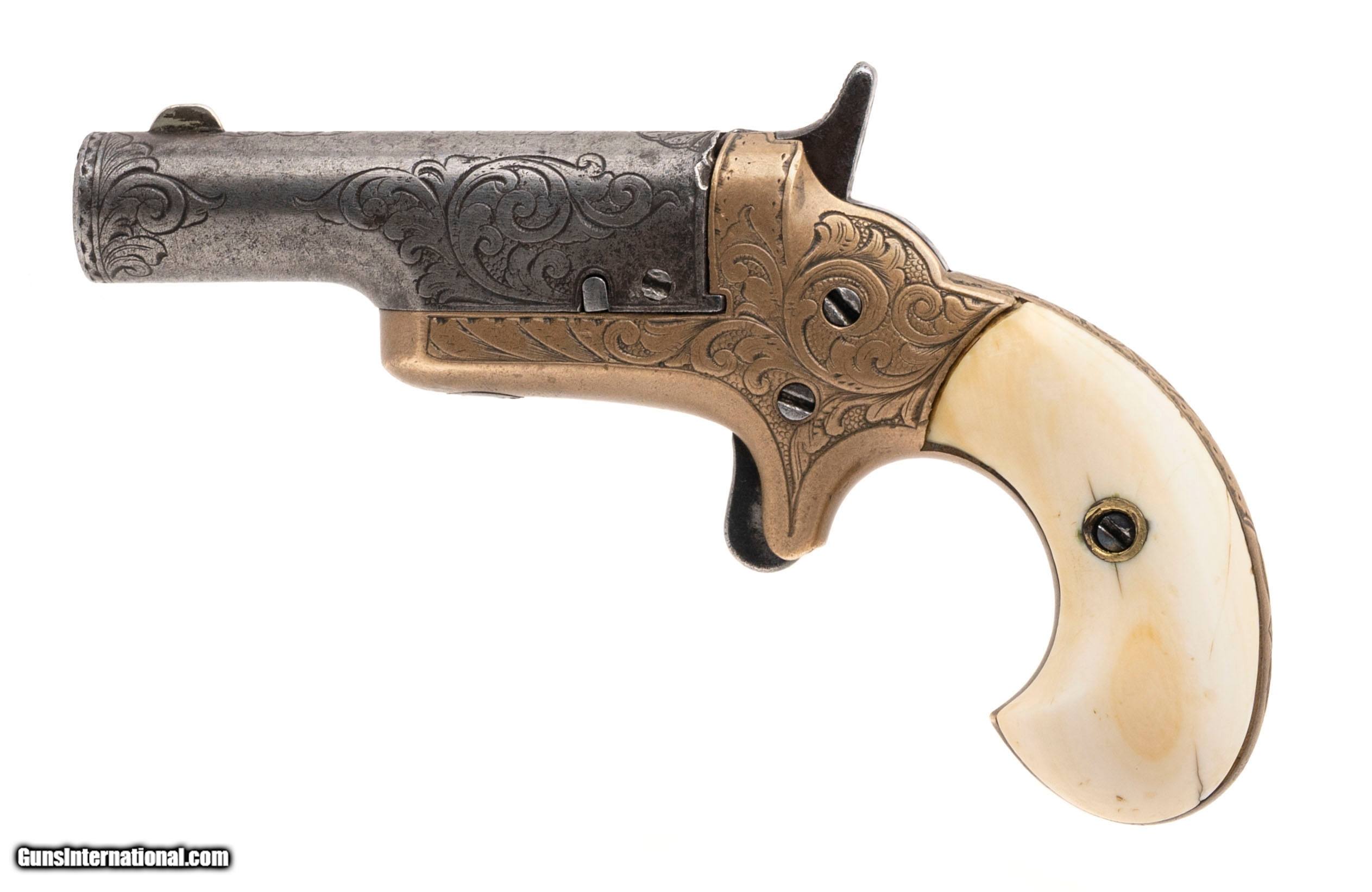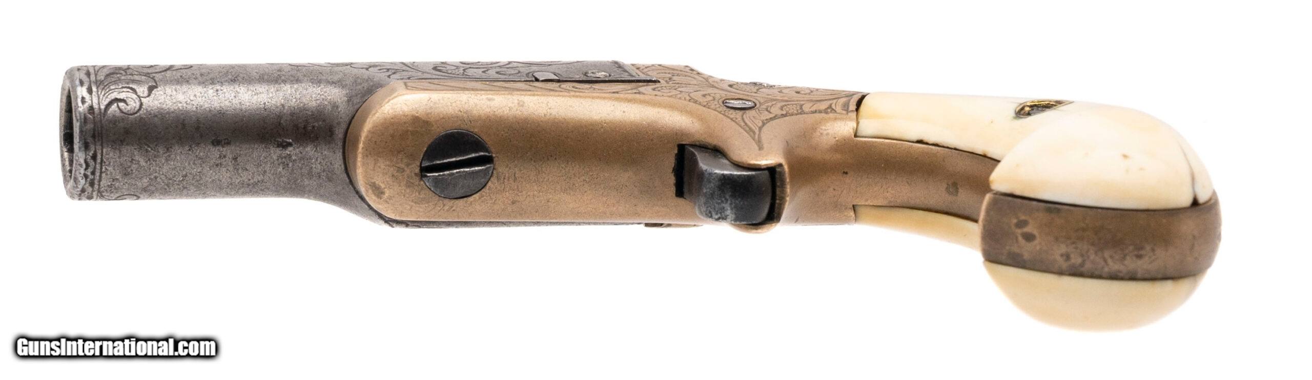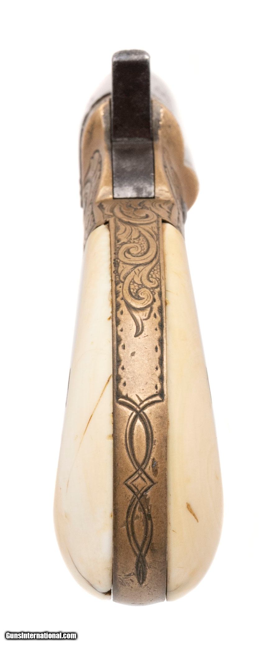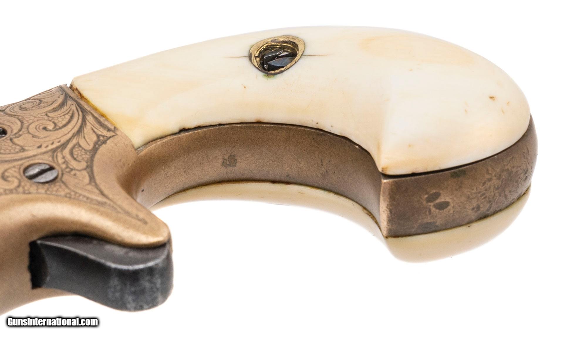 Description: "Made circa 1880s. Chambered for the .41 RF cartridge with a 2" barrel. This is a scarce factory engraved model. The metal has been cleaned, but the engraving is still reasonably sharp. This gun has factory ivory grips that are very good with one repair on the left hand side. This is a very handsome example of a 3rd model derringer. Price: $2,995.00 Contact Seller |