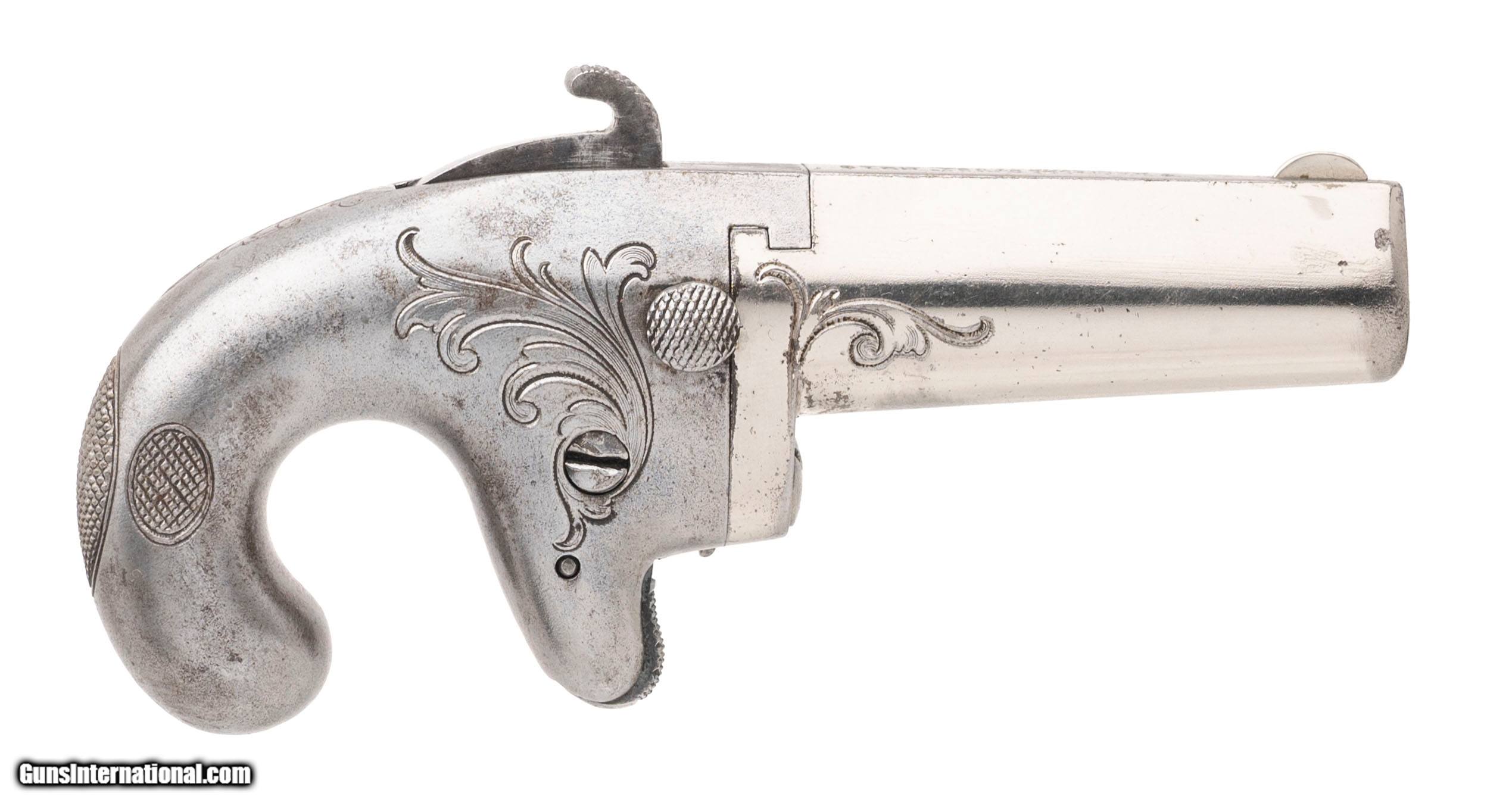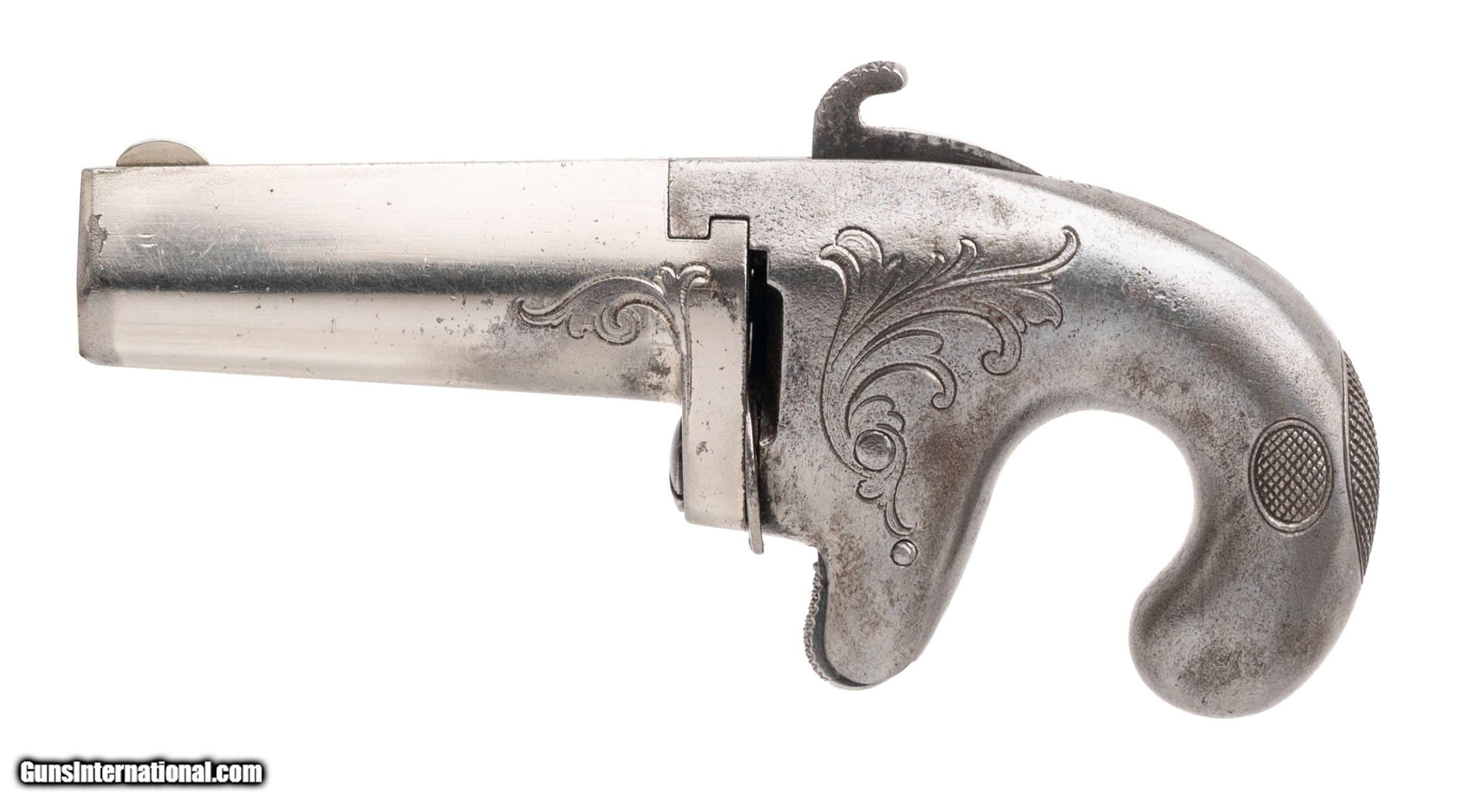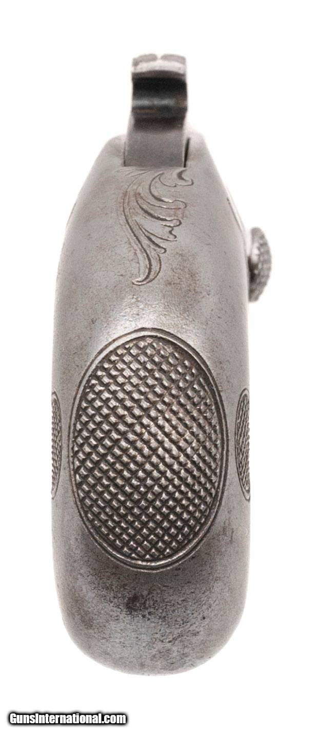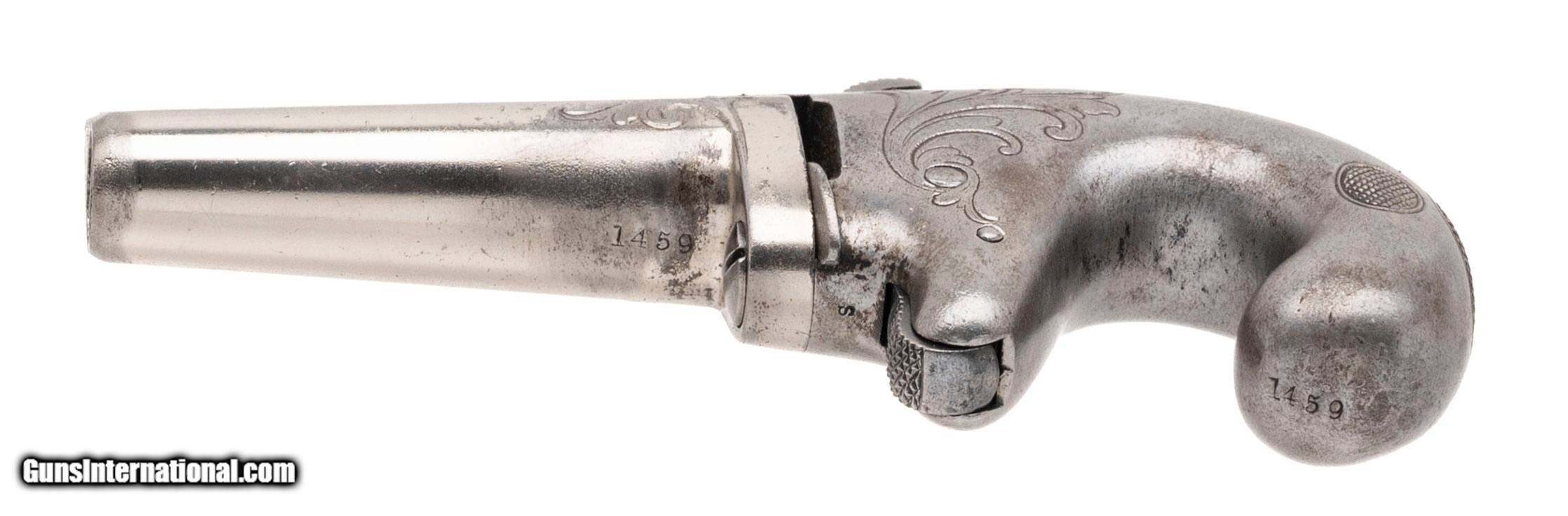 Description: "SN:1459. Made circa 1870's. 41RF caliber with a 2.5"" barrel. This is a very fine example of a 1st Model Derringeer. The barrel has been refinished, but is nice and sharp, and still retains all of the markings. The frame is very sharp as well and is cleaned metal, but the engraving remains sharp. Dallas Location. Price: $1,495.99 Contact Seller |