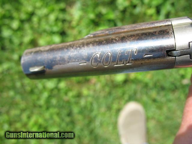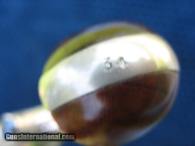 Description: SOLD.... REDUCED PRICE..Antique Colt Derringer #3 Thuer Model. British proofed on barrel. Standard 2 1/2” barrel and in .41 rim fire. S/N 48059 and all matching. I can't break the barrel screw lose from the frame but I can see the top of the 9 when the barrel is open so I am quite sure it is matching. Grips matching as well. Very nice little gun here with about 40% bright but thinning barrel blue on the top and right side of the barrel. Left side has been worn off from opening as is common on this model. Just a very small speak on the end of the right side at the muzzle and barely into the metal. The frame has all of the factory silver finish showing no wear exposing the bronze frame. Markings are excellent and has a number 34 on the butt ?? Sorry but I pulled the camera on this photo so it is a little blurry. ID number or who knows. Your guess on this. No dings on the top of the barrel from the firing pin hitting the barrel because of improper opening and closing on this gun. Most every one of these you see has the dings on the barrel even on minty guns. This one has never been abused. Screws still show bright blue on the heads and the ends. The mechanics are excellent with very tight like new lock up and perfect hammer notches. The bore is well above average on this one with very good rifling showing with some roughness see photos. The hammer still shows bright case colors on the sides of the firing pin and some on the rear of the hammer also but stating to fade a little on the rear. The grips are excellent as well with most all the original varnish and NO cracks or chips and numbered to the gun in pencil. Untouched front sight with no dings or abuse. This is a very nice little Colt Derringer and all though not minty, still a very nice example with British proofs for the collector of these very popular Derringers at a most reasonable price. Shop around and compare, then call me... I have sold a few of these with a bit more blue on the barrel for a little more $$ but never had one with this much silver on the frame. All original and never messed with. Call 765-728-8049 for any questions or more photos. $18 insured mail. SOLD Antique: Yes |