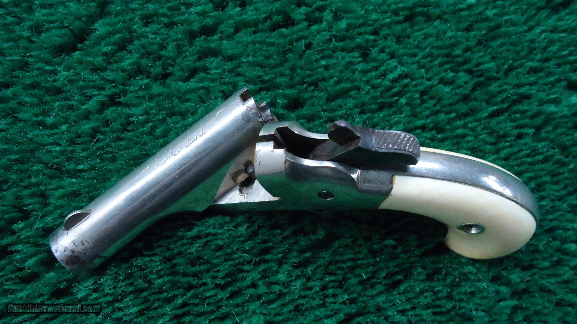 Description: 2-1/2 inch barrel chambered in 41 RF caliber. Overall gun is in very nice condition with about 95% bright shiny original nickel. Ivory grips. British Proof marks on bottom of the barrel. Fair bore that could benefit from a good cleaning. Good markings. Leroy Merz Antique Firearms specializes in antique and vintage Winchesters and other fine American firearms. Since 1965 Mr. Merz has taken part in the world of firearms and has been a contributor to many well known reference books. We have hundreds of additional guns in every price range at our home online. Search for Merz Antiques in google. SOLD Antique: Yes Handgun Caliber: .41 Rimfire |