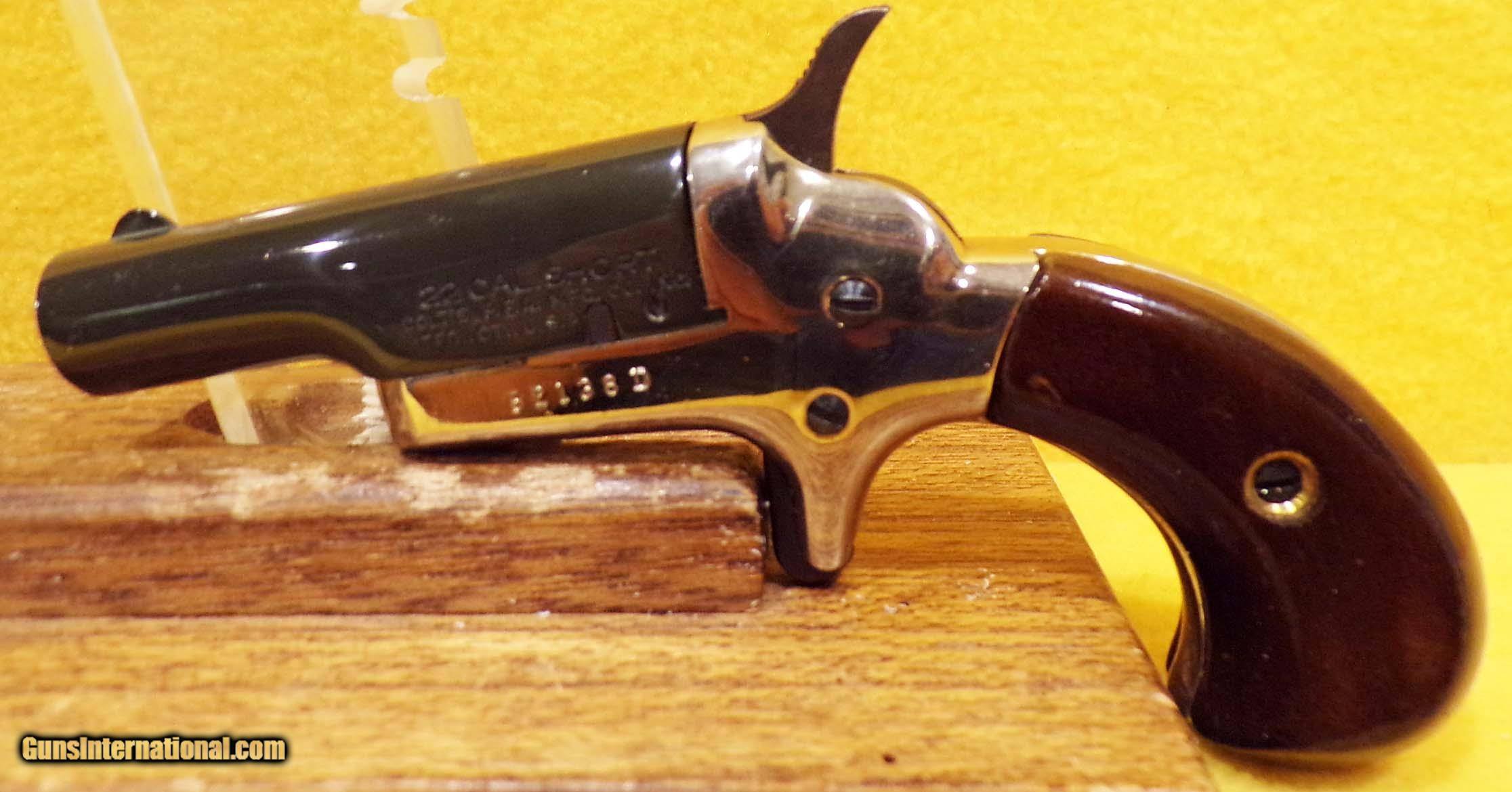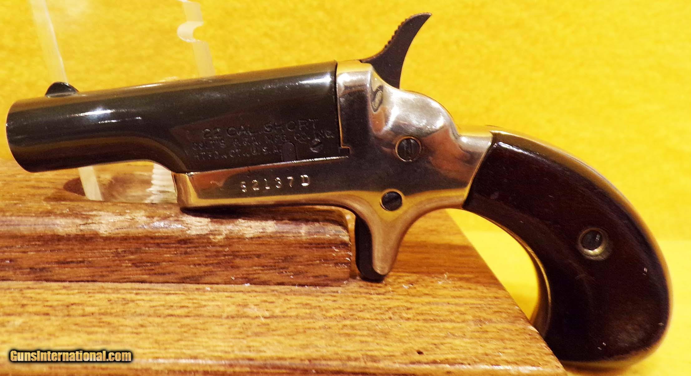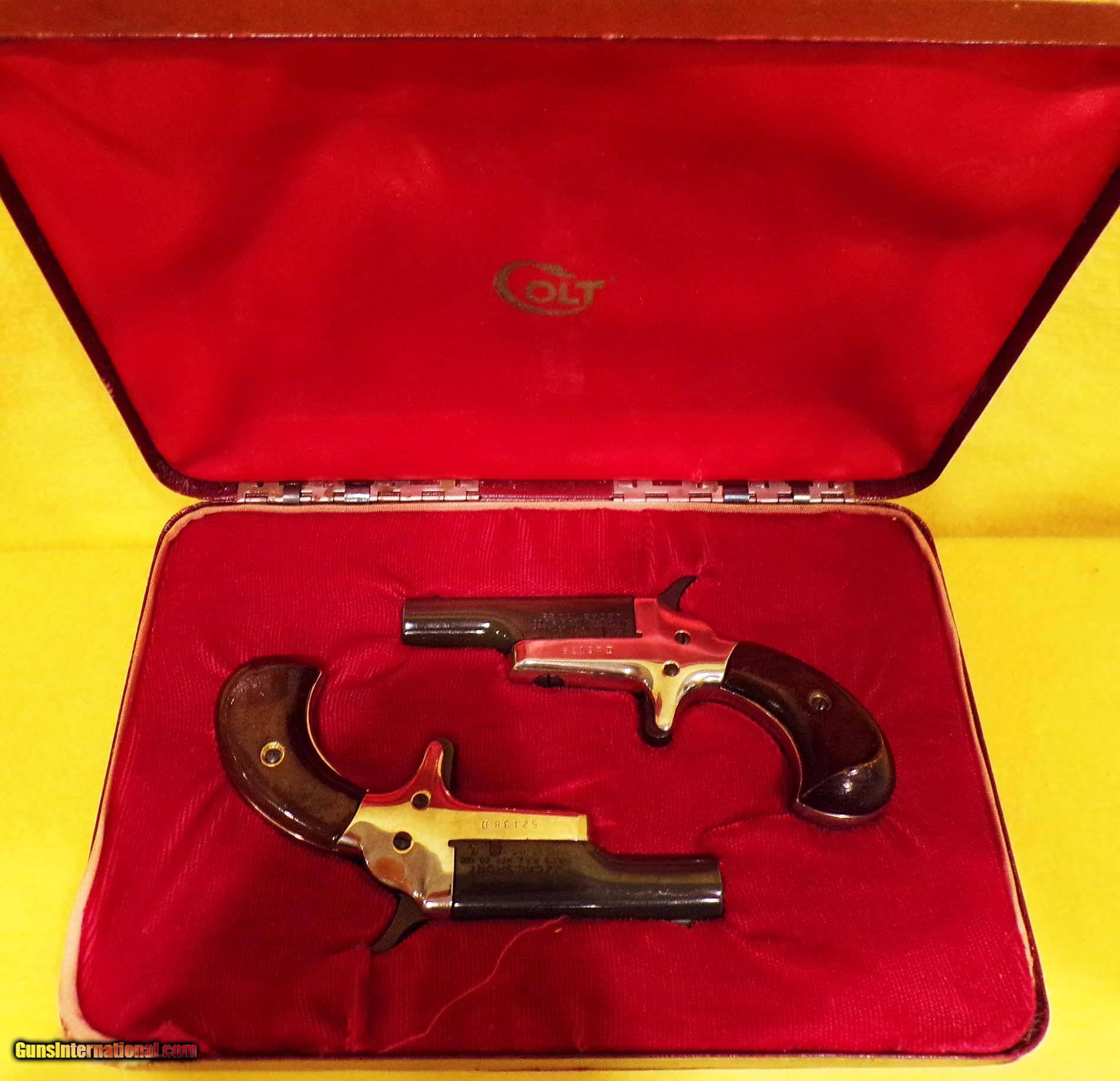 Description: COLT PAIR OF DERRINGERS IN .22 SHORT CAL., WITH 2 1/2" BARREL. COLOR BRASS/BLUE. CONDITION 95%+. SERIAL NUMBER 52138D/52137D. COLT MODEL PAIR OF CONSECUTIVE SERIAL NUMBERED .22 CALIBER SHORT DERRINGERS, MIRROR BORES, GRIPS EXCELLENT, 97% CONDITION ON THE FIREARMS WITH VERY GOOD CONDITION ON THE CASE SO 95%+ OVERALL CONDITION, OUR STOCK # D1549 SOLD |