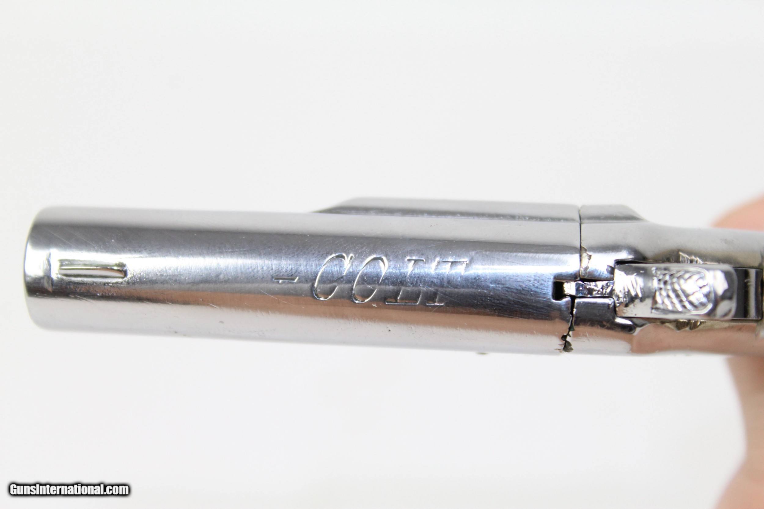 Description: COLT Third Model “Thuer” Single Shot Derringer 19 & 20th Cent HIDEOUT Self-Defense Pocket Pistol Here we present a Colt Third Model Thuer Deringer, also known as the New Model Deringer, made circa 1905. In 1870 Colt’s purchased National Arms Company and began producing a Deringer pistol based on its design. This became Colt’s First Model Deringer and it was Colt’s first single shot pistol. It was followed in quick succession by a very similar pistol, called Colt’s Second Model Deringer. Both of these pistols were chambered for .41 rimfire and featured a barrel that rotated counter-clockwise for loading and unloading. In the same year, a Colt employee, F. Alexander Thuer, patented an altogether different design. His Deringer had a barrel that pivoted to the right on a vertical axis for loading and unloading. Instead of using a manually operated latch to open, his used a very positive, spring-loaded catch and detent that did not require anything but a firm twist of the barrel. This spring-loaded catch also acted as an automatic ejector, which was very handy for a single shot self-defense pistol. These were sold alongside the other two models as the Third Model Deringer, but are now known to many as the Thuer Model. The Thuer was far and away the most successful of the three. These were very refined, very handy conceal and carry pieces all the way through 1912, when semi-automatic firearms took the lion’s share of the market. The top of the barrel is marked “-COLT-”. The left side of the frame is marked “41 CAL”. This one features a brass frame and both the barrel and frame are silver plated. The overall condition is near fine. This pistol has been re-plated and the finish is nearly complete. The markings are clear and legible. The walnut grips are in great shape. The bore is clean with good rifling. The action on this pistol is excellent. This firearm is classified as a Curio & Relic. Barrel is 2-1/2 inches. Caliber: .41 Rimfire Overall condition as seen in photos. Very Fast. Very Safe. FREE SHIPPING. Will need to be sent to your local FFL or C&R licensee. This firearm is classified as a Curio & Relic. Guaranteed AUTHENTIC & Includes CERTIFICATE OF AUTHENTICITY. ancestryguns $550 #7087 SOLD Curio/Relic: Yes |