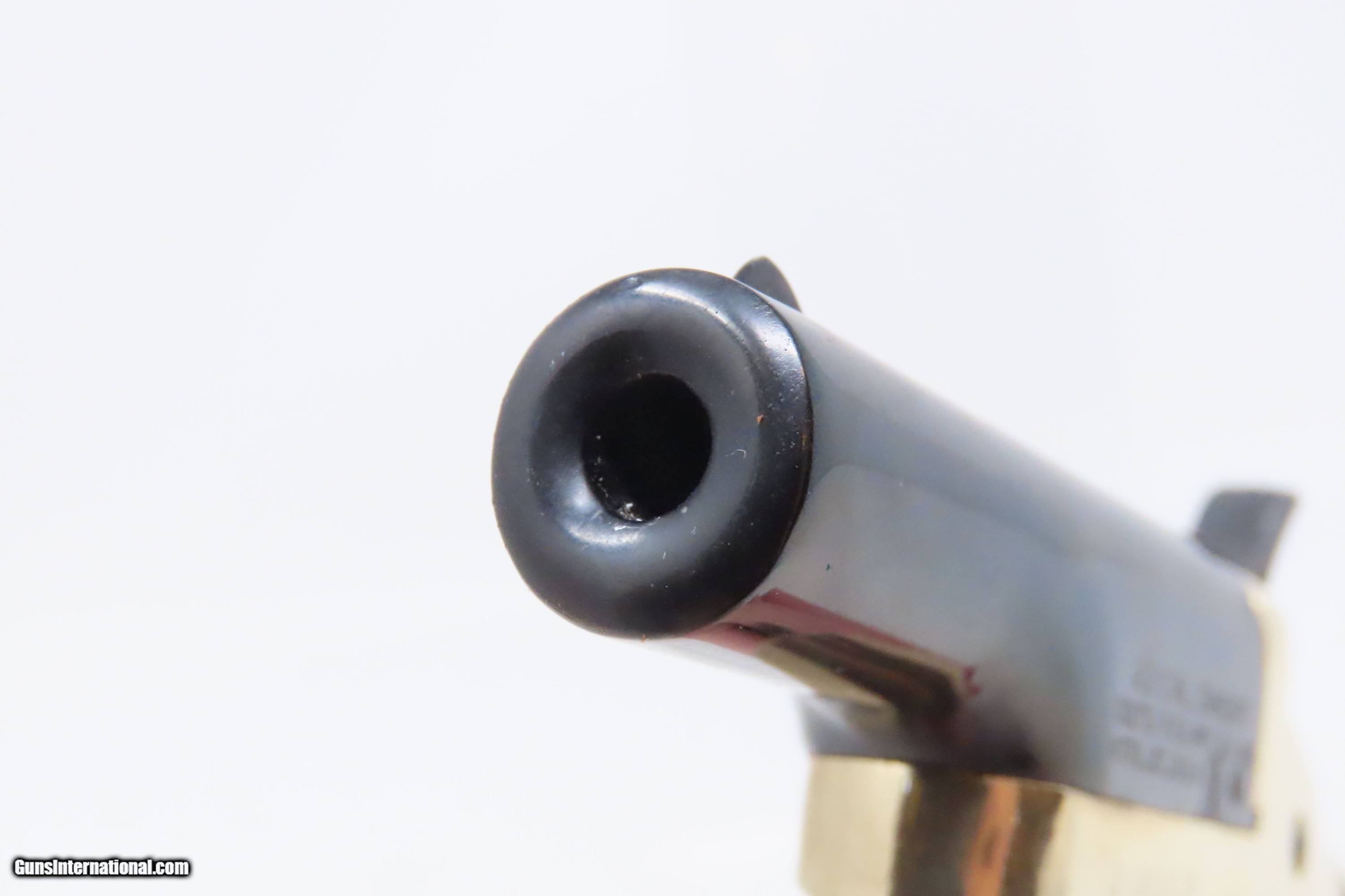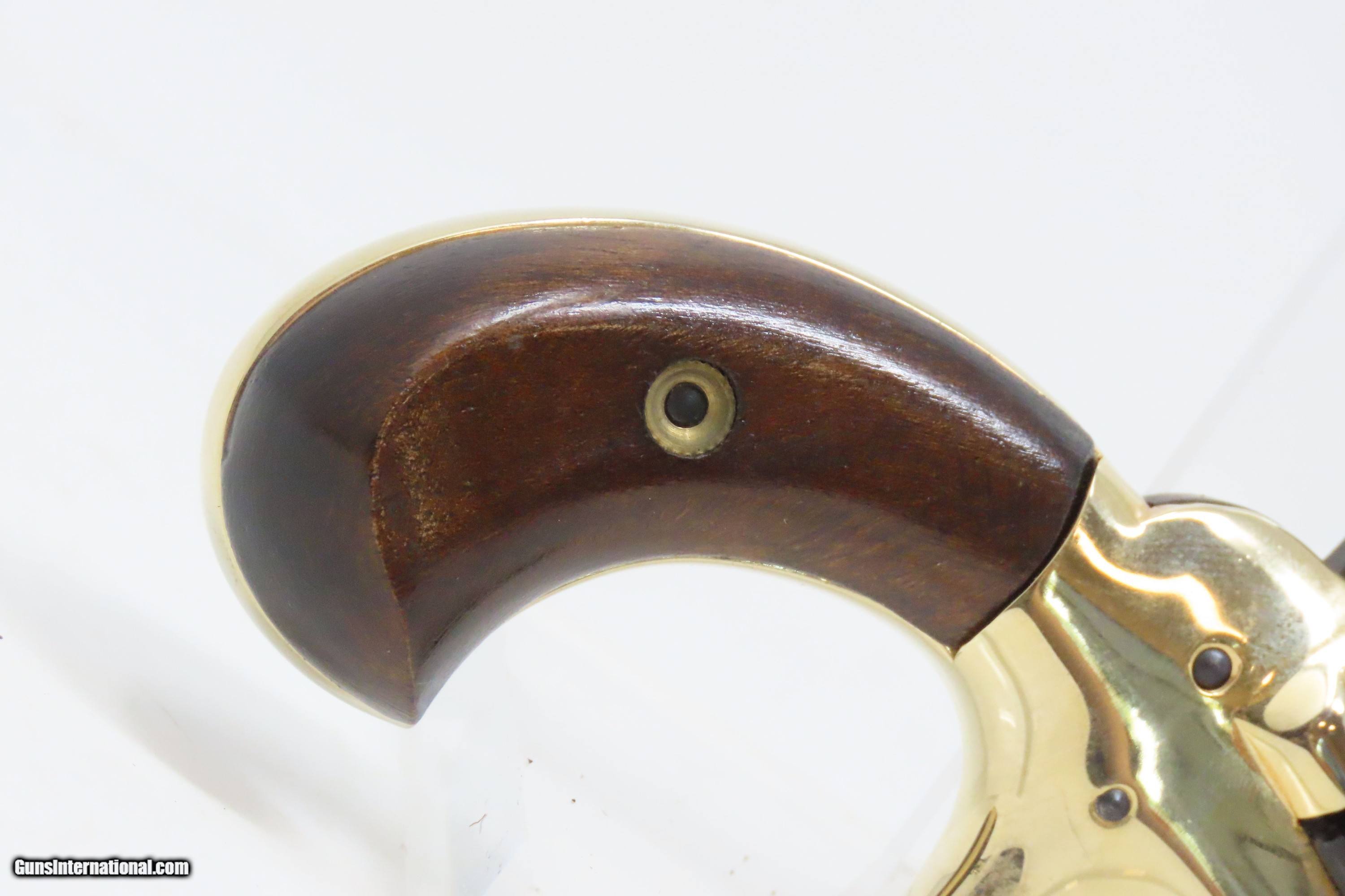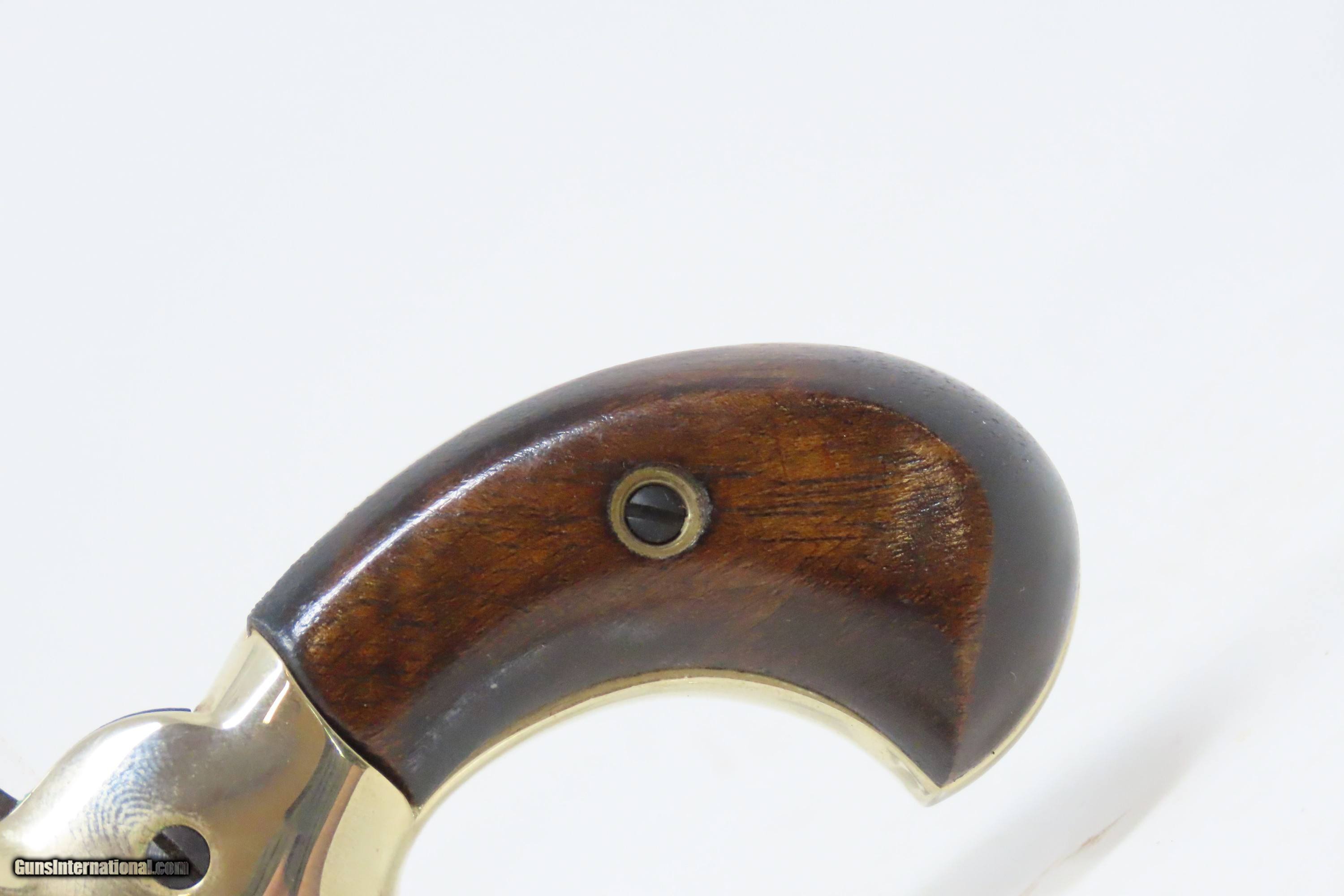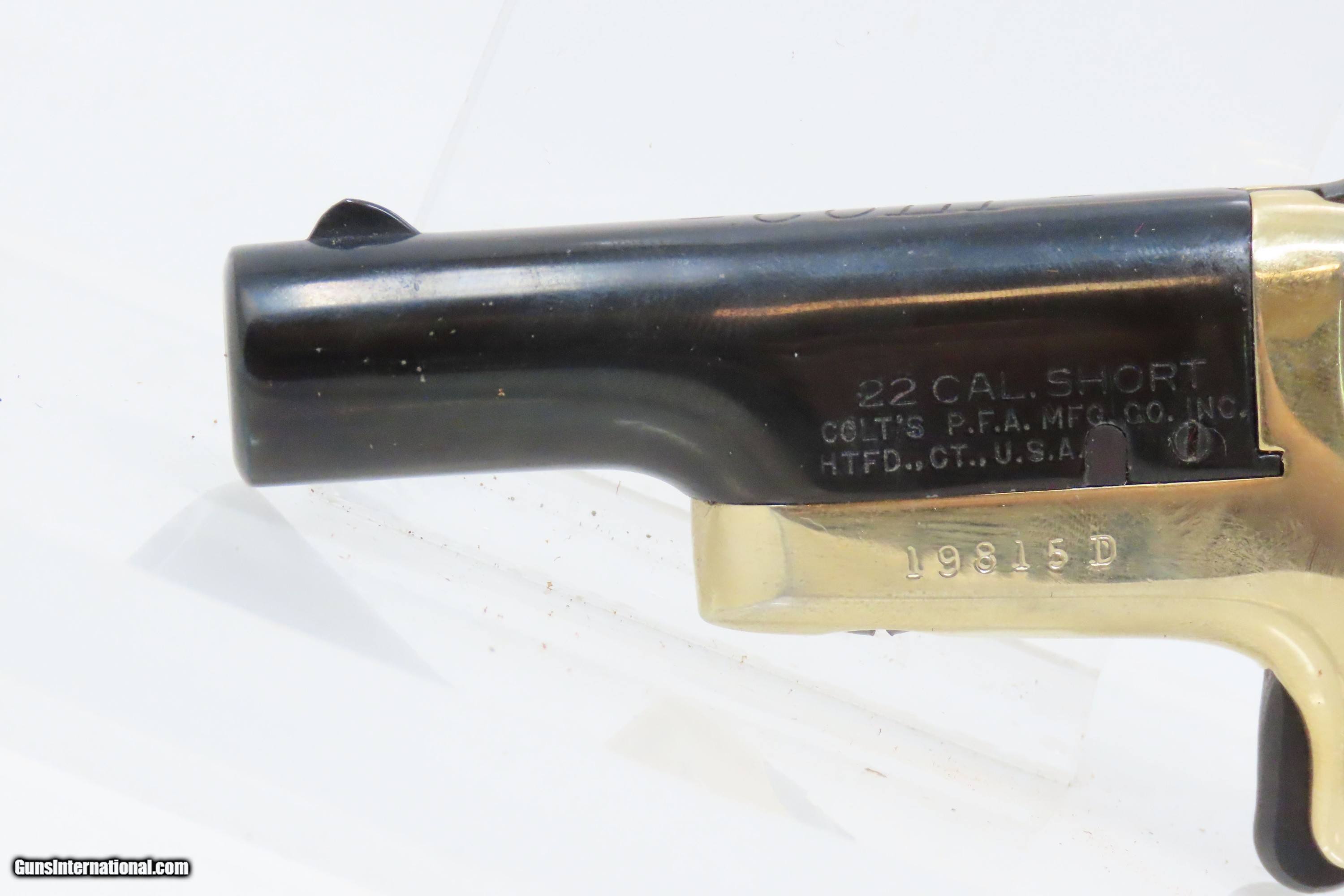 Description: FACTORY CASED Matched Set of COLT Fourth Model .22 Short Modern DERINGERS CONSECUTIVELY NUMBERED “19814D & 19815D” Here we present a Modern Cased Matched Set of Colt Fourth Model Deringers made in the early to mid-1970s in Hartford, Connecticut. These Colt Fourth Model Deringers are designed to mimic the Thuer-designed models. Though, Colt actually didn’t make these pistols. Their name may grace the top of the barrels, and they were made in New Haven, Connecticut, but they weren’t true Colts. A company called Butler produced these pistols for Colt. Butler would later go on to produce these revolvers under their own name after Colt stopped offering them. Sometimes they were sold as pairs, as is this set, and even in fours with sequential serial numbers in velvet lined wooden boxes. These made great displays that were also functional and capable. The first series was made from 1959 to 1963, and over 110,000 guns were produced. A second series, as are these pistols, ran from 1970 to 1973, with 25,000 more produced. These examples were made in the second series according to the D suffix at the end of the serial number. Loading requires the gun to be half-cocked, then the barrel pivots sideways to open the chamber. Load your single little .22 Short cartridge and pivot the barrel back in place. To fire the weapon, you fully cock the hammer and pull the small spur of a trigger. The overall condition of both examples is excellent. Robust action. Bright bores. Fine grips. Sharp markings. The included case is very good. This firearm is classified as Modern. Barrels are 2-1/2 inches. Caliber: .22 Short Rimfire Overall condition as seen in photos. Very Fast. Very Safe. FREE SHIPPING. Will need to be sent to your local FFL. This firearm is classified as Modern. Guaranteed AUTHENTIC & Includes CERTIFICATE OF AUTHENTICITY. ancestryguns $1200 #230429 SOLD Curio/Relic: Yes |