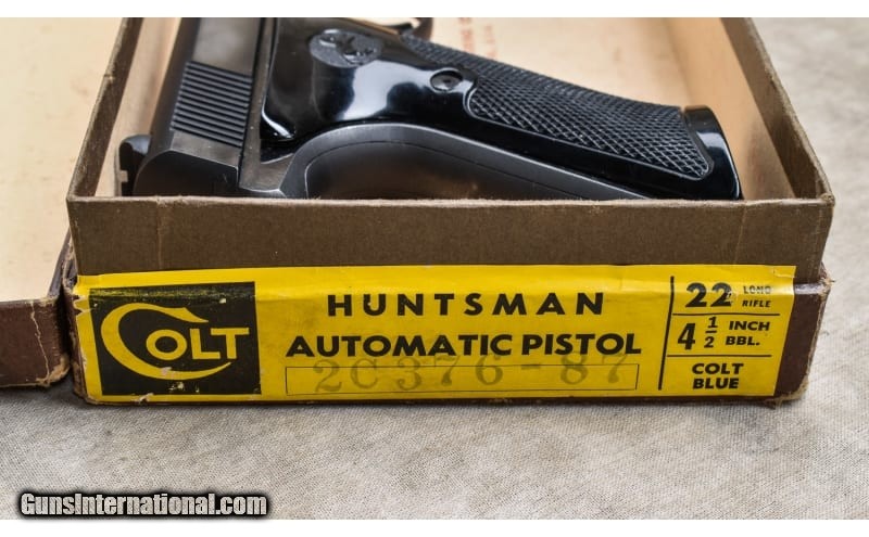 Description: This Colt Model Huntsman Semi-Automatic Pistol, chambered in .22 Long Rifle is in overall good to very good condition. This exceptional firearm is designed for precision, reliability, and effortless shooting, making it a standout choice for enthusiasts and collectors alike. The semi-automatic action provides reliable cycling with minimal recoil, offering a smooth and enjoyable shooting experience for all skill levels. Colt's legacy of excellence in firearm manufacturing is embodied in the Huntsman, combining classic aesthetics with modern functionality. .22 Long Rifle SOLD Chambers: 10 Round detachable magazine. Metal Condition: Very good with some handle marks and wear near the muzzle. See photos for detail. Wood Condition: Good with moderate handle marks. See photos for detail. Bore Condition: Shiny with good rifling. Barrels: 4.5 Inches. Triggers: Factory single action. Butt Pad: Black checkered synthetic. Weight: 29oz Sights: Front blade with rear fixed notch. Item Location: Rogers |
