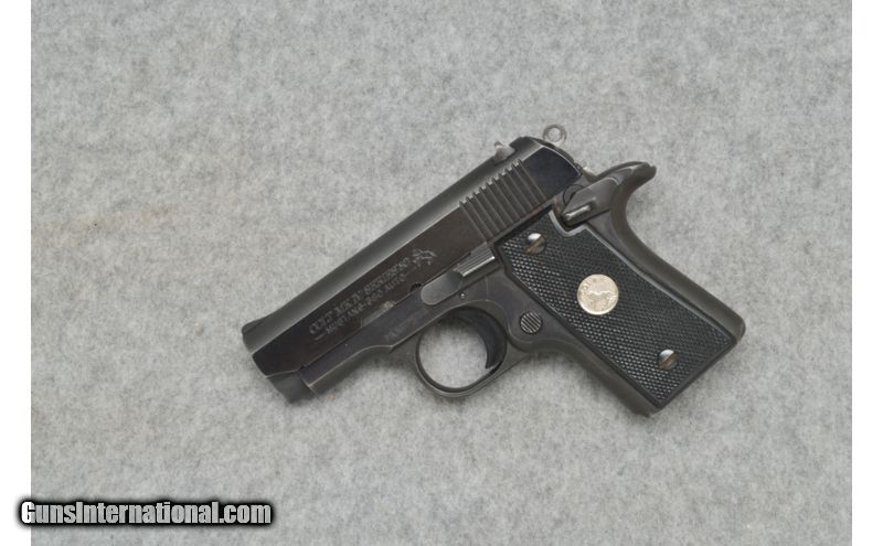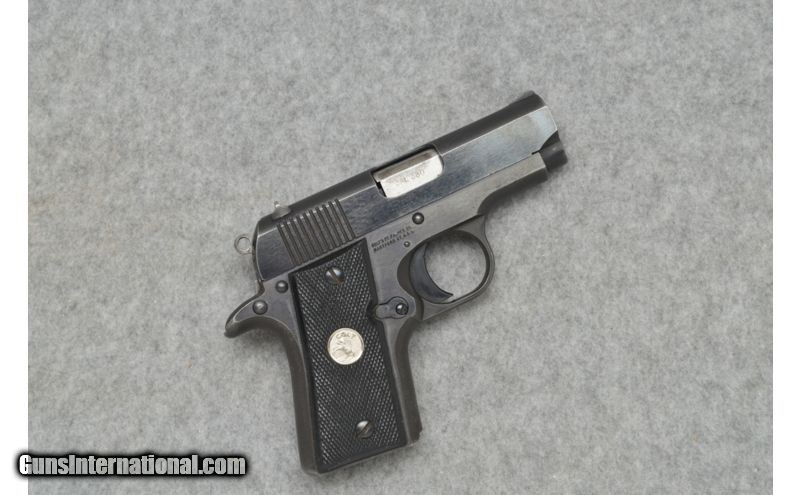 Description: Used. Includes 1 Magazine. SOLD Caliber Info: .380 ACP Metal Condition: Very Good; Light marks and scratches from use Bore Condition: Very Good to Excellent, some wear but retains nice rifiling Barrels: 2 5/8 Triggers: Grooved, Blued Stock: Grips are Checkered Black Plastic With Colt Medallion Weight: 18 oz. Sights: Front: Square Blade Rear: Square Notch Extras: Includes 1 Magazine Item Location: Rogers, AR |