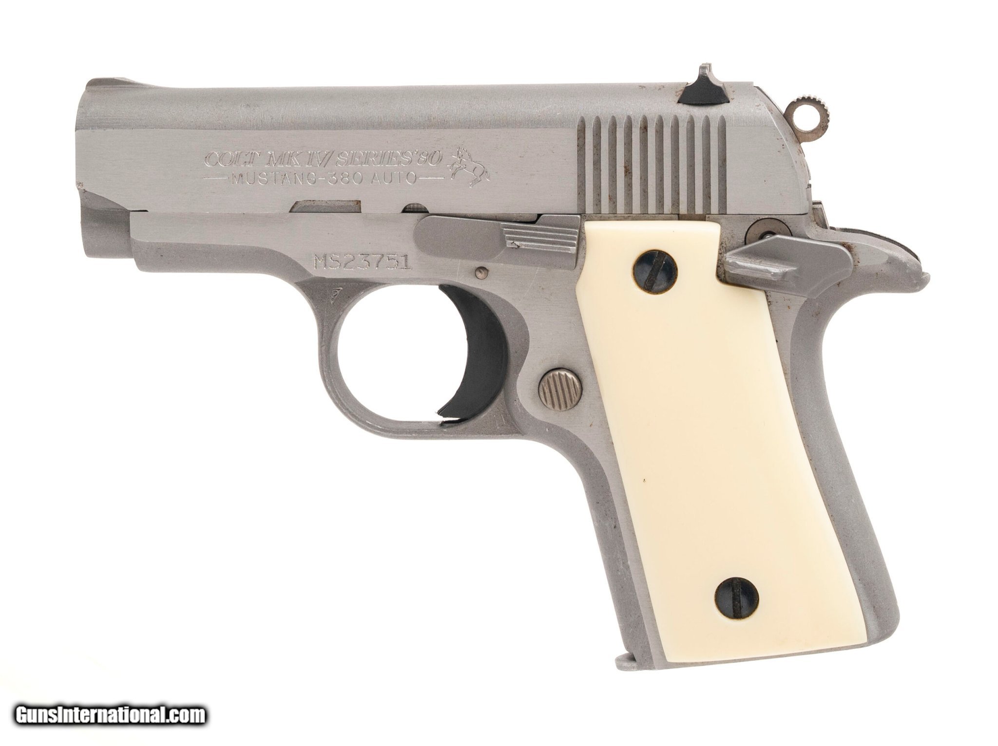 Description: Guns Listing ID: 530852 SN: MS23751. Made in 1997, .380 ACP with a 2.75\" barrel. Stainless steel pocket pistol with fancy faux ivory grips. Very good condition. (C20898) SOLD Manufacturer: COLT Model: MUSTANG POCKET Caliber Info: .380 ACP Condition: Used - Non-Certified Barrels: 2.75 Action: SEMI AUTOMATIC Finish: stainless steel |