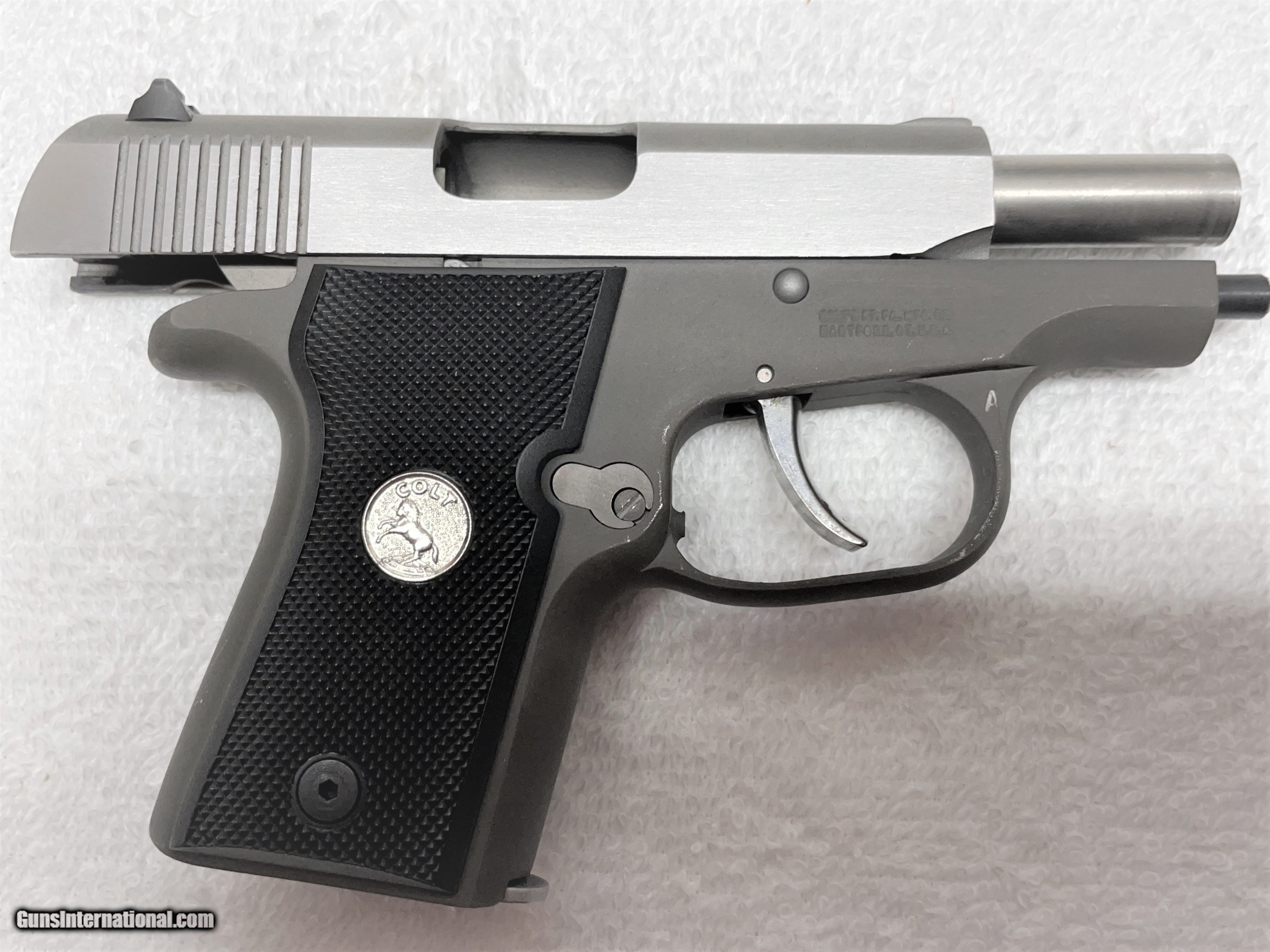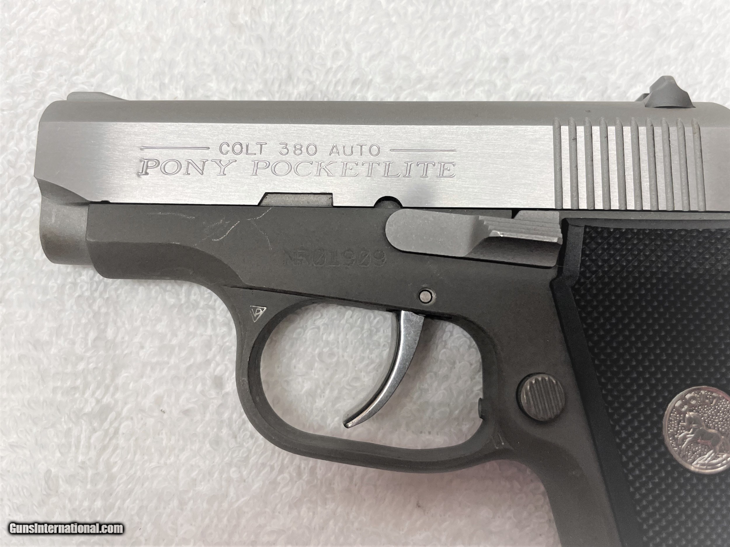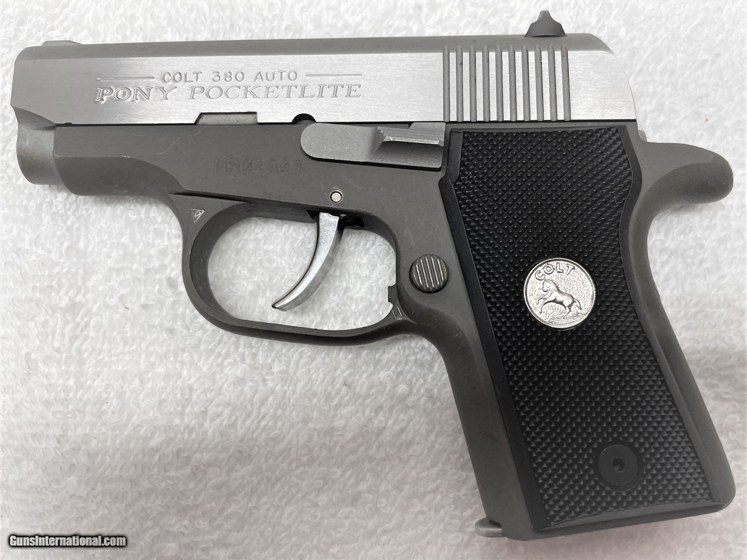 Description: Colt Pony Pocket Lite 380ACP., Stainless. 2 1/2" barrel, Excel Bore. Original mag. 98% Condition. Made in 1997. S/N NR0190X SOLD |