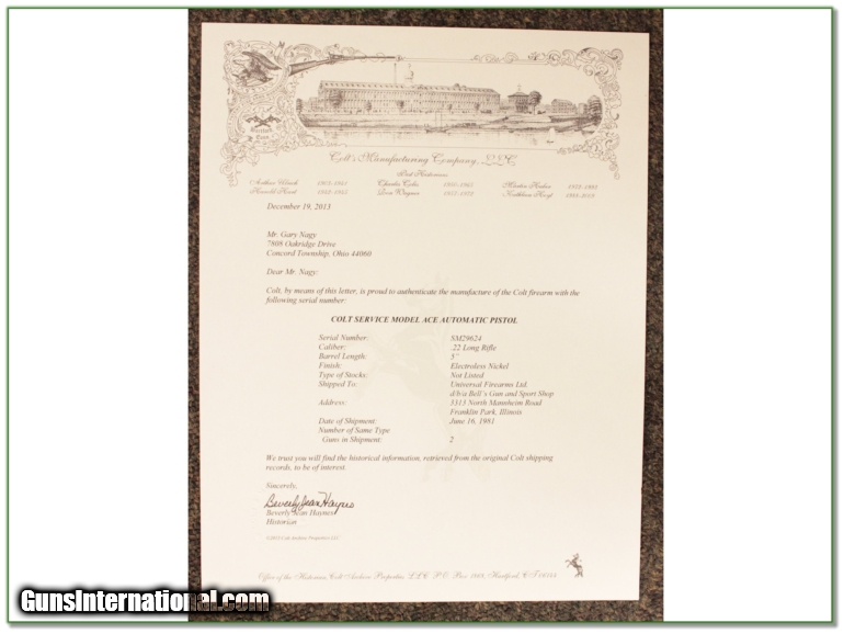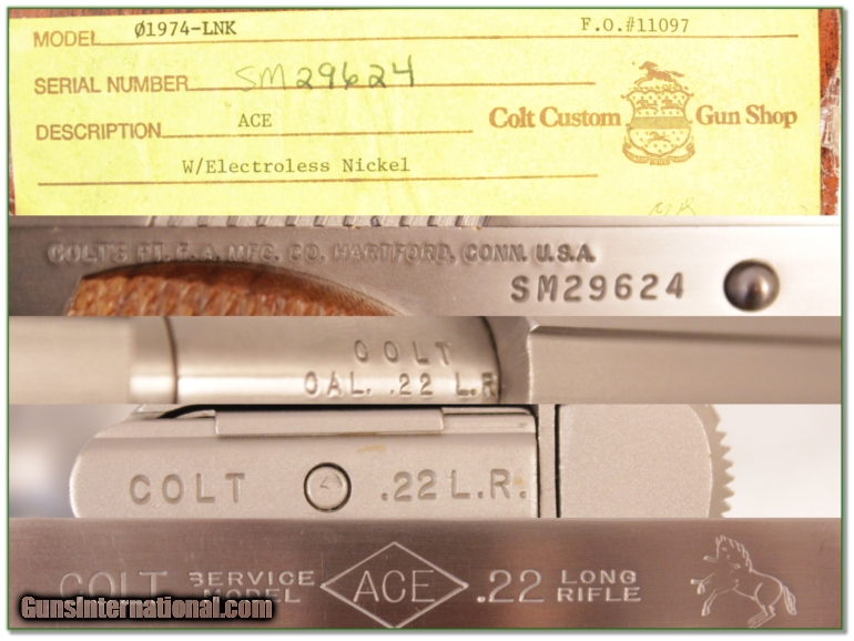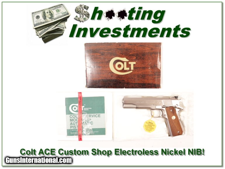 Description: Collectors, this is a Custom Shop 1911 ACE. It is new, unfired in original box with letter from Colt. It was made in Colt’s Custom Shop in 1981. It is a rare ACE in electrolysis nickel plating. It will make a prized addition to any Colt collection and is sure to increase in value over time. I am selling this one on consignment and as such lay-a-way can’t be used. It does of course have the standard 3 day inspection. Shipping and insurance is $30. Please email me with any questions or larger pictures. (I now consign quality firearms only 10%! Let me know if you have any you would like to sell!) [14-0675] Terms & Conditions Payment: Payment is by Money Order, Cashiers Check or Personal Check. I can now also accept MasterCard and Visa with a 3% convenience fee. PayPal can be used for some items but never firearms. Please let us know if you would like to pay via PayPal. Shipping: The shipping charge will be listed in each description. It is $30 for most guns. Some heavy guns or those insured for over $2000 may be higher. Shipments to Alaska and Hawaii are higher because air shipment is required. Most firearms are shipped within 5 days of receipt of payment. We prefer shipping at the beginning of the week to avoid firearms in transit over weekends. We package all shipments carefully and insure them for the full purchase price, rounded up to the next $100. In the unlikely event that damage occurs, it is important that you save all packaging material for the claims process. Optics are shipped Priority Mail and most other non-firearm shipments are shipped First Class. Returns: Our return policy is simple. If for any reason you are not pleased with your purchase, you may return your item for a refund. The only exception is ammunition, it cannot be returned. It is important to us that you are happy. Guns cannot be fired or dissembled before returning them and must be returned in the same condition as received. Notification of a return must occur with-in 3 days of receipt at your dealer. Shipping, convenience and dealer fees are not refundable and are the responsibility of the buyer. Lay-a-way: If needed, we offer a 60 day lay-a-way option on most firearms. It is 1/3 now, 1/3 in 30 days and 1/3 in 60 days. Lay-a-way firearm sales are final. Consigning your firearms with Shooting Investments: We will help you get top dollar for your firearms. While most local guns shops charge 20% or more, our fee is only 10% with a minimum of $50. At your local gun shop it might take months to sell. Selling on-line provides instant access to thousands of interested buyers. You won’t find any other on-line dealer willing to sell your firearms for only 10% or listing every gun on 4 separate s. Selling through an House typically costs 15% and you have to wait several months to sell and longer to receive funds. If properly priced, we will sell your firearms in a week or two. Send us an email or give us a call and we’ll explain how easy it is for you to get top dollar. Trading: We collect guns and usually just trade for guns we want to add to our collections. We often sell guns for others wanting to purchase one of ours. We find this the most fair to both of us. Our Commission is only 10% and we hold the gun you want until yours sells. Please contact us if you want to sell one of yours to buy one of ours. Help for California Buyers: We are happy to ship to California. It is the buyer’s responsibility to make sure any item you buy is legal in your state. We are also happy to help with your purchase of a firearm from someone other than us. If you see a gun you would like to buy but the seller can’t or won’t ship to California we can help. You buy the gun and have it shipped to us. We’ll then ship it to your California dealer. The cost for this service is only $30 + shipping. Let me know if we can help! SOLD |