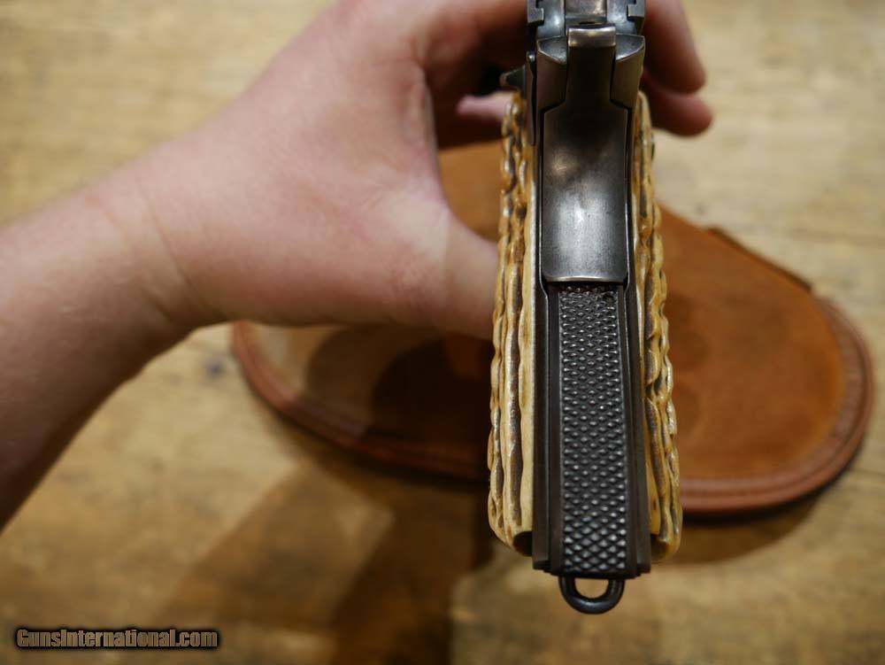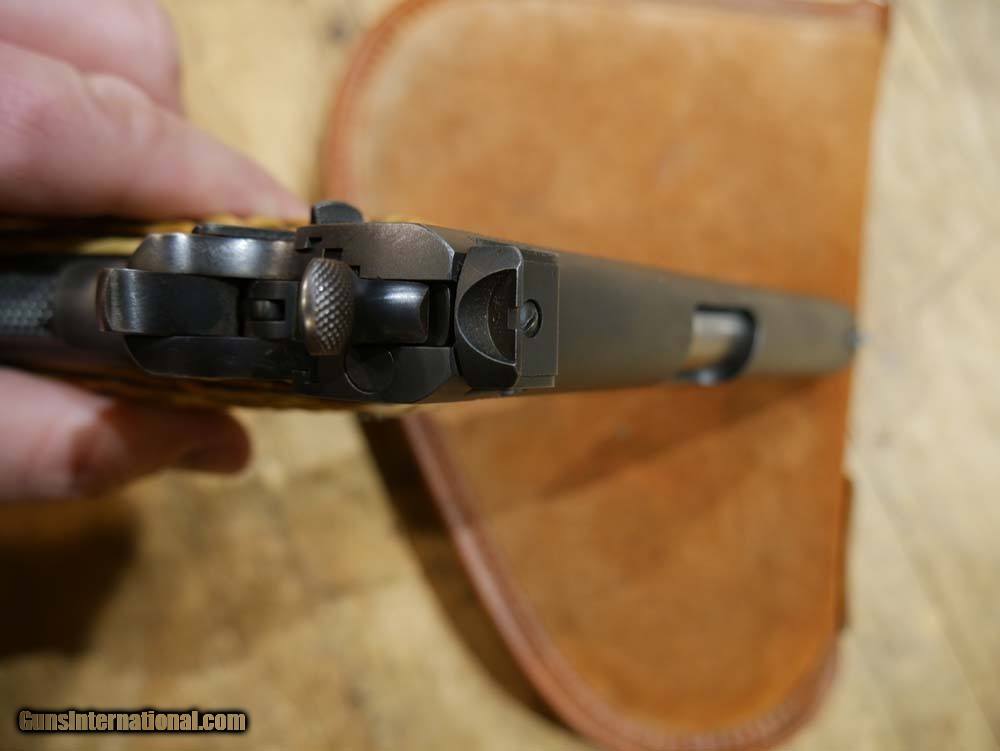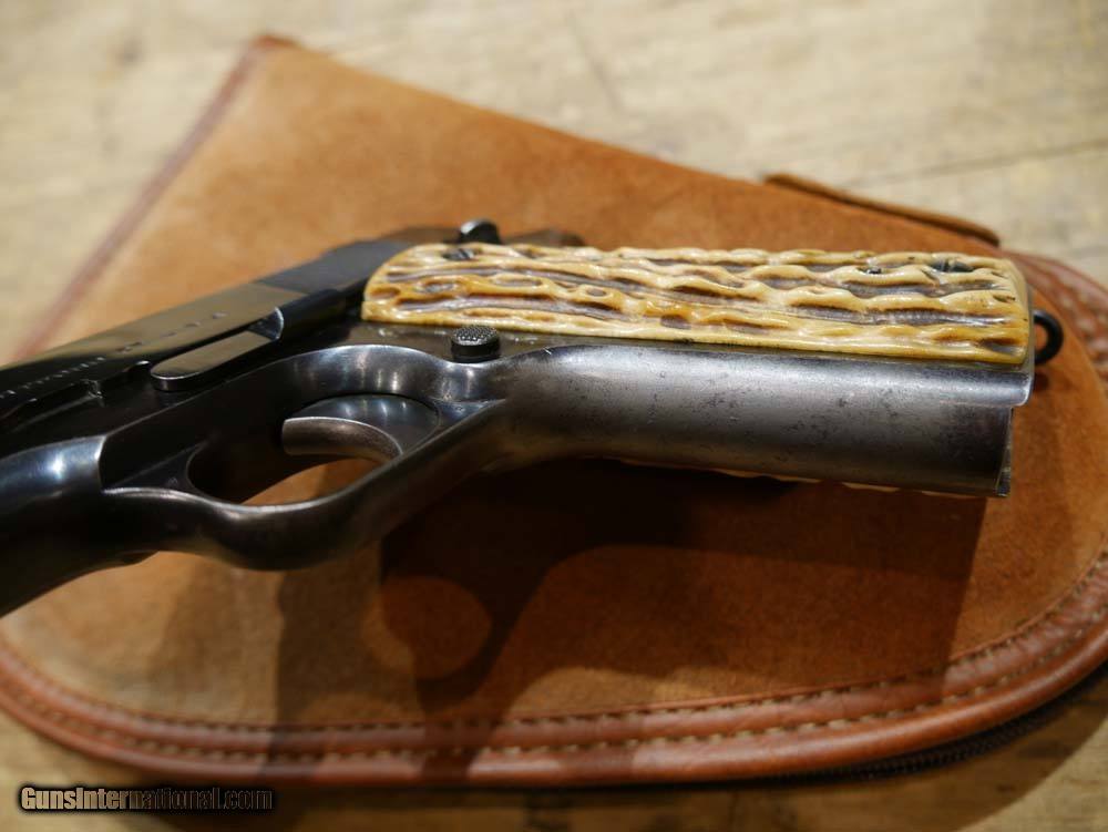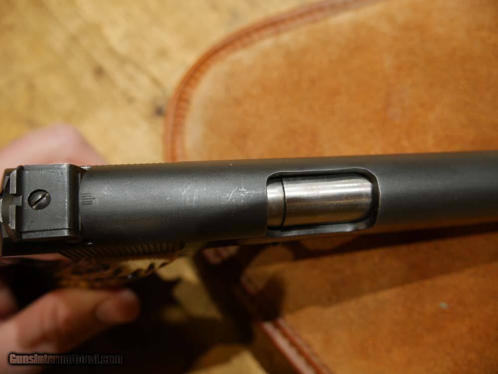 Description: Colt 1911 Commercial Frame w/ .22LR Conversion Kit. 1911 Goverment frame with C serial number placing it's DOM in 1915. Post-WWII .22LR Conversion Unit, not marked ACE, not serialized. Steven's adjustable rear target sight. Floating-chamber with short-stroke gas piston operating system which causes an enhanced, heavier recoil to more closely simulate the feel of the .45ACP chambered 1911's. The grips look like bone carved to look like antler. Comes with 1 10-rd magazine, likely original to the conversion unit. This is a wild old-school 1911 build! The conversion unit is in excellent shape, strong bluing with a few light scratches, especially toward the muzzle. See pics for all details. Bore is shiny and the system is very accurate. Enhanced recoil is definitely noticeable. The frame is in amazing shape for being over 100 years old. Bluing wear along the front strap and beavertail. Light scratching and very light pitting in a few places. Again see pics for details, if you need more pics please ask. Please call or email with any questions. Must ship to FFL. ***$40 SHIPPING AND INSURANCE*** ***NO CREDIT CARD FEES*** ***NO WARRANTIES IMPLIED OR EXPRESSED*** SOLD Manufacturer: COLT'S MFG CO. Model: 1911 Frame w/ .22LR Conversion Kit Caliber Info: .22LR Condition: USED, VERY GOOD |