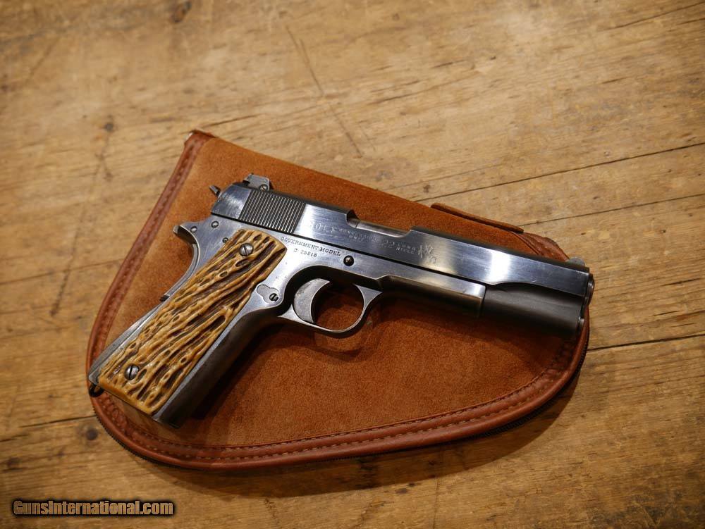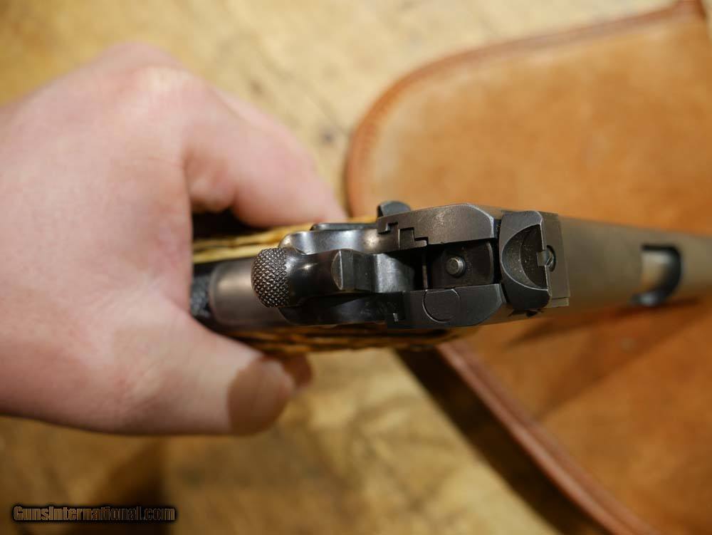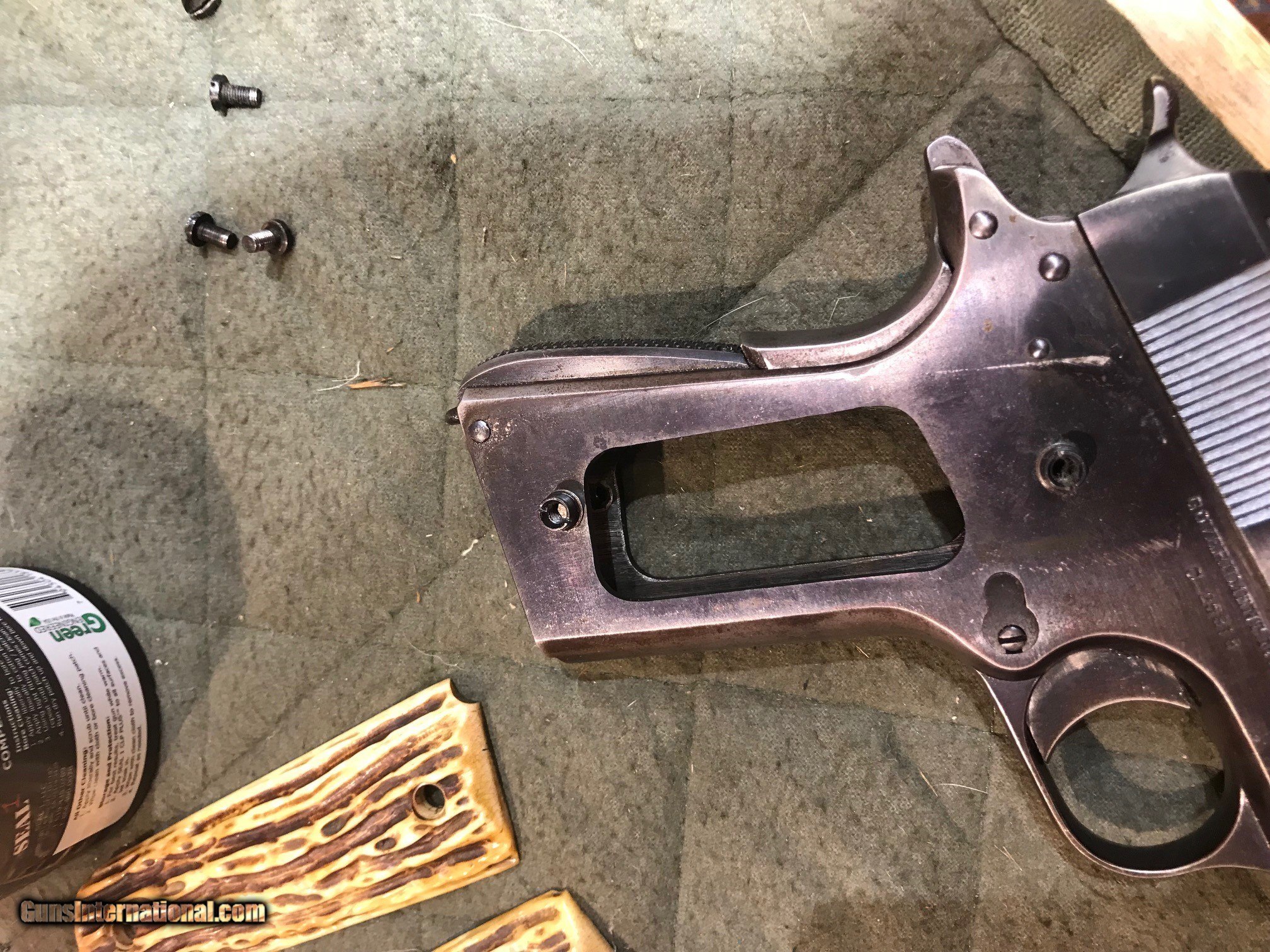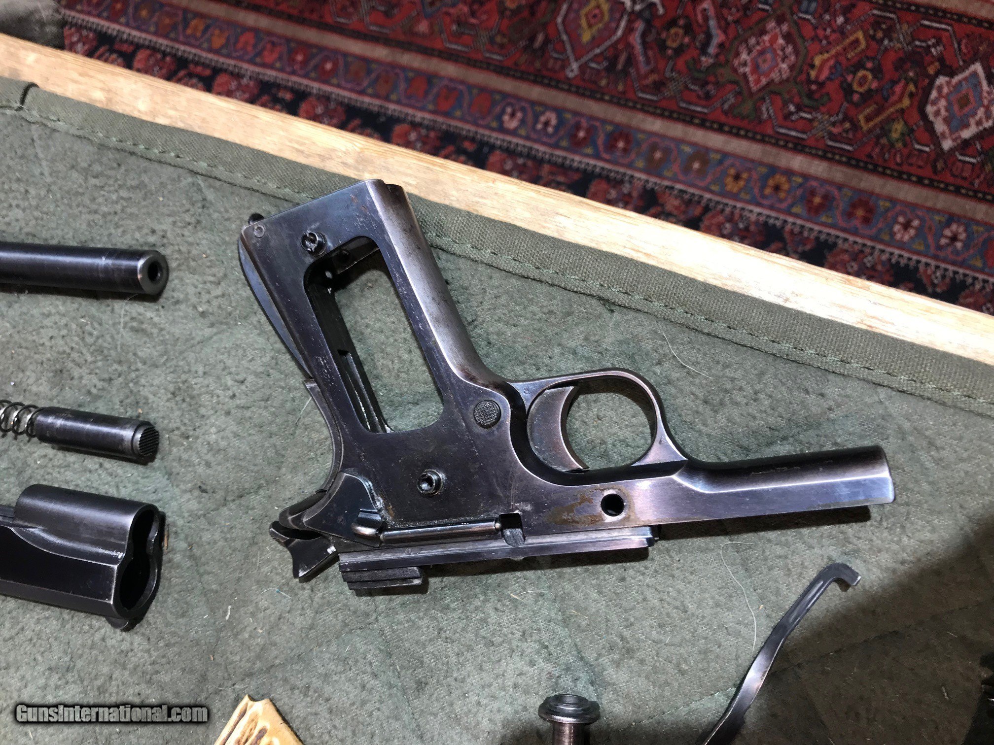 Description: Colt 1911 Commercial Frame w/ .22LR Conversion Kit. 1911 Goverment frame with C serial number placing it's DOM in 1915. Post-WWII .22LR Conversion Unit, not marked ACE, not serialized. Steven's adjustable rear target sight. Floating-chamber with short-stroke gas piston operating system which causes an enhanced, heavier recoil to more closely simulate the feel of the .45ACP chambered 1911's. The grips look like bone carved to look like antler. Comes with 1 10-rd magazine, likely original to the conversion unit. This is a wild old-school 1911 build! The conversion unit is in excellent shape, strong bluing with a few light scratches, especially toward the muzzle. See pics for all details. Bore is shiny and the system is very accurate. Enhanced recoil is definitely noticeable. The frame is in amazing shape for being over 100 years old. Bluing wear along the front strap and beavertail. Light scratching and very light pitting in a few places. Again see pics for details, if you need more pics please ask. Please call or email with any questions. Must ship to FFL. ***$40 SHIPPING AND INSURANCE*** ***NO CREDIT CARD FEES*** ***NO WARRANTIES IMPLIED OR EXPRESSED*** SOLD Manufacturer: COLT'S MFG CO. Model: 1911 Frame w/ .22LR Conversion Kit Caliber Info: .22LR Condition: USED, VERY GOOD |