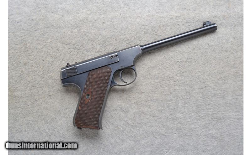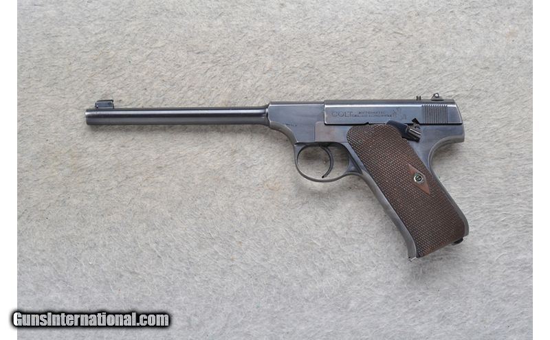 Description: This Colt Model Automatic is a right hand semi-auto pistol in .22 Long Rifle Cal. It has a 6.5 inch barrel. A blade front sight and notch rear sight. The grip panels are a diamond checkered walnut. It comes with a brown leather holster. .22 Long Rifle SOLD Chambers: Semi-Auto 10 round magazine. Metal Condition: Good. Minor surface blemishes and blue wear at the bore. Wood Condition: Good. Minor marks. Bore Condition: Good. Barrels: 6.5 inch. Weight: 28 oz. Sights: Blade front. Notch rear. Item Location: Richfield, WI |