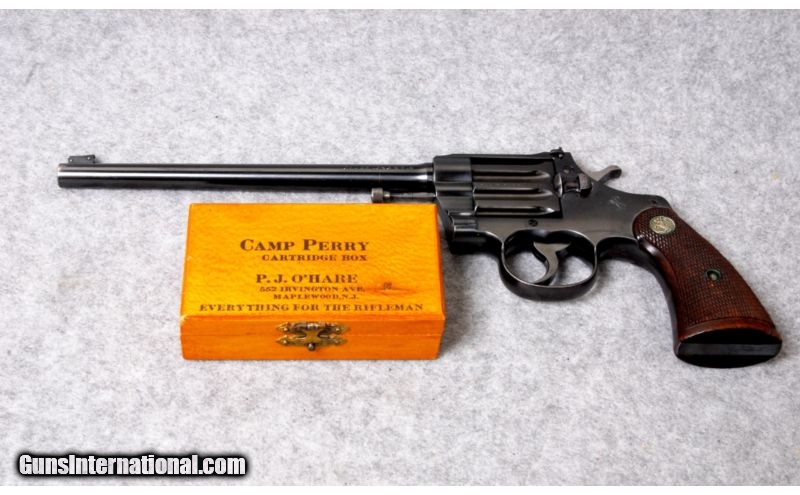 Description: SOLD Caliber Info: .22 long rifle. Metal Condition: 95% original gun. Blue is 95% with minor cylinder pin wear and light muzzle wear. Wood Condition: Minor mar on the bottom edge of the left grip. Bore Condition: Excellent. Barrels: 10" round barrel with a flat, fluted cylinder. Triggers: Royal blue. Stock: Original checkered walnut grips with circle medallions. Sights: Pinned front blade and windage rear. Extras: Comes with a wood Camp Perry, 50 round, ammo box. Item Location: Kansas City, KS |
