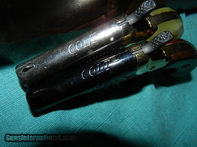 Description: A clean Colt Lord and Lady set of derringers in a presentation box. These swing open derringers chamber the .22 short or CB. Finish is complete and the gold plating is starting to fade common on all these guns. The bores are excellent, and usually people don't fire these.Top of barrels stamped COL see photo.. The pair of guns are consecutively numbered. Box has dovetailed edges and looks factory. the interior is the factory satin red! We don’t have asite .I prefer money orders or a check. Item ships when funds come in. If you can only pay with a card let me know. I hope you like my wide selection of unusual guns, knives and gun parts. Shipping price determined by zip code. I try to keep the prices affordable, which means I make less money than most dealers. You won’t get altitude sickness with my prices! I consistently have the best selection of older guns If you BUY IT NOW you must still contact us for details buy it now doesn't end the sale, it just sends an email telling us you want to buy this gun. A phone call won’t secure a sale! Not home many times, the first buyer by email buys the gun !Thissite doesnot close down a sale when you do a BUY IT NOW like Ebay!I can get six buy it nows in an hour, first buyer to email gets the guns, others are in second place! Best to send another email . Sometimes not home to get calls. Some guns are required shipment to a gun dealer near you for a transfer to you when it arrives. With the widest selection of older guns at great prices, We don’t have a store, and sell on the internet only. SOLD |