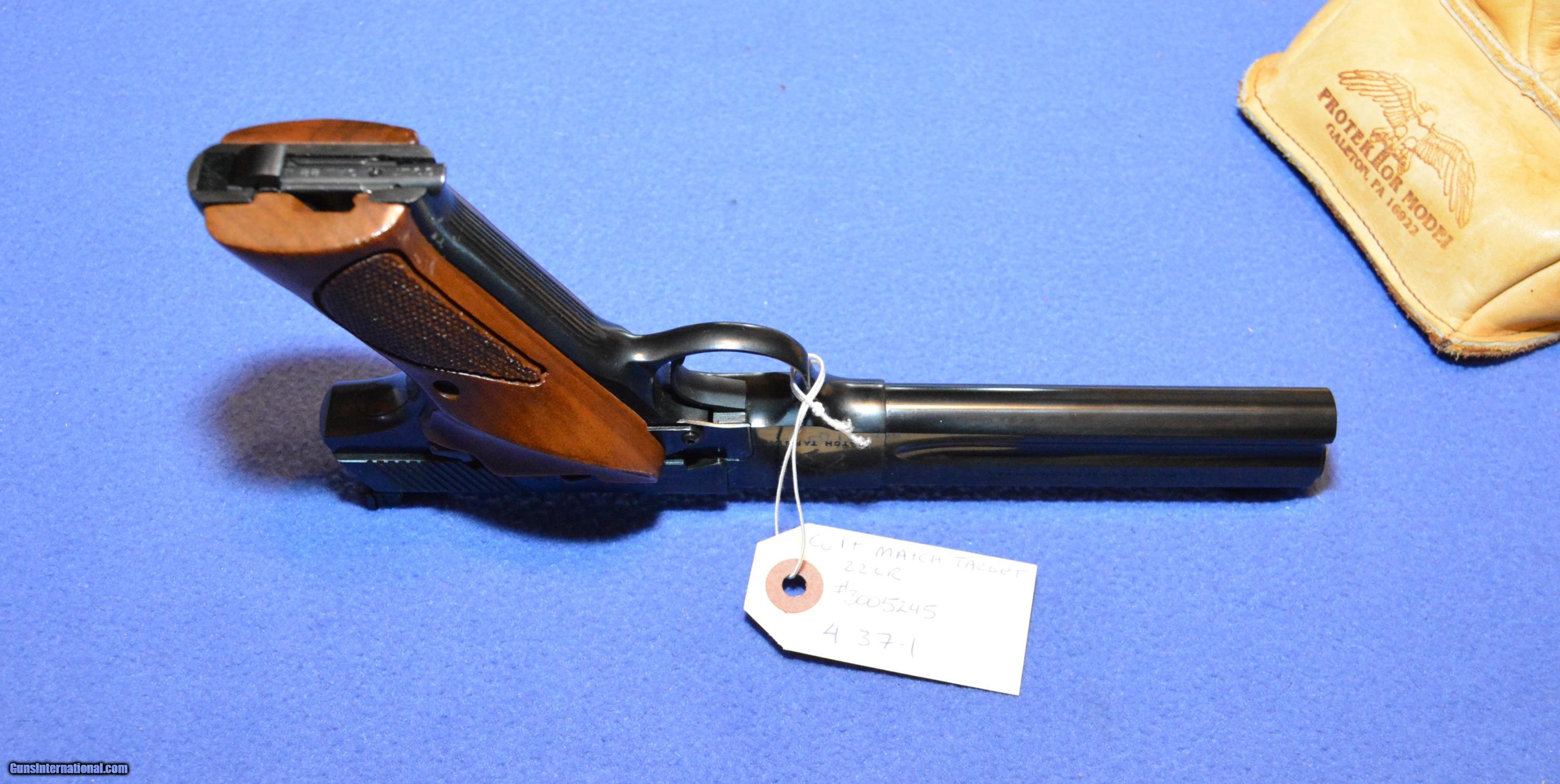 Description: Colt Match Target 22 LR 6-inch Barrel On Consignment is this very nice Colt Match Target 22 LR semi auto pistol bearing serial # 3005245. The pistol has a 6-inch barrel and Elliason adjustable rear sight. The pistol has its Styrofoam box but no outer sleeve or paperwork. This pistol is part of an extensive self-proclaimed gun hoarders’ estate. The grips are 99.8%, the exterior bluing is 98.5% maybe 98% since the pistol did suffer a safe ding from overcrowding and now has a very small blemish on the lower left area of the frame. Pistol may have been test fired but is clean and perfectly ready to either go to work or enhance your collection. No diminished finish issues anywhere else. Yes, we gladly ship to California if legal there. Shipping will be $20.00 USPS Priority Mail. If illegal to own in your area don’t bid. Payment with US Funds from US Banks ONLY!!! We accept Cash, Checks, Money Order and US Postal Money Orders. We also accept Visa, MasterCard and Discover at 2.8% service fee. All items ship when payment clears, no exceptions. We do not accept PayPal or American Express. Call 865-805-1187 for details or questions. Out of state buyers no sales tax yet. Local buyers must pay TN sales tax and $10.00 TBI state back ground check fee. Please encourage your congressman and senator to vote against an internet sales tax and instead encourage local shops to hire persons to post on the web. I’ve done both! SOLD Manufacturer: Colt Model: Match target Serial Number: 3005245 Caliber Info: 22 LR Bore: Excellent Chambers: Excellent Ejectors: excellent Condition: 98% Plus Metal Condition: 98% Wood Condition: 99% Bore Condition: Excellent Barrels: 6 Action: Semi Auto |