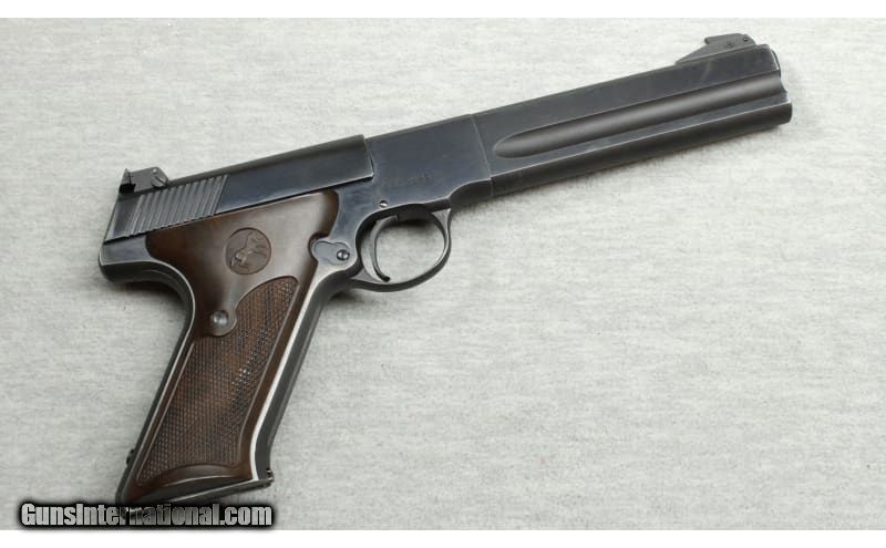 Description: Excellent condition, some finish wear, small nicks & scratches, comes with one mag. Classic semi auto rimfire target pistol. 6" barrel with heavy underlug, polished blue finish, crisp target trigger, adjustable rear & blade front sights, serrated front & rear grip surfaces and checkered wood target grips. .22 Long Rifle SOLD Chambers: Semi auto Metal Condition: Excellent Bore Condition: Bright Barrels: 6 Triggers: Factory Butt Pad: Factory grips Sights: "Adjustable rear, blade front sights Item Location: La Vista, NE |