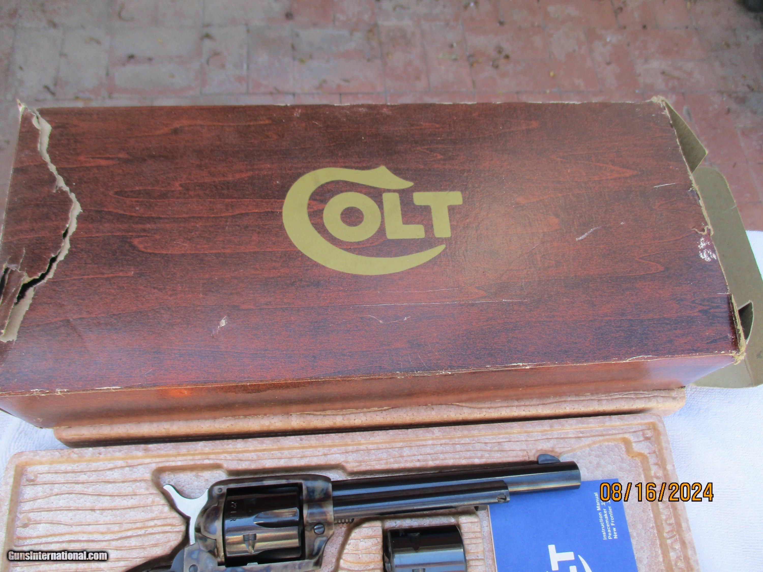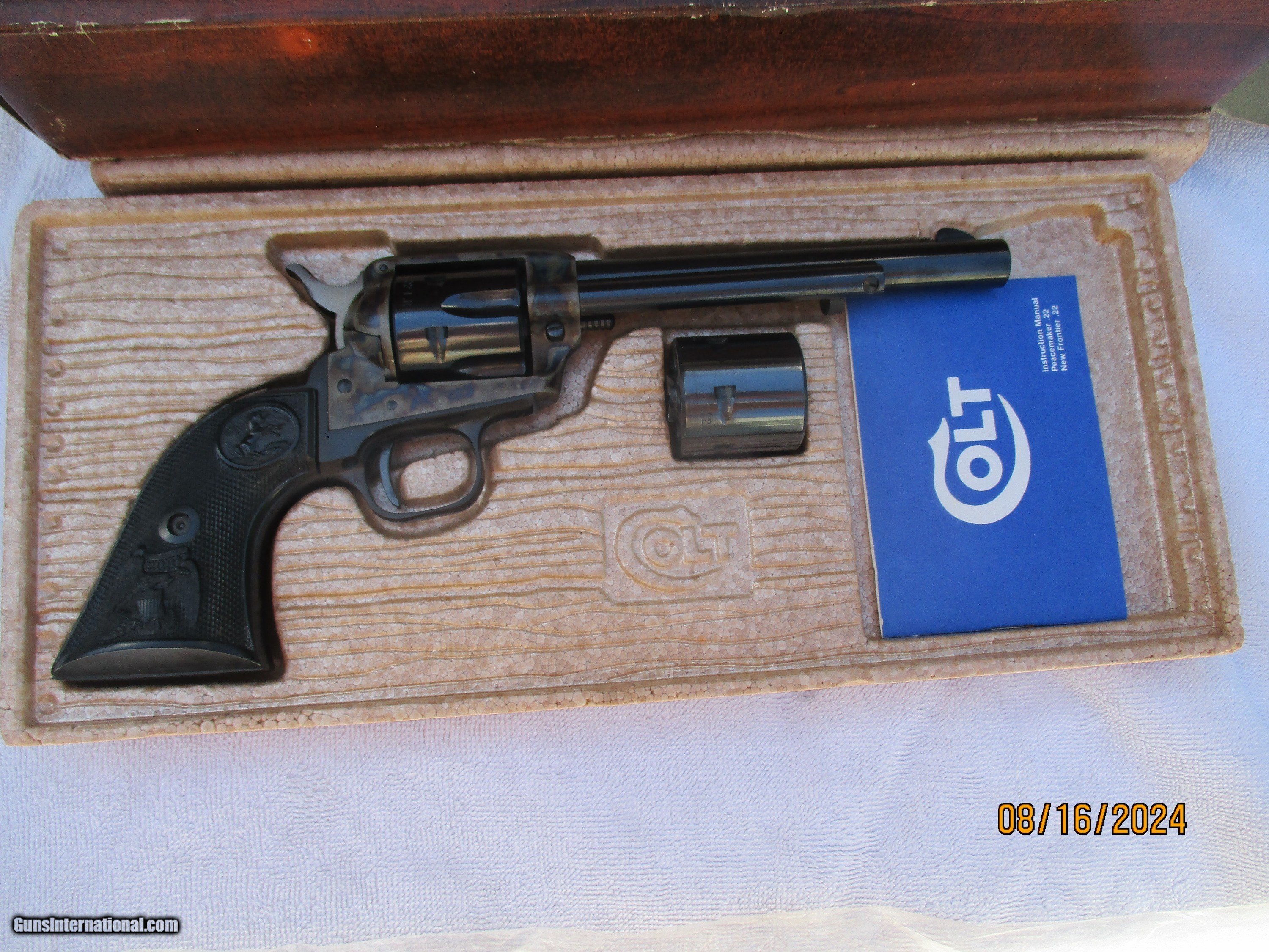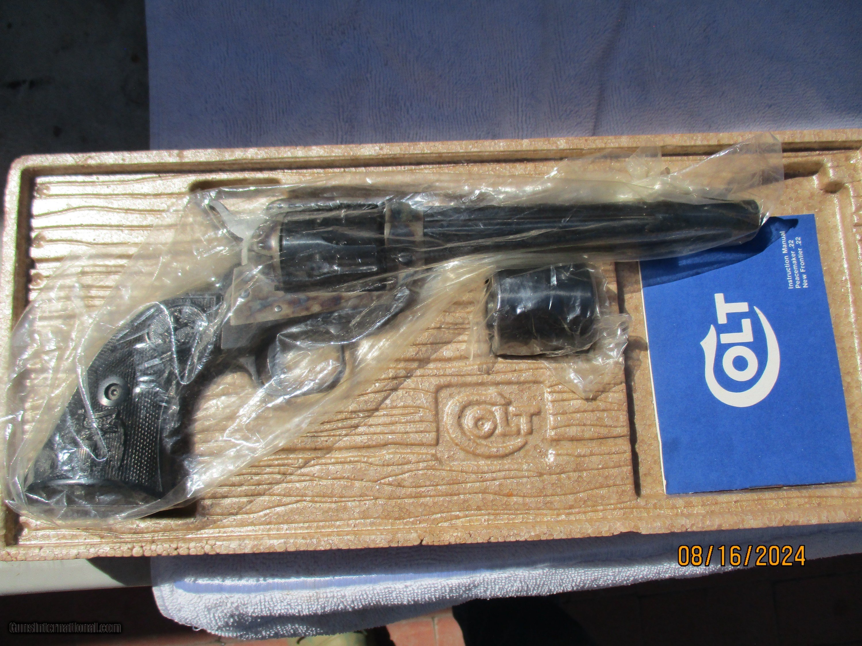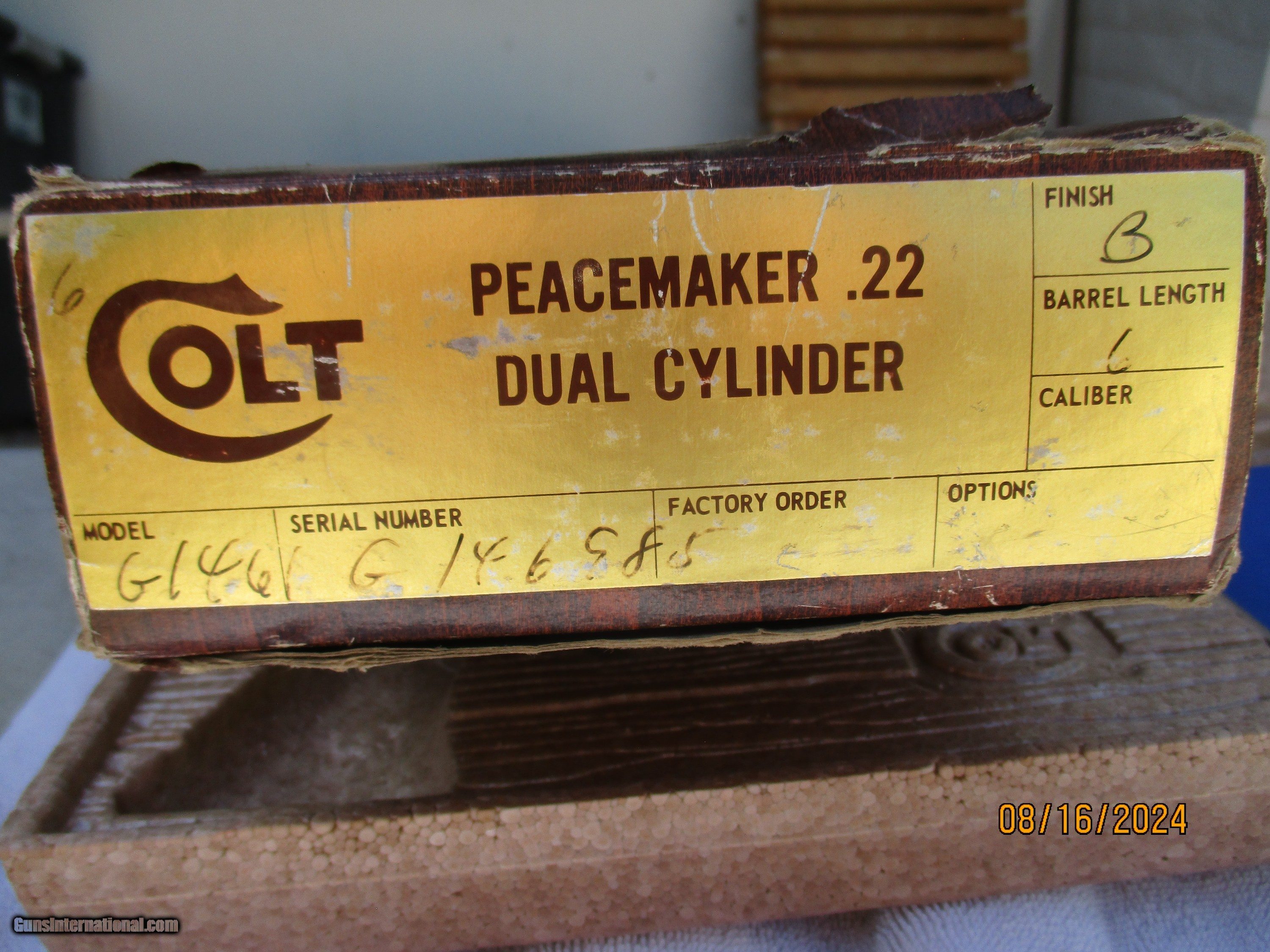 Description: Colt Peacemaker with TWO cylinders 22 LR and 22MAG. NEW in original COLT box, wrappers and Colt manual. Unfired. Bluing is deep and color case hardened receiver is bright. Grips are origianl Colt plastic 22 MAG cylinder is like new in original wrapper. Box has tear on left side but interior foam liner is intact. Acquired from an estate sale, this revolver has not seen the light of day in a long time. Serial number dates 1975. SOLD Handgun Caliber: .22 Long Rifle Manufacturer: COLT Model: Peacemaker Serial Number: G146985 Barrel Length: 6 Bore: 22 Chambers: 22 LR & 22 MAG Ejectors: One Condition: Excellent Metal Condition: Excellent Wood Condition: Original Bore Condition: Excellent Barrels: 6 Barrel Type: Round Action: Single Action Revolver Triggers: Single Action Stock: Colt Plastic Manufacture Date: 1975 Case: Original COLT Box Item Location: Tucson, AZ |