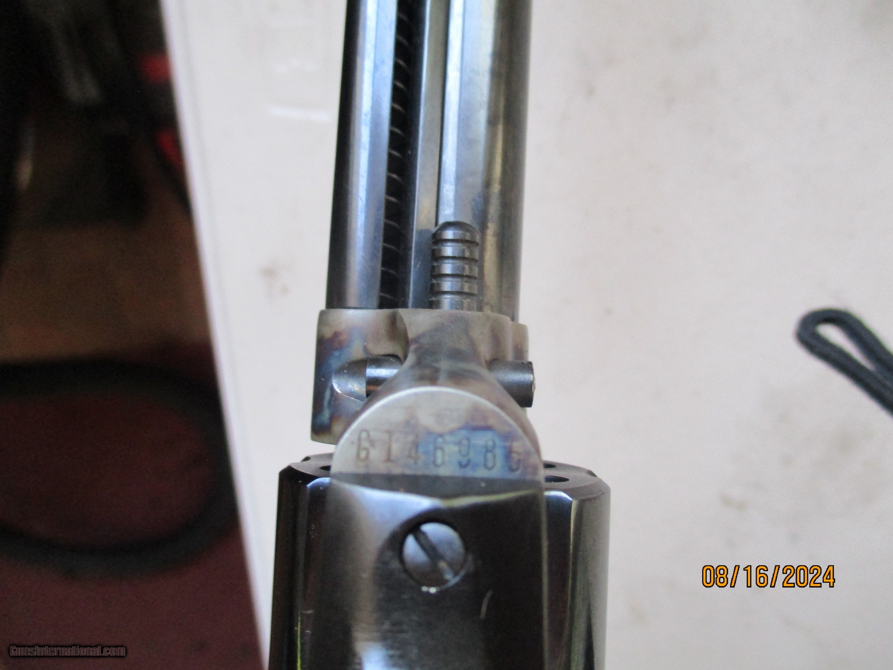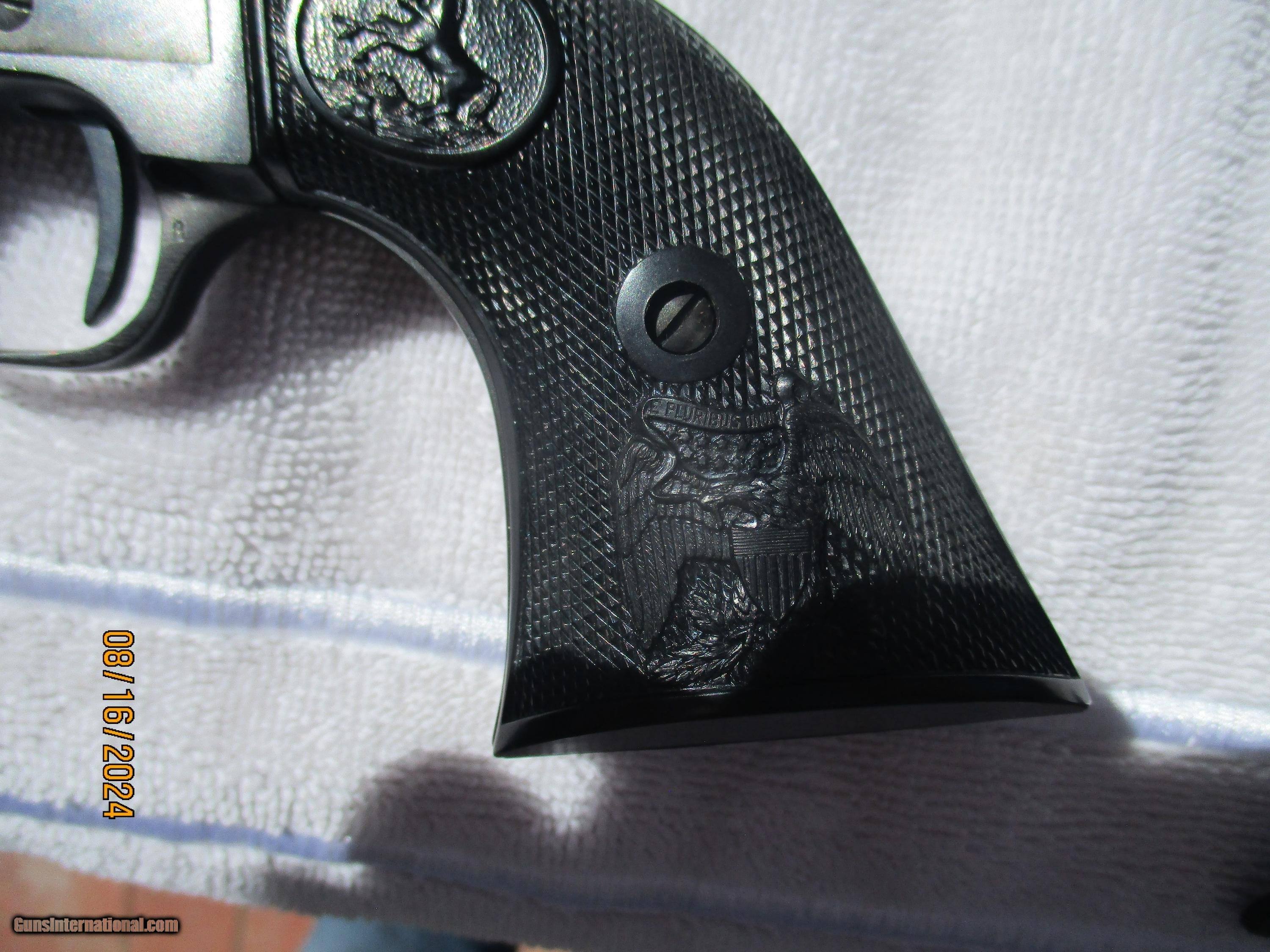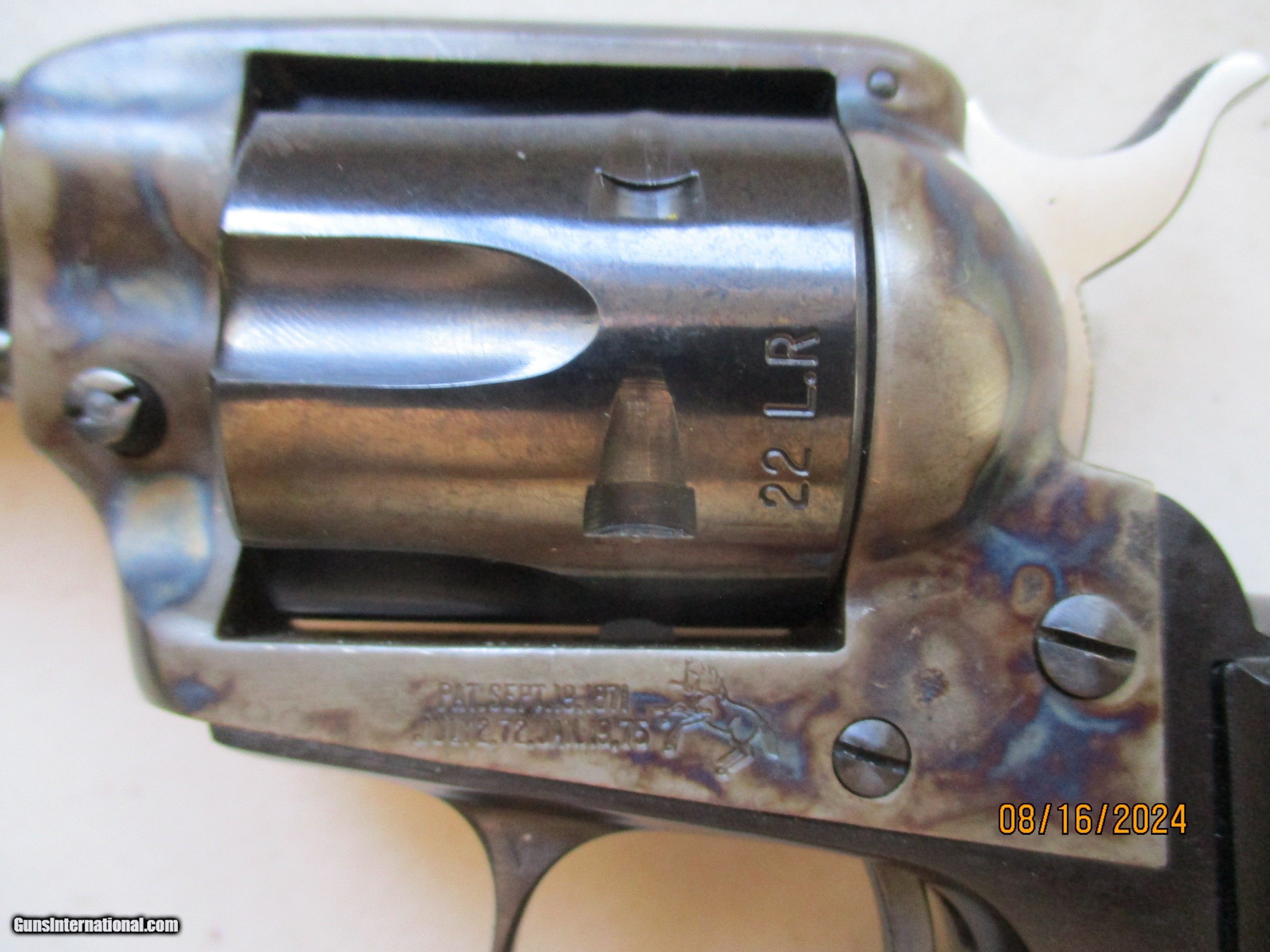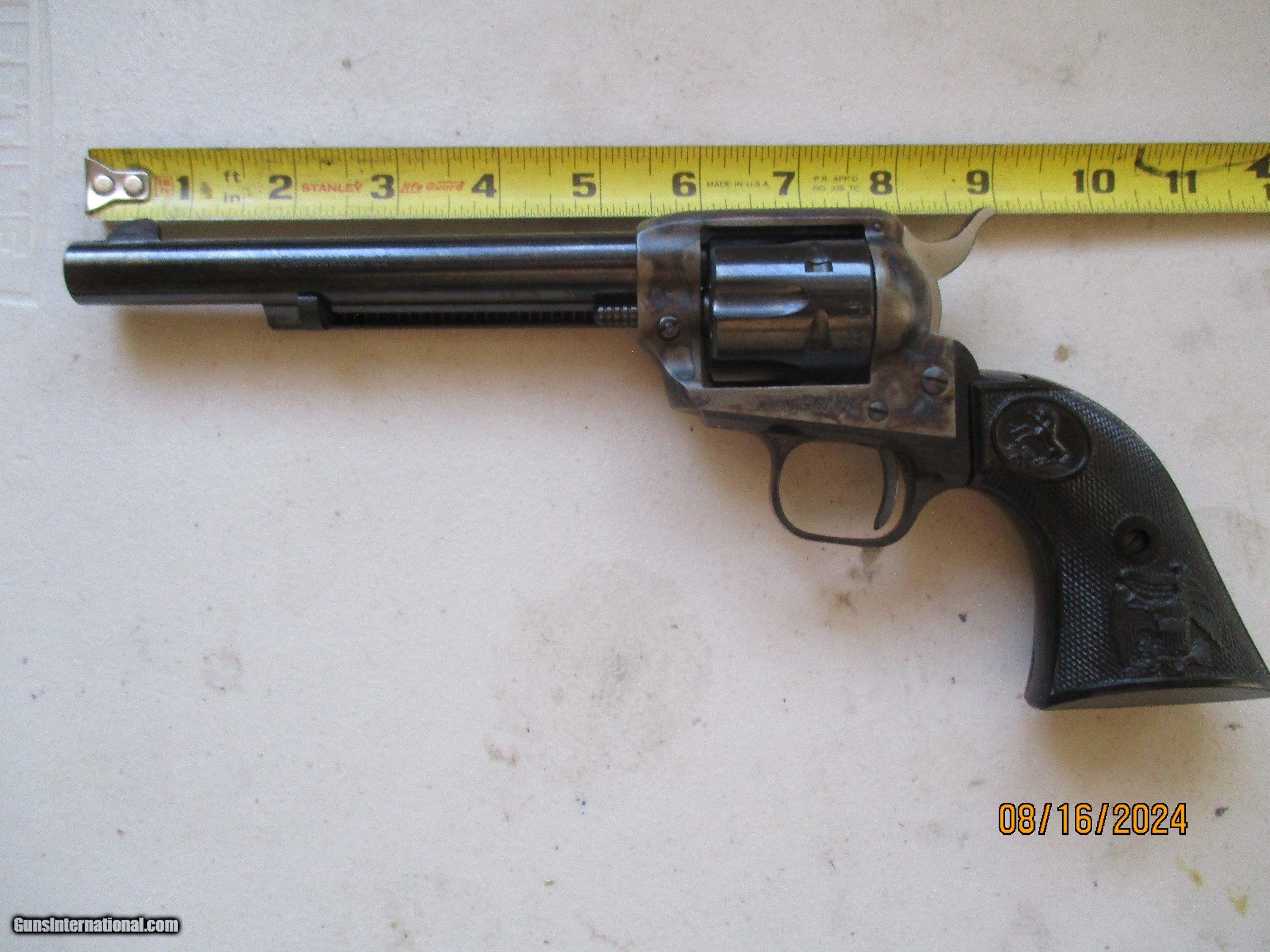 Description: Colt Peacemaker with TWO cylinders 22 LR and 22MAG. NEW in original COLT box, wrappers and Colt manual. Unfired. Bluing is deep and color case hardened receiver is bright. Grips are origianl Colt plastic 22 MAG cylinder is like new in original wrapper. Box has tear on left side but interior foam liner is intact. Acquired from an estate sale, this revolver has not seen the light of day in a long time. Serial number dates 1975. SOLD Handgun Caliber: .22 Long Rifle Manufacturer: COLT Model: Peacemaker Serial Number: G146985 Barrel Length: 6 Bore: 22 Chambers: 22 LR & 22 MAG Ejectors: One Condition: Excellent Metal Condition: Excellent Wood Condition: Original Bore Condition: Excellent Barrels: 6 Barrel Type: Round Action: Single Action Revolver Triggers: Single Action Stock: Colt Plastic Manufacture Date: 1975 Case: Original COLT Box Item Location: Tucson, AZ |