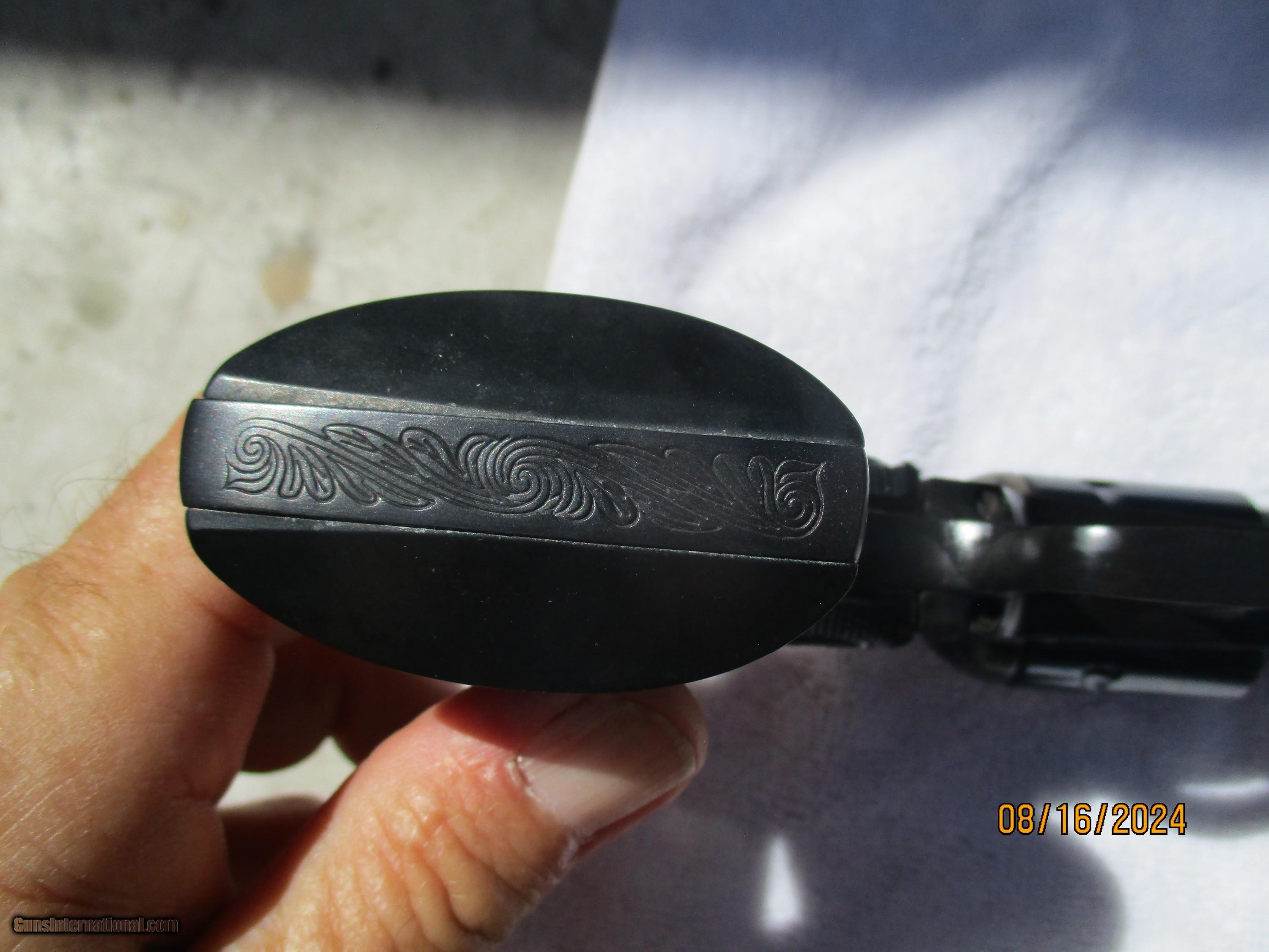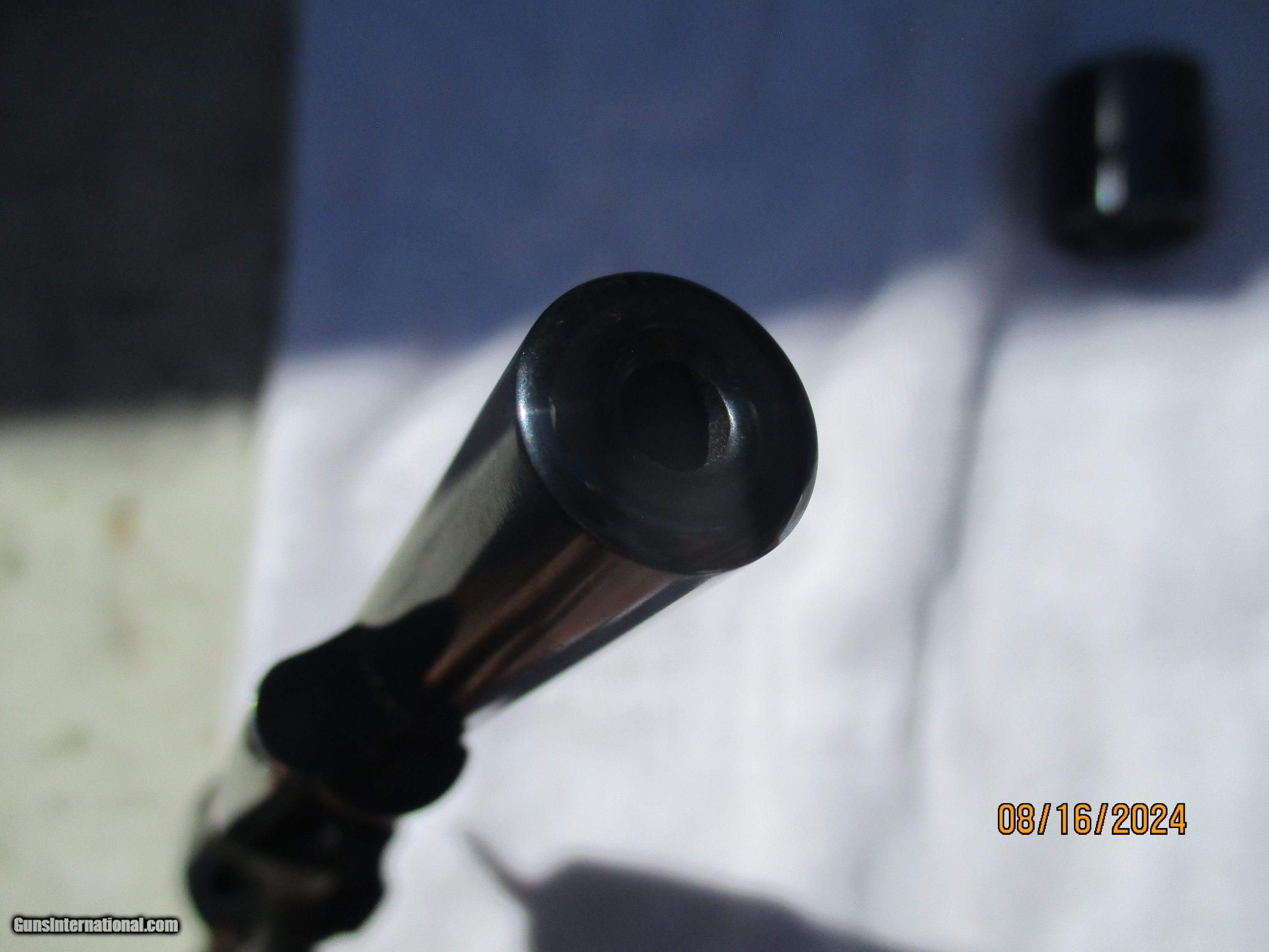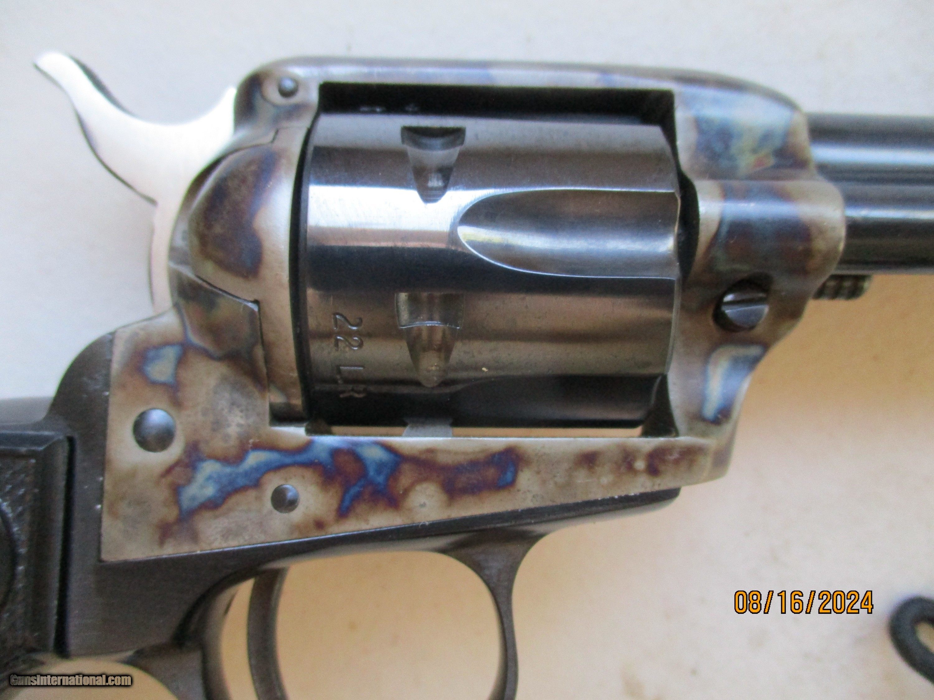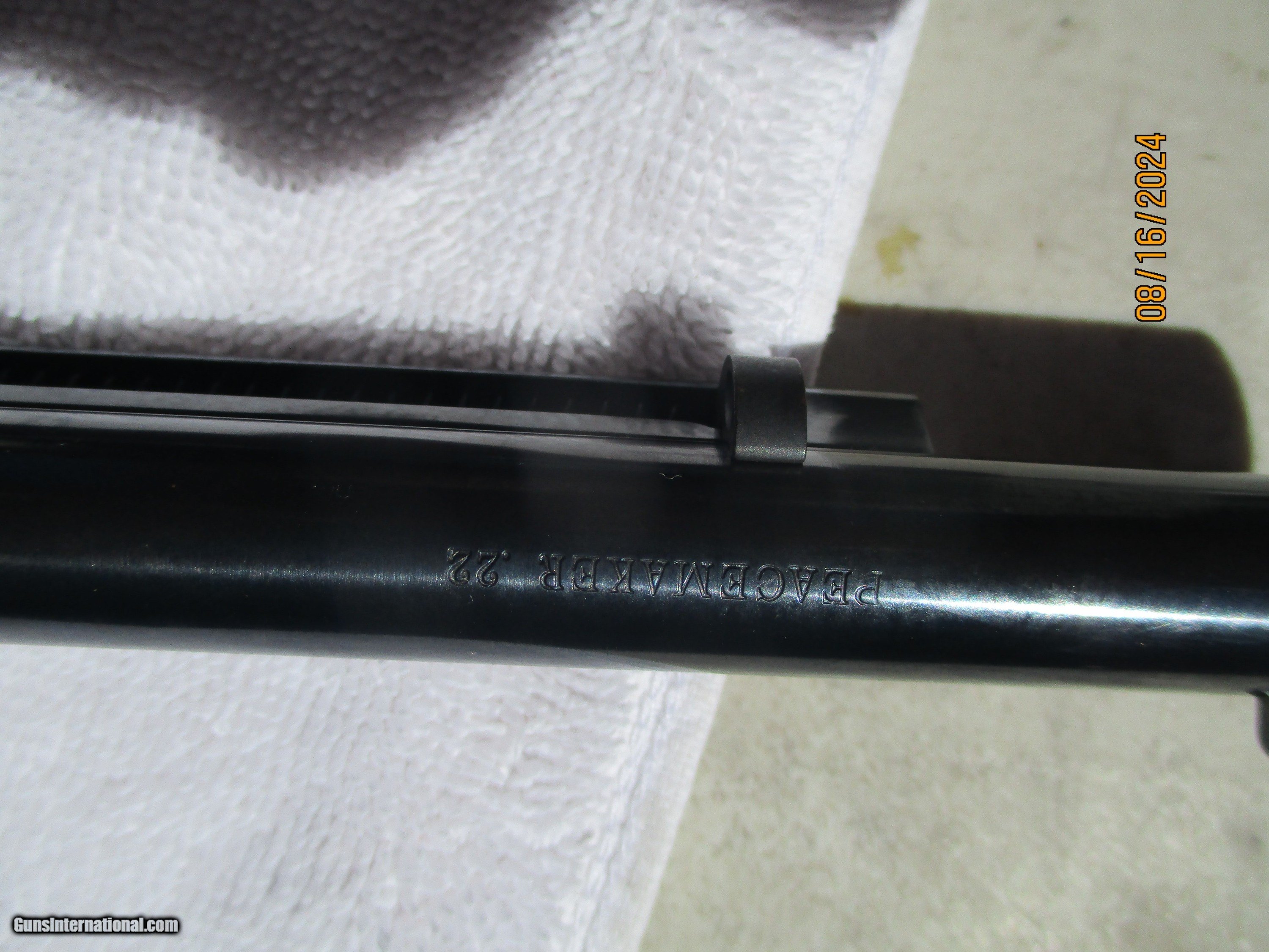 Description: Colt Peacemaker with TWO cylinders 22 LR and 22MAG. NEW in original COLT box, wrappers and Colt manual. Unfired. Bluing is deep and color case hardened receiver is bright. Grips are origianl Colt plastic 22 MAG cylinder is like new in original wrapper. Box has tear on left side but interior foam liner is intact. Acquired from an estate sale, this revolver has not seen the light of day in a long time. Serial number dates 1975. SOLD Handgun Caliber: .22 Long Rifle Manufacturer: COLT Model: Peacemaker Serial Number: G146985 Barrel Length: 6 Bore: 22 Chambers: 22 LR & 22 MAG Ejectors: One Condition: Excellent Metal Condition: Excellent Wood Condition: Original Bore Condition: Excellent Barrels: 6 Barrel Type: Round Action: Single Action Revolver Triggers: Single Action Stock: Colt Plastic Manufacture Date: 1975 Case: Original COLT Box Item Location: Tucson, AZ |
