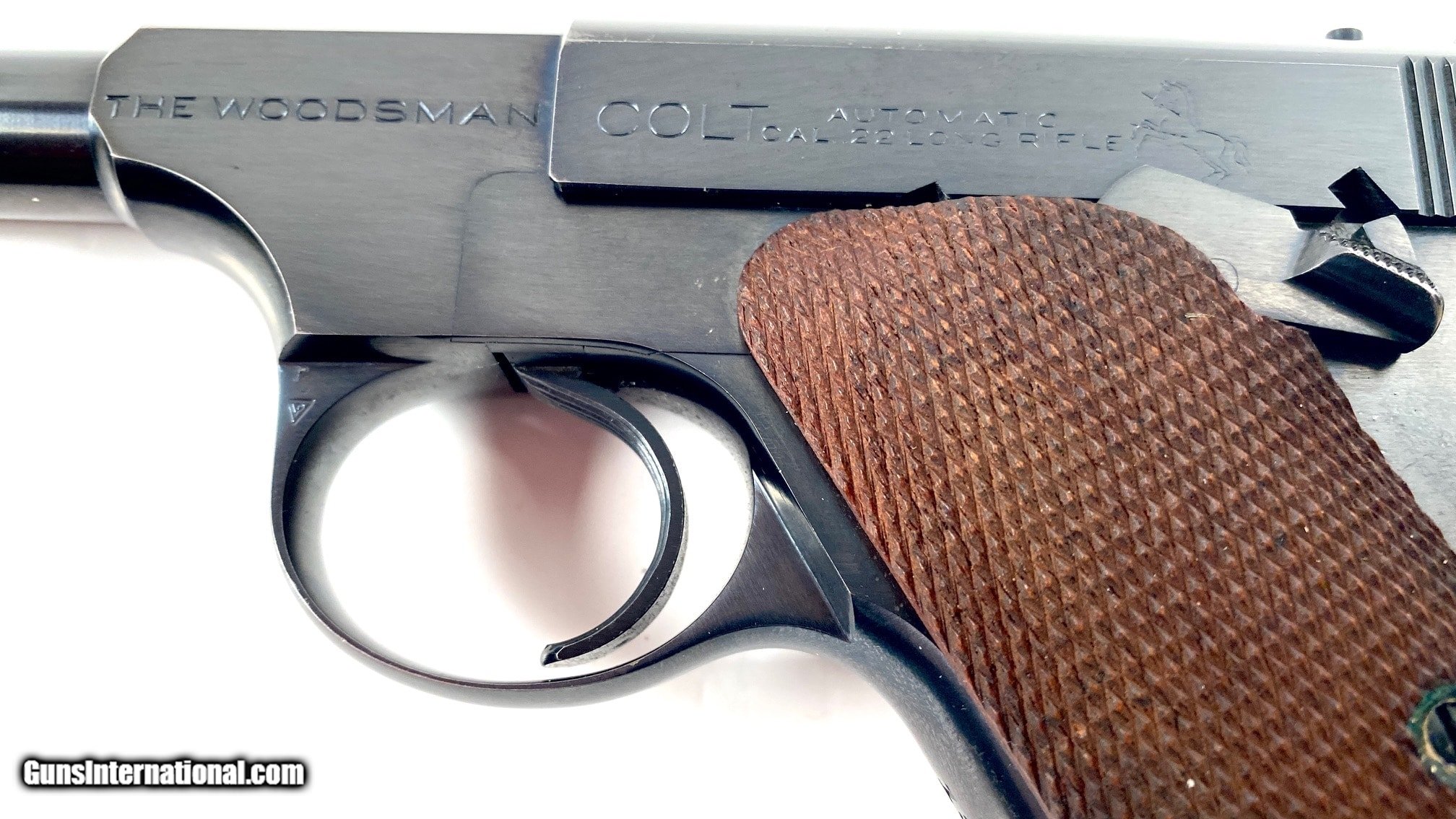 Description: Guns Listing ID: 577807 KW 8/3/22 Original Box & Papers Holster Very desirable 4.5\" barrel Mint condition/possibly unfired. Stock # 0869022 Serial # 51439 135192 SOLD Manufacturer: COLT Model: Pre Woodsman Caliber Info: .22 LR Condition: Used - Non-Certified Barrels: 4.5 BARREL Finish: BLUE |
