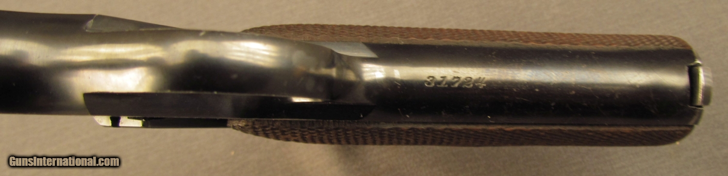 Description: Serial #31724, .22 LR, 6 5/8” pencil barrel (.480” diameter at the muzzle) with a fine, bright bore that has some mild freckling within the grooves. This is a 1922-made, matching numbered pistol that retains 97-98% of the original blue finish with some mild silvering at the muzzle, along a few of the high edges, and at the heel of the butt. Additionally, there are some very light handling marks and small scratches along the surface of the metal, and a very small and unobtrusive import mark on the underside of the barrel. The checkered walnut, diamond-center grips are likewise in excellent shape with very little noticeable wear and only some very mild flattening of the points. A single original two-tone magazine is included and the mechanics are flawless. This is a fabulous example of a Pre-Woodsman and would make a great addition to any collection. FFL or C&R SOLD Curio/Relic: Yes Manufacturer: Colt Model: Woodsman Serial Number: 31724 Caliber Info: .22LR Gauge Info: .22LR |