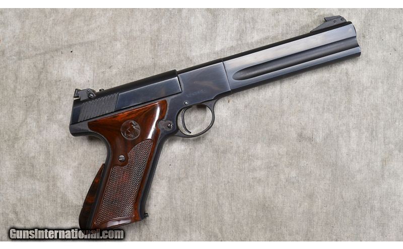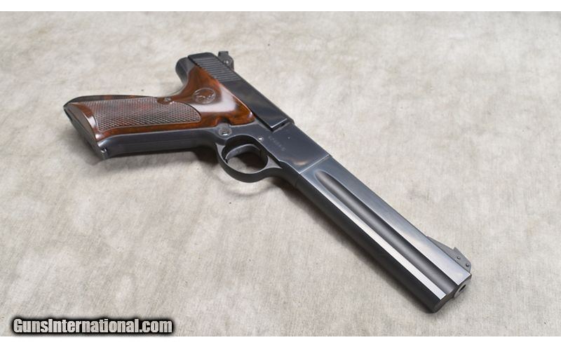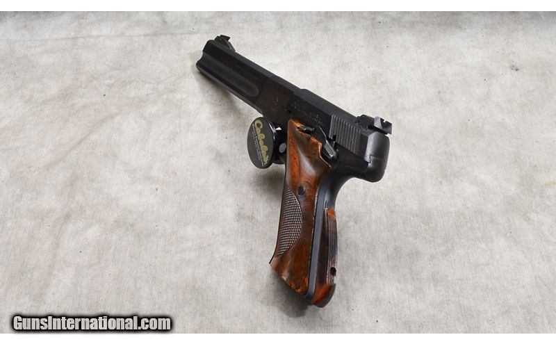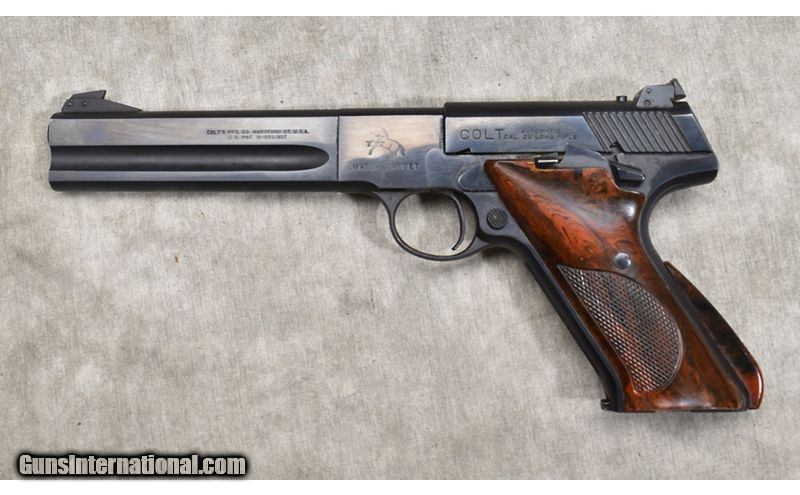 Description: Nice target pistol featuring "Coltwood" plastic grips, heavyweight barrel, and backstrap extension. There are few handling marks and all engravings are sharp and clear. .22 Long Rifle SOLD Chambers: 10-round magazine. Metal Condition: Excellent. Wood Condition: Excellent. Bore Condition: Shiny and bright with good rifling. Barrels: 6-inch Triggers: Factory single action trigger. Butt Pad: Wood grain plastic Colt grips with molded Colt logo. Weight: 41 oz. Sights: Patridge post and adjustable notch. Item Location: Rogers |