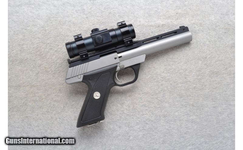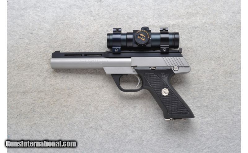 Description: This Colt Model Target is a semi-automatic pistol in .22 Long Rifle Cal. It has a 6 inch heavy target stainless steel barrel with a ventilated rib and rear serrated slide. A blade front, adjustable notch middle and a Ultra Dot 30mm red dot sight. The grip is a checkered black polymer. SOLD Caliber Info: .22 Long Rifle Chambers: Semi-Auto 10 round magazine. Metal Condition: Very good with some minor handling marks. Wood Condition: Grips are in excellent condition. Bore Condition: Excellent. Barrels: 6 inch heavy bull barrel with a ventilated rib and rear serrated slide. Stock: Textured black polymer grip with silver Colt horse medallions. Weight: 46 oz. with the Ultra Dot red dot sight. Sights: Blade front. Adjustable notch rear. Ultra Dot 30mm red dot sight. Extras: Comes in a Colt hard case with Owners Manual and two 10 round magazines. Red Dot box. Item Location: Richfield, WI |