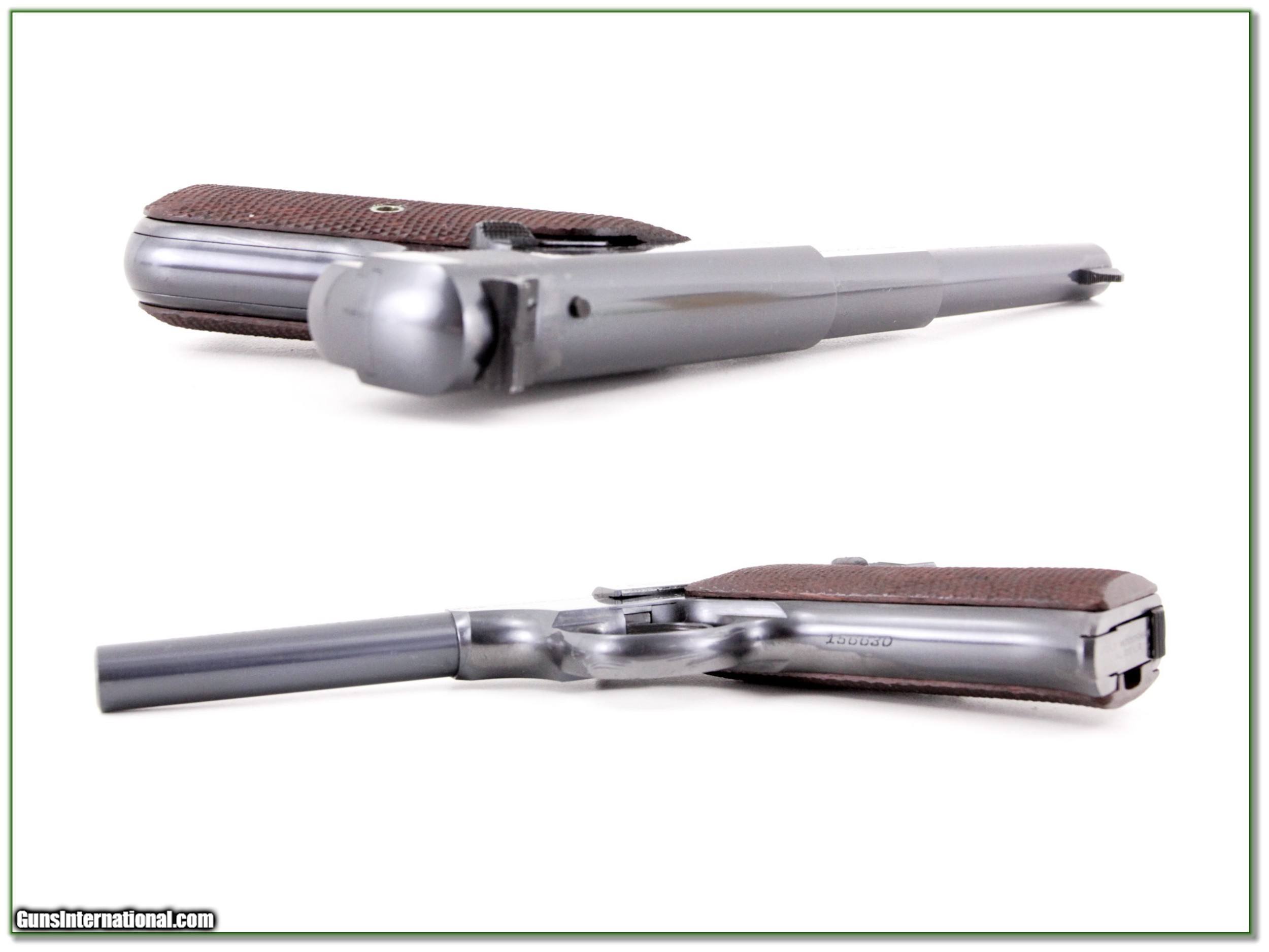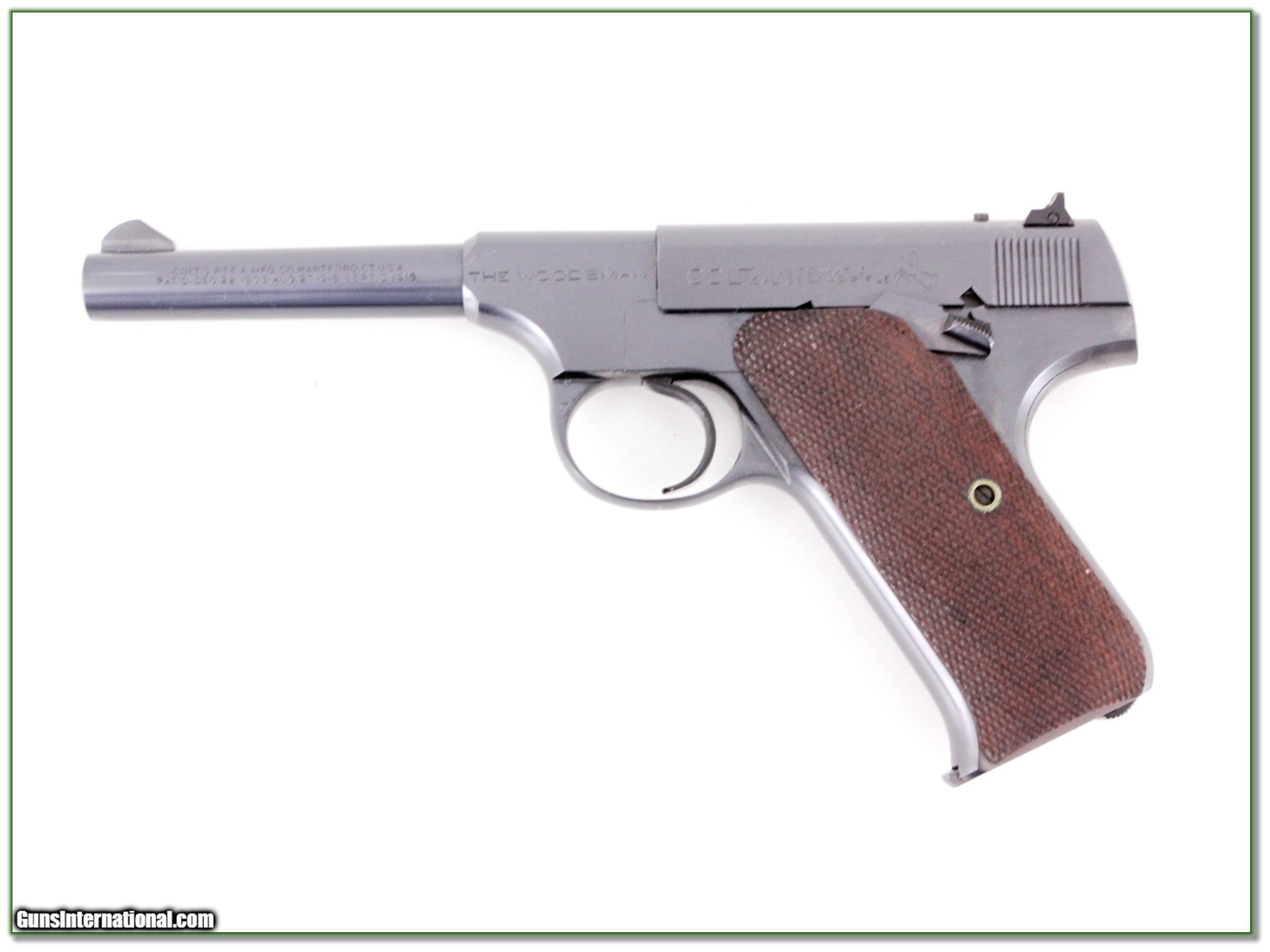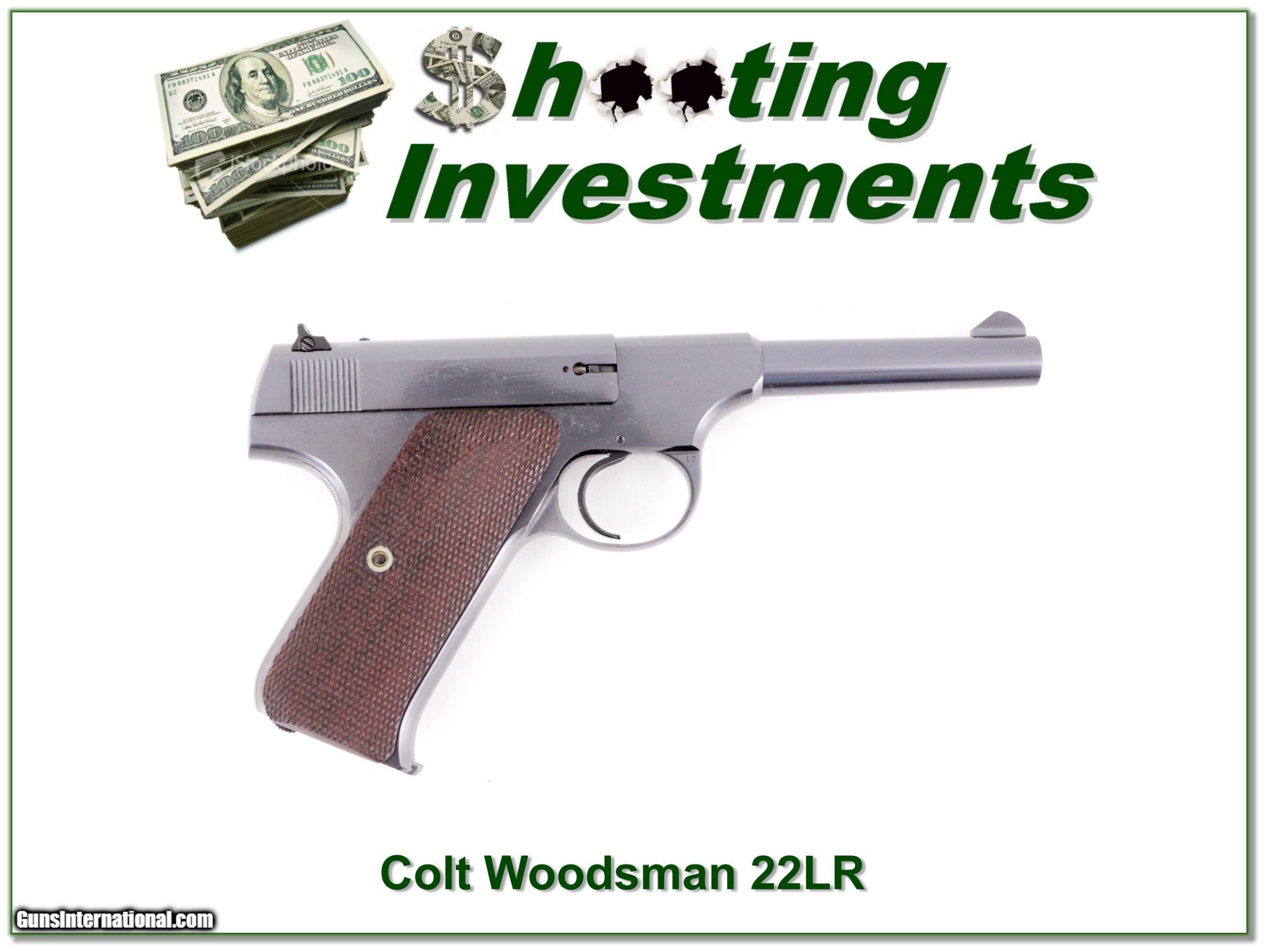 Description: Collectors, this is a last year Colt Woodsman First Series. It is in as new condition and is all original. It is a harder to find 4.5in gun. You will look hard to find another this nice. I am selling this one on consignment and as such lay-a-way can’t be used. It does of course have the standard 3-day inspection. Shipping and insurance is $49. Please email me with any questions or larger pictures. (Consign your quality firearms with Shooting Investments for only 12%! Let me know if you have any you would like to sell!) 18-0606 Payment: Payment is by Money Order, Cashiers Check or Personal Check. I can now also accept MasterCard and Visa with a 3% convenience fee. PayPal can be used for some items but never firearms. Please let us know if you would like to pay via PayPal. Shipping: The shipping charge will be listed in each description. It is $39 for most long guns and $29 for most handguns. Some heavy guns or those insured for over $2000 will be higher. Shipments to Alaska and Hawaii are higher because air shipment is required. Most firearms are shipped on Tuesday and Thursday and usually in 5 days of receipt of payment. We package all shipments carefully and insure them. For long guns you can purchase a new Plano case for $19. They now cost us $22 when buying 100 at a time. Optics are shipped Priority Mail and most other non-firearm shipments are shipped First Class. Returns: Our return policy is simple. If for any reason you are not pleased with your purchase, you may return your item for a full refund of purchase price. Ammunition cannot be returned. It is important to us that you are happy. Guns cannot be fired or dissembled before returning them and they must be returned in the same condition as received. Notification of a return must occur with-in 3 days of receipt at your dealer. Shipping, convenience and dealer fees are not refundable and are the responsibility of the buyer. Lay-a-way: If needed, we offer a 60 day lay-a-way option on most firearms. It is 1/3 now, 1/3 in 30 days and 1/3 in 60 days. Lay-a-way firearm sales are final and if not completed the first payment cannot be returned. Consigning your firearms with Shooting Investments: We will help you get top dollar for your firearms. While most local guns shops charge 20% or more, our fee is only 12% with a minimum of $75. At your local gun shop it might take months to sell. Selling on-line provides instant access to thousands of interested buyers. You won’t find any other on-line dealer willing to sell your firearms for only 12% or listing every gun on 3 separate s. Selling through an House typically costs the seller 15% and the buyer an addition 15% (so 30%) and you have to wait several months to sell and longer to receive funds. If properly priced, we will sell your firearms in a few weeks. Send us an email or give us a call and we’ll explain how easy it is for you to get top dollar. Trading: Trading for use is really just buying your gun to re-sell. If you have a gun you want to trade, please email a picture and we will let you know what we can give or it. You will always get more if we sell it for you on consignment. Help for California Buyers: We are happy to ship to California. It is the buyer’s responsibility to make sure any item you buy is legal in your state. We are also happy to help with your purchase of a firearm from someone other than us. If you see a gun you would like to buy but the seller can’t or won’t ship to California they can ship to use and we’ll then ship it to your California dealer. The cost for this service is only $30 + shipping. Let us know if we can help! SOLD |