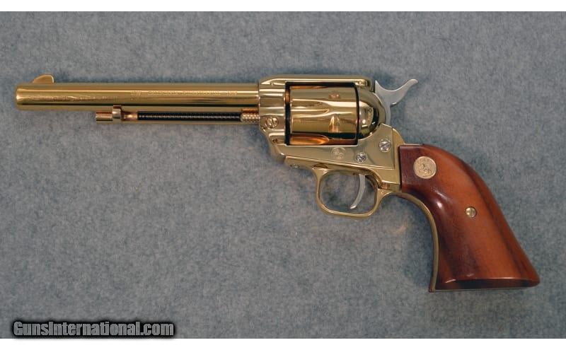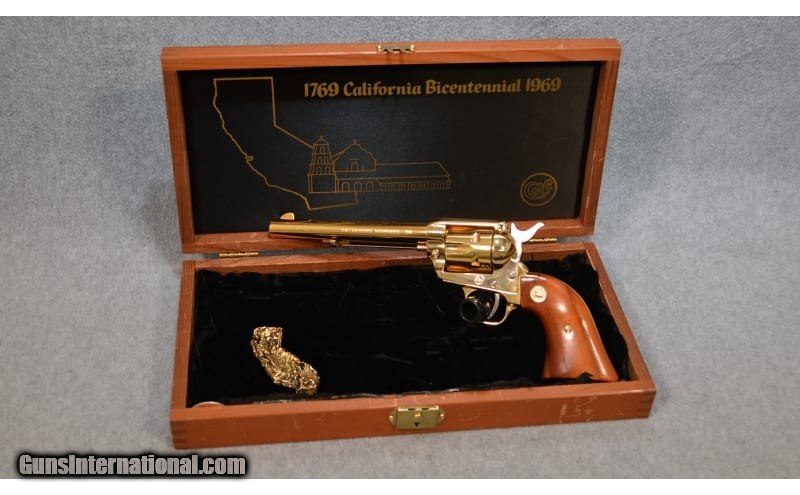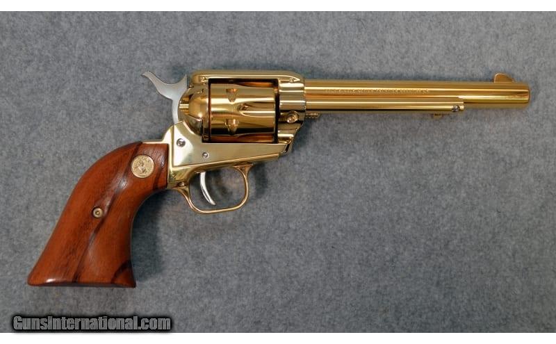 Description: The Colt PTFA California Frontier Scout Bicentennial is a limited edition - single - action revolver, commemorating California's Bicentennial. It's chambered in .22 LR, with a 6" barrel, a groove rear sight and blade front sight. This revolver has a gold-plated finish and walnut grips, it also has a presentation box with some handling marks on the box. This firearm is known for its reliable craftsmanship and is prized by collectors for its historical significance and quality. .22 Long Rifle SOLD Chambers: .22 LR Metal Condition: Excellent Wood Condition: Excellent Barrels: 6 Triggers: Smooth Faced Weight: 2 lbs Sights: Factory Item Location: Louisville, KY |