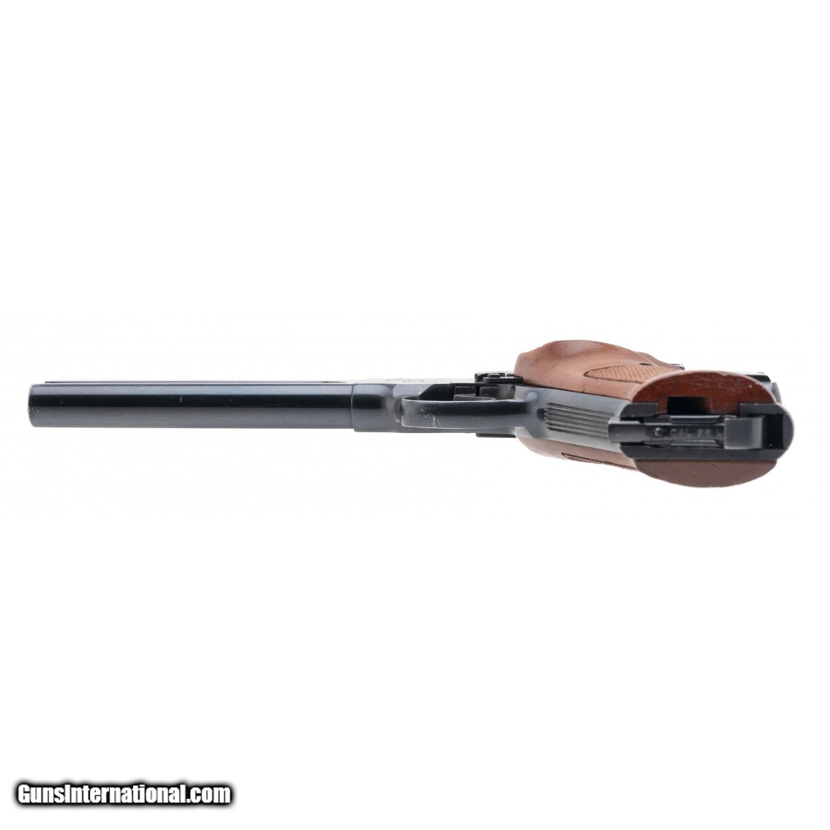 SN: 032709S. Made in 1972, .22LR with a 6"" barrel. 3rd Series target pistol with wood grips. The metal is very good with 92% original blue. The grips are in very good condition with some marks and wear. Overall very good condition.