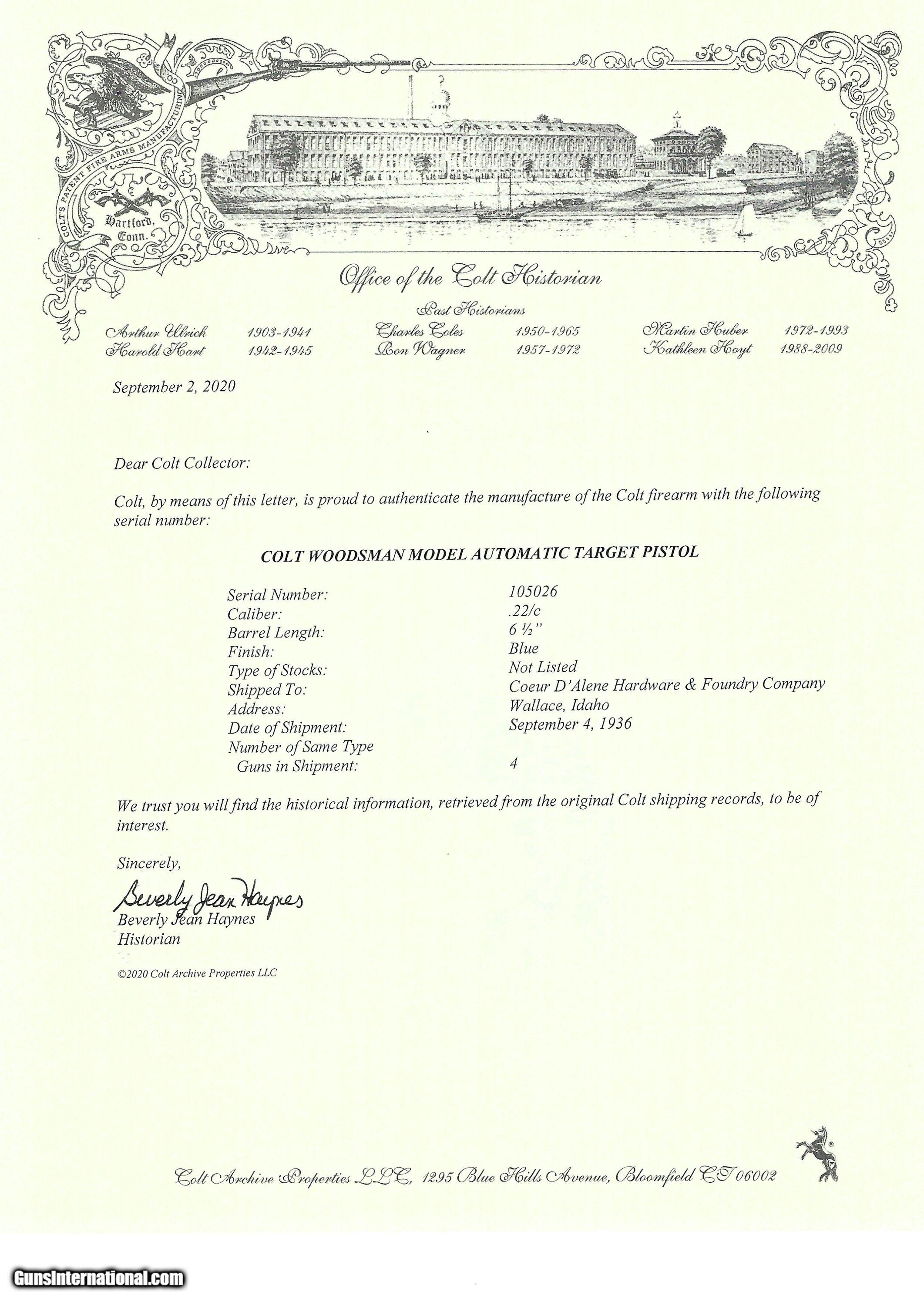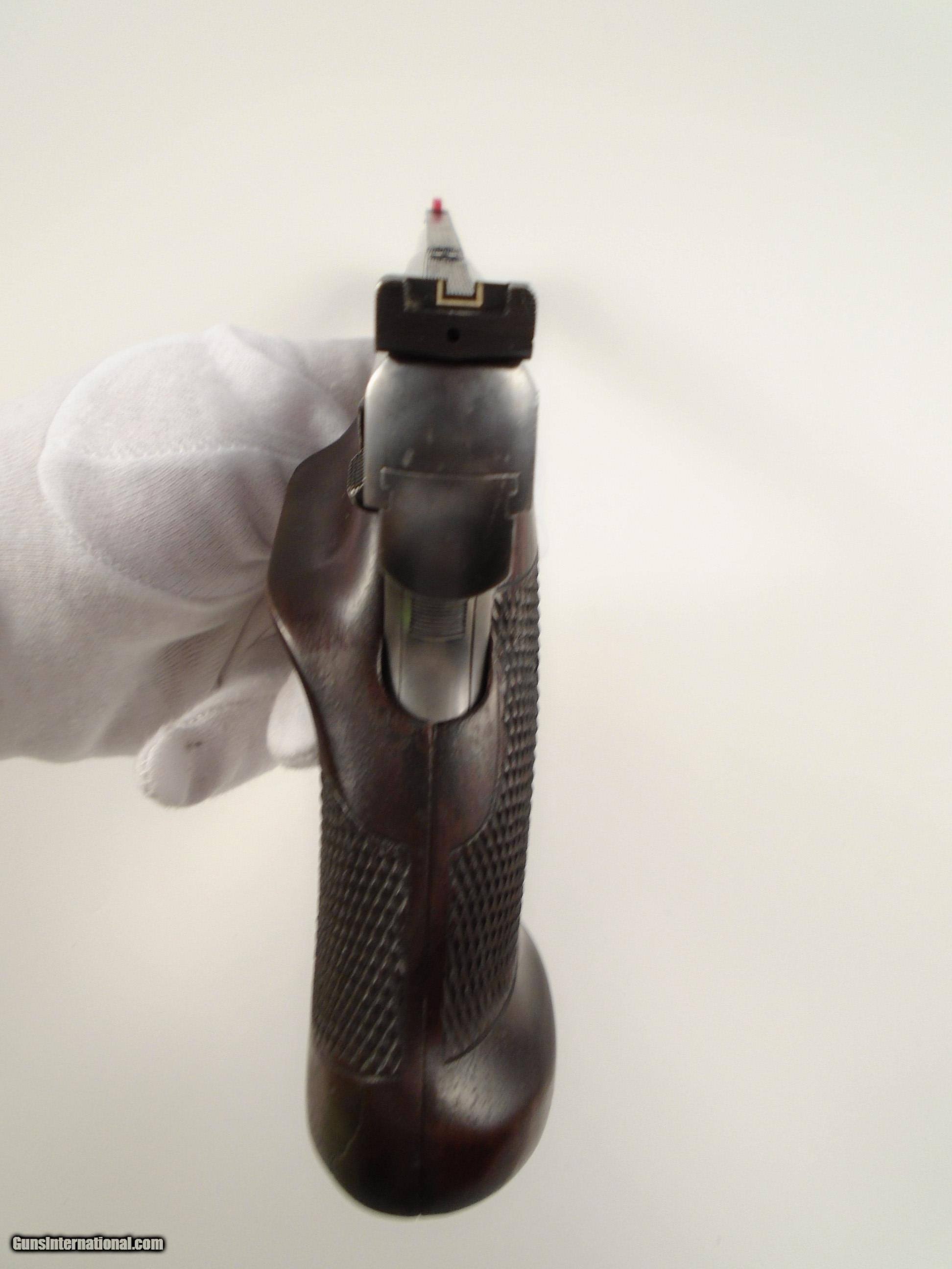 Description: SOLD - Manufactured in 1936 as certified in the accompanying Archive letter, this Colt First Series Woodsman received attention from the fabled King Gun Sight Company of San Francisco, featuring the full-length ventilated rib on top of the barrel with the proper small reflector inset in the rib just behind the red dot front sight. The rib is marked "COLT-KING SUPER TARGET" on the left side, and runs to the fully adjustable rear notch sight. The first ventilated rib for Colt - a concept that Colt eventually took up and used for the Python years later. It wears a set of hand checkered Sanderson American black walnut target stocks with thumbrest. Please view the photos here to evaluate the condition for yourself. C&R eligible. Shipping: $45 No International or California sales. The prop is for display only and not included in sale. Buyer is responsible for knowing their own local and state laws and whether or not you are prohibited from taking possession of, or owning this firearm. By participating, you are attesting to being of at least 21 years of age. ***The purchaser assumes all risks and should have a qualified Gunsmith evaluate the firearm before attempting to shoot it. *** Please contact me within 3 days of close of for payment. Payment must be by bank certified (cashiers) check or Postal Money Order. Shipping & insurance by FedEx is $45 to eligible lower 47 states. Shipping to AK or HI will have additional costs for which buyer is responsible. I will need a copy of an FFL dealer license or, if eligible, a C&R with copy of Driver’s License to ship the gun. There is a 3 day, no-shoot, no disassembly inspection period and the buyer is responsible for cost of shipping both ways if returned. If your FFL dealer does not accept shipment from an individual, I will need an additional $35 to ship through my FFL. SOLD Curio/Relic: Yes Handgun Caliber: .22 Long Rifle Manufacturer: Colt Model: Woodsman Stock: Sanderson Rib: King Super Target |