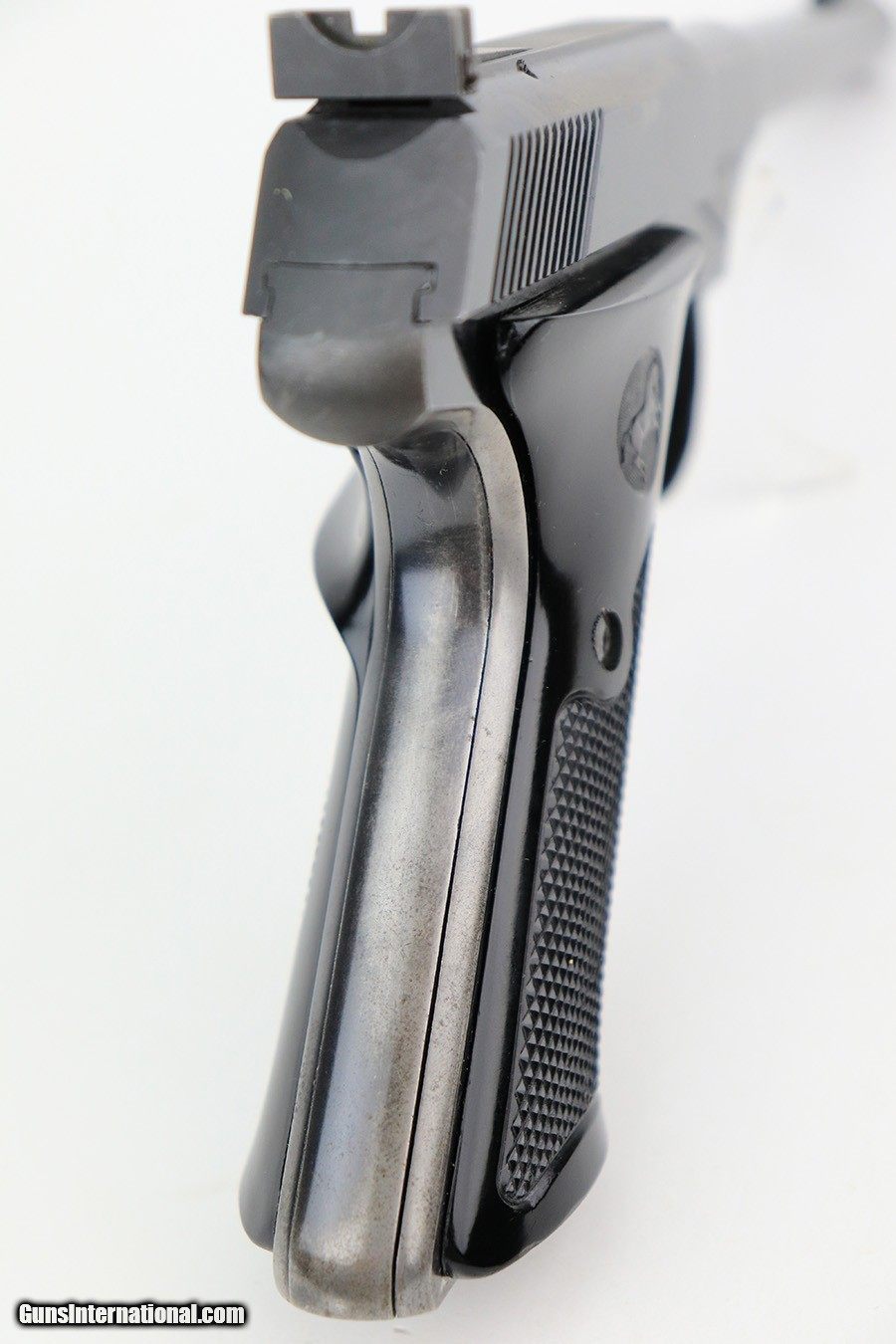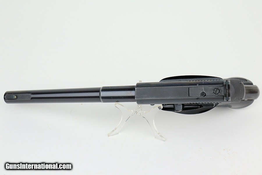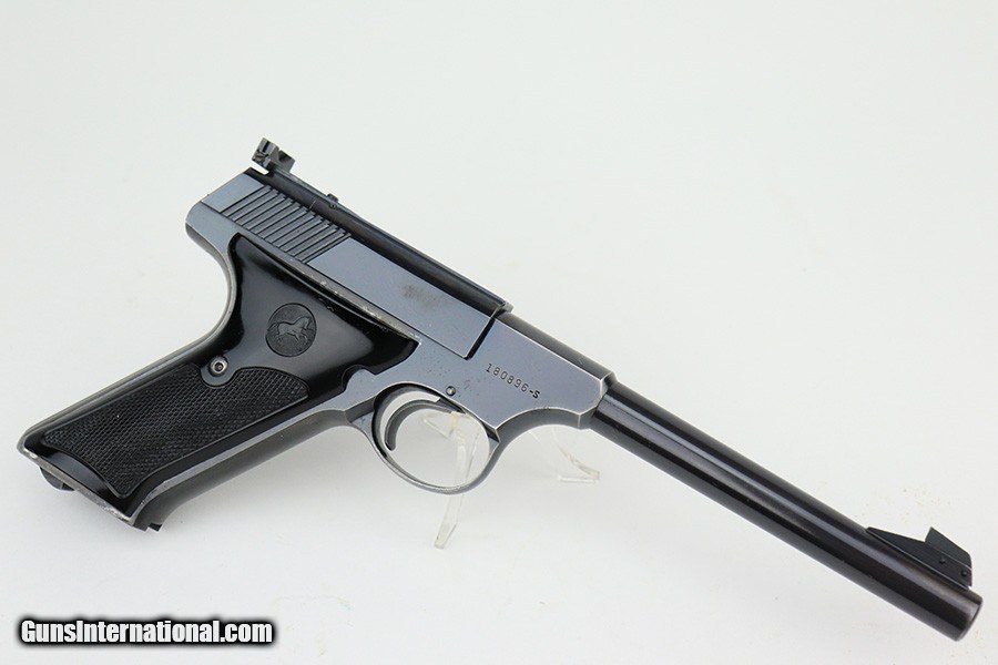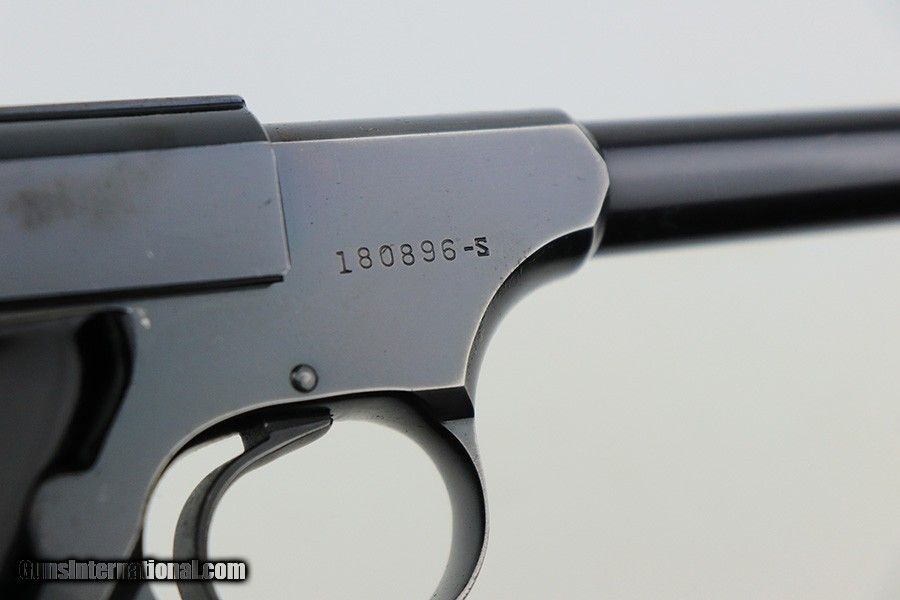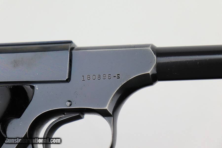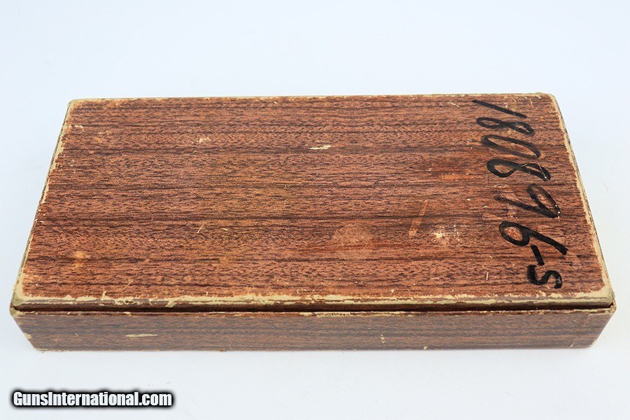 Description: This is very nice example of a Colt Woodsman manufactured in 1957. It is all matching and comes with its original matching-numbered box, matching test target, owners manual, and one proper magazine. It has retained about 92-93% of its original high polish finish. Most of the finish loss is on the back strap, so the profile views are minty. There is minor wear on the underside of the trigger guard and hints of wear on the high the edges. A couple of tiny spots of discoloration on the slide. Comes with excellent period-correct black plastic grips. Mint bore. SOLD Handgun Caliber: .22 Long Rifle Bore: Mint Condition: ~92-93% |