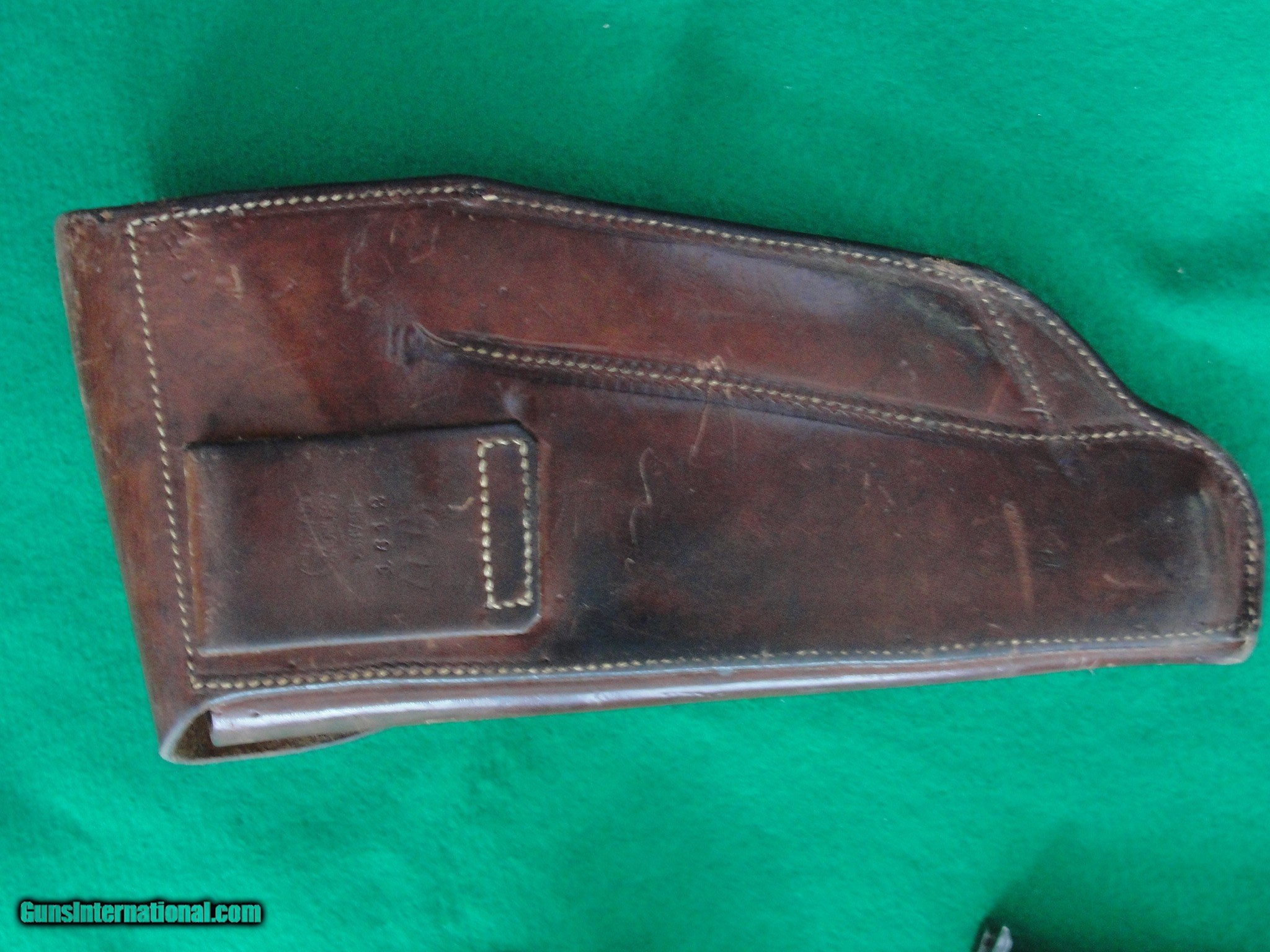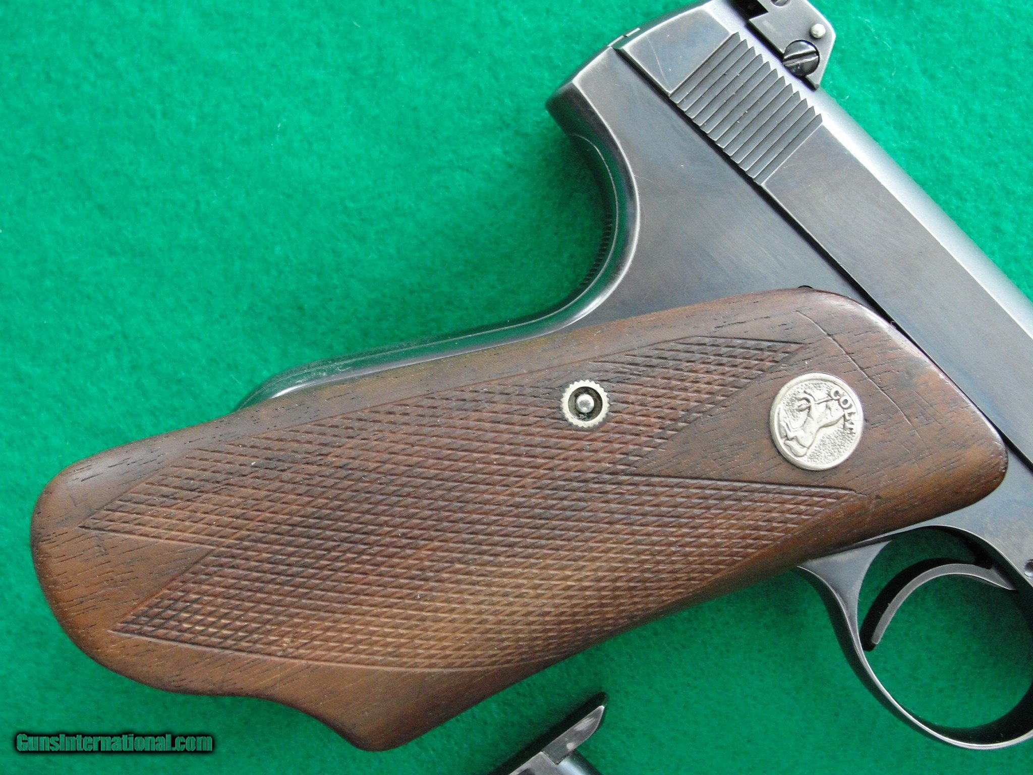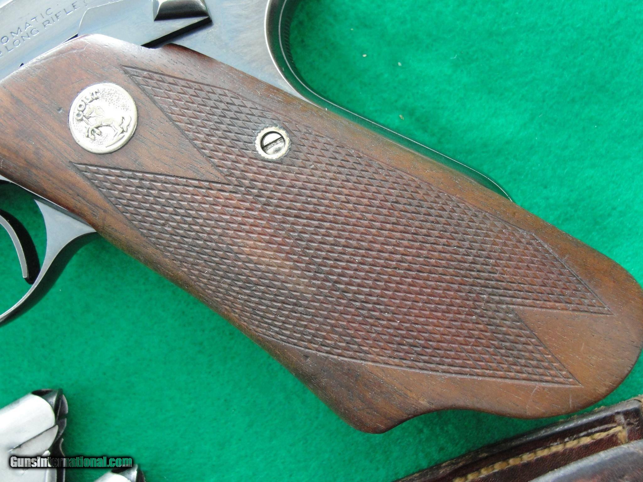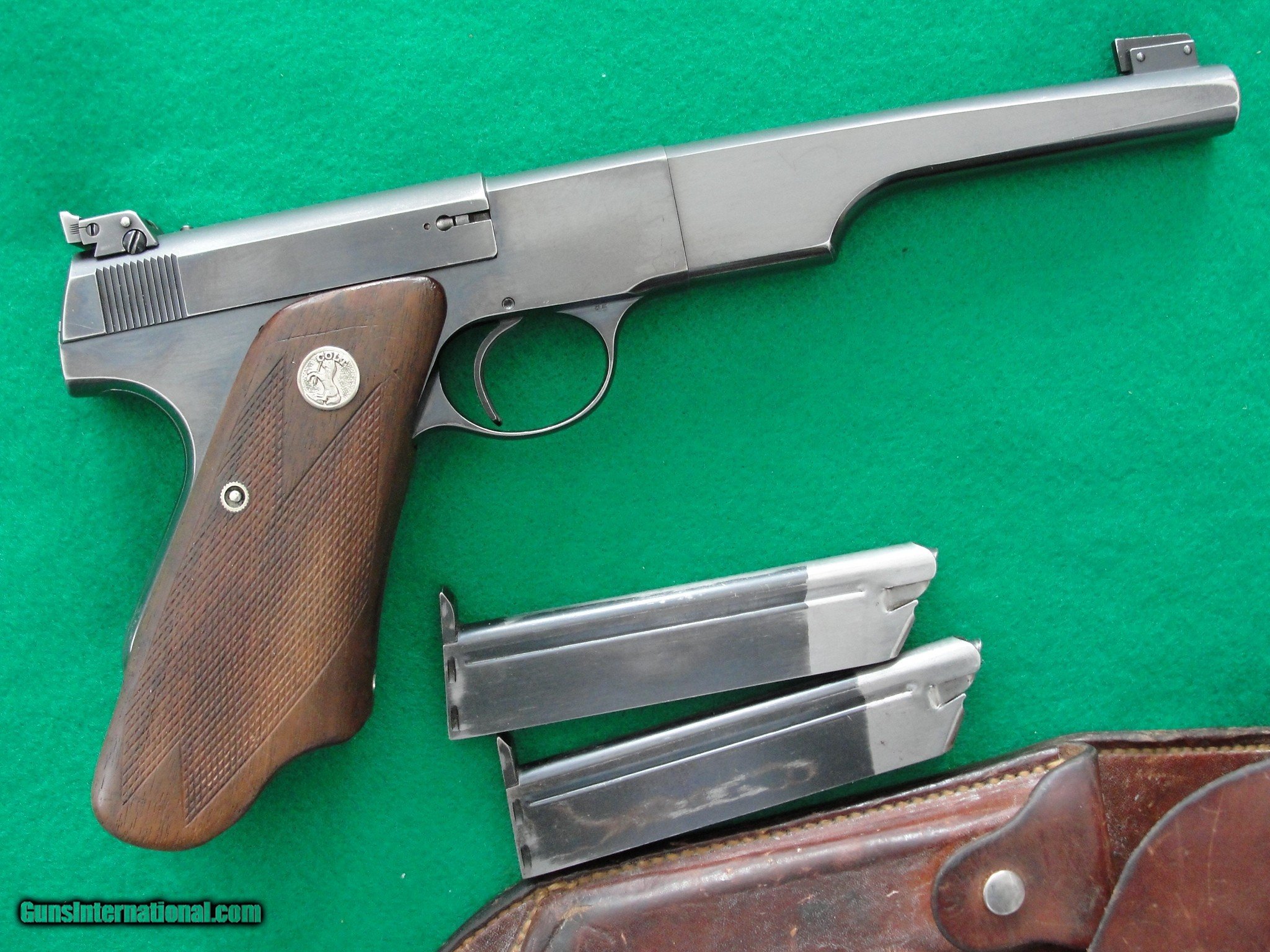Description: Nice vintage Colt target pistol, great grips, vintage Colorado Saddlery holster, and two factory magazines. Mechanically fine, beautiful bore. Shiny, glossy finish, with mild holster wear. #MT60xx made 1939. CA sales welcome, C&R OK in most areas. Email or call for more details. SOLD |