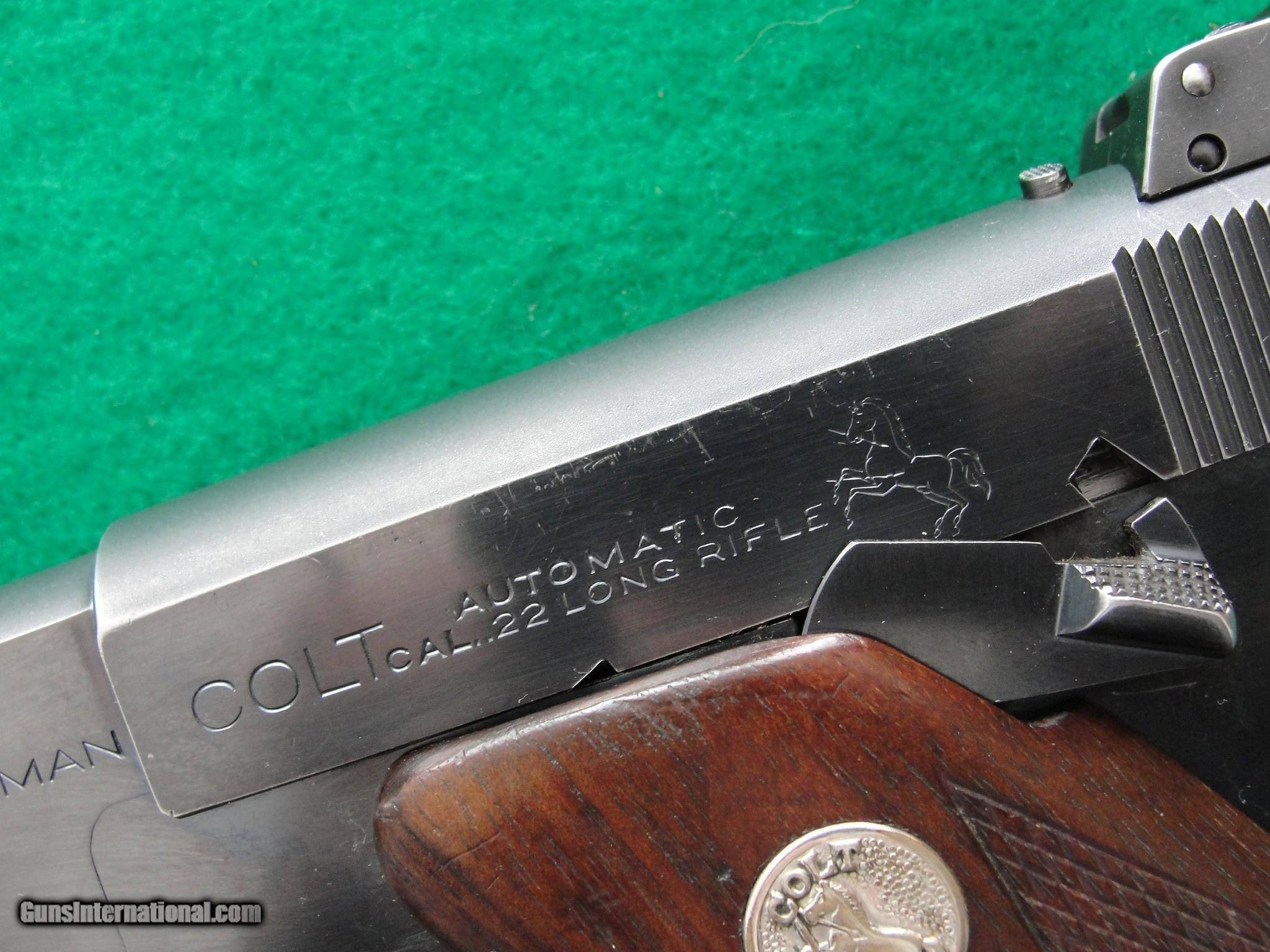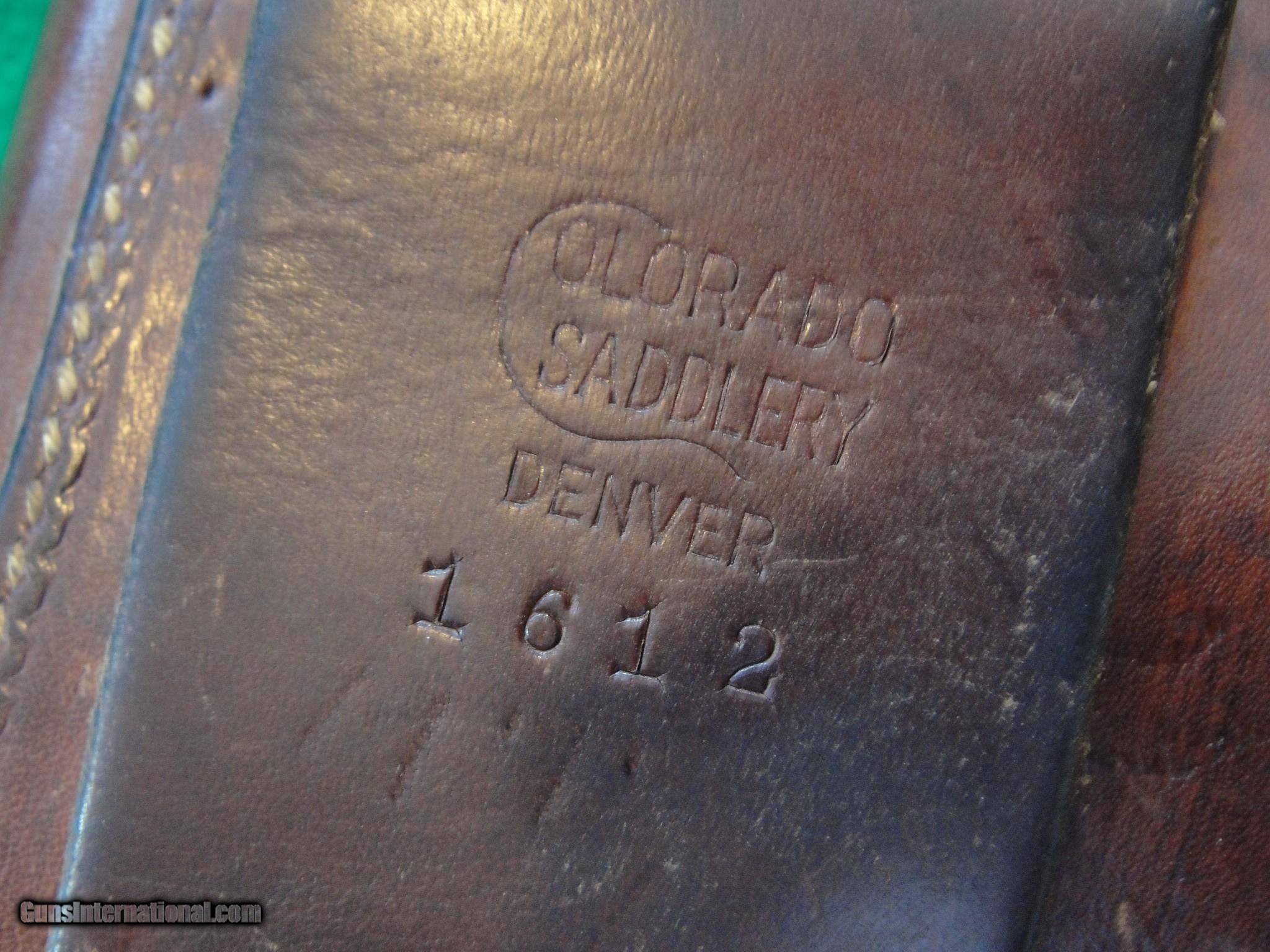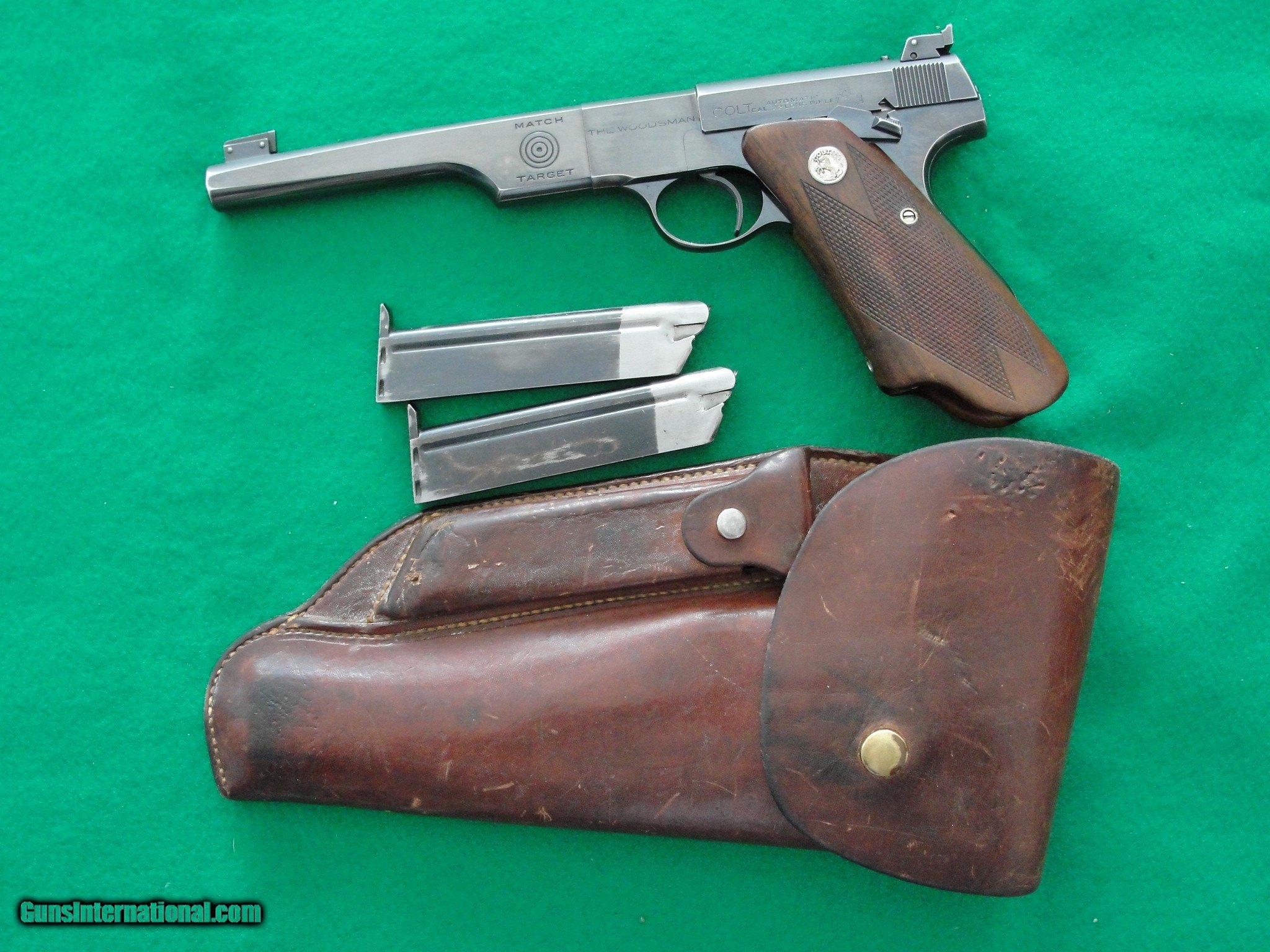 Description: Nice vintage Colt target pistol, great grips, vintage Colorado Saddlery holster, and two factory magazines. Mechanically fine, beautiful bore. Shiny, glossy finish, with mild holster wear. #MT60xx made 1939. CA sales welcome, C&R OK in most areas. Email or call for more details. SOLD |