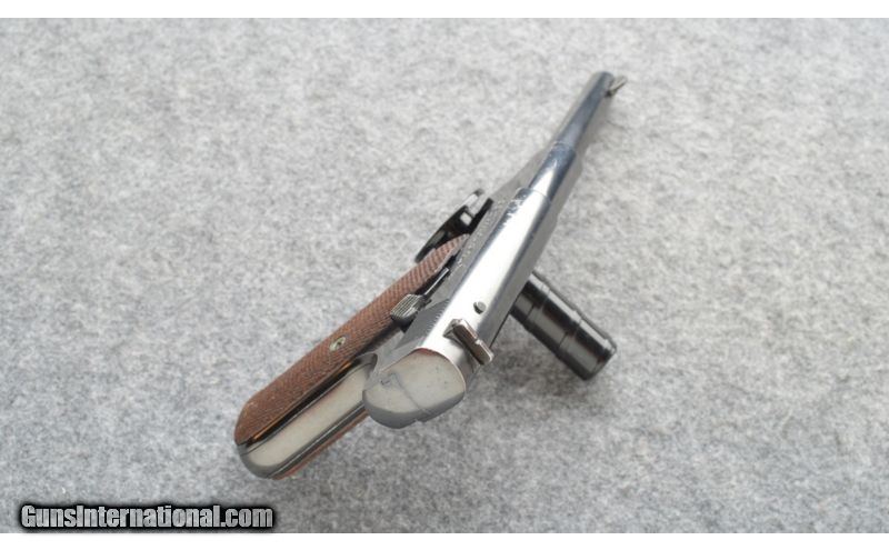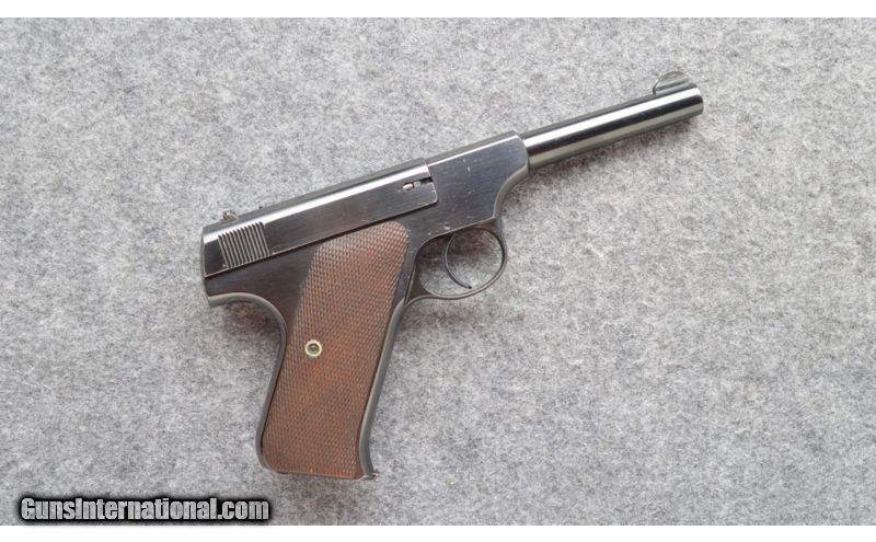 Description: Pre Woodsman. Original 10 round magazine. .22 LR standard velocity ammo. SOLD Curio/Relic: Yes Manufacturer: 1917-1918 Caliber Info: .22 LR Metal Condition: 85% Wood Condition: Excellent Bore Condition: Bright and shiny with rifling Barrels: 4.5" Pencil barrel Stock: Diamond checkered wood panels Weight: 1.6 LB Sights: Factory Iron. Non adjustable Item Location: Sidney, NE |