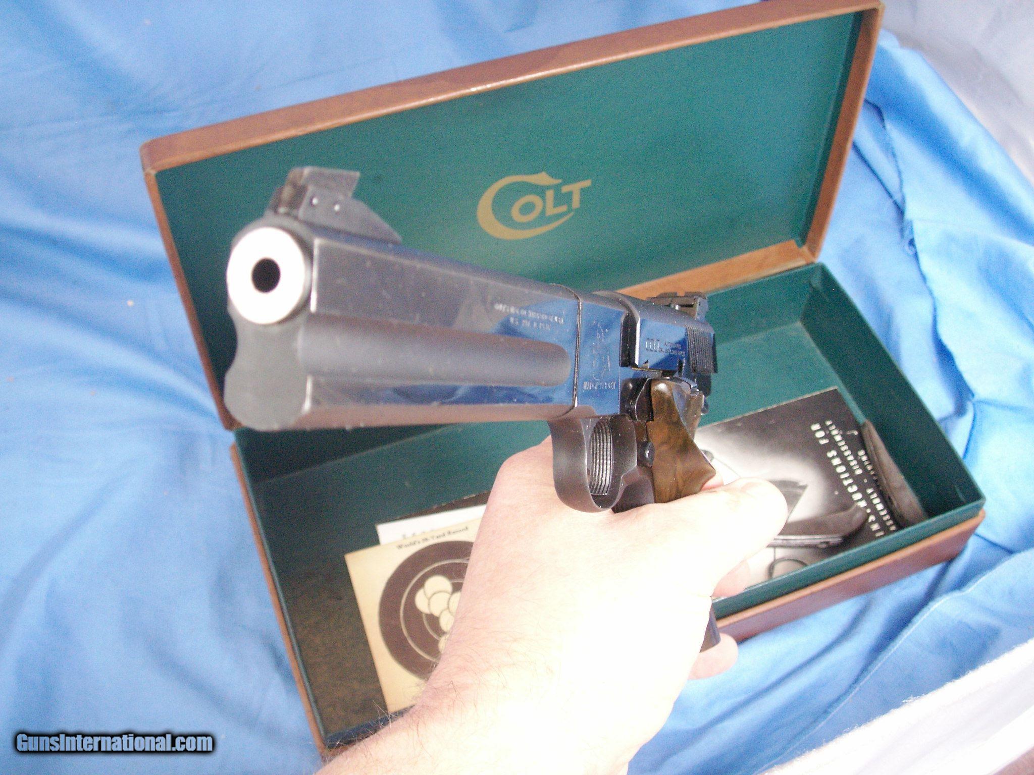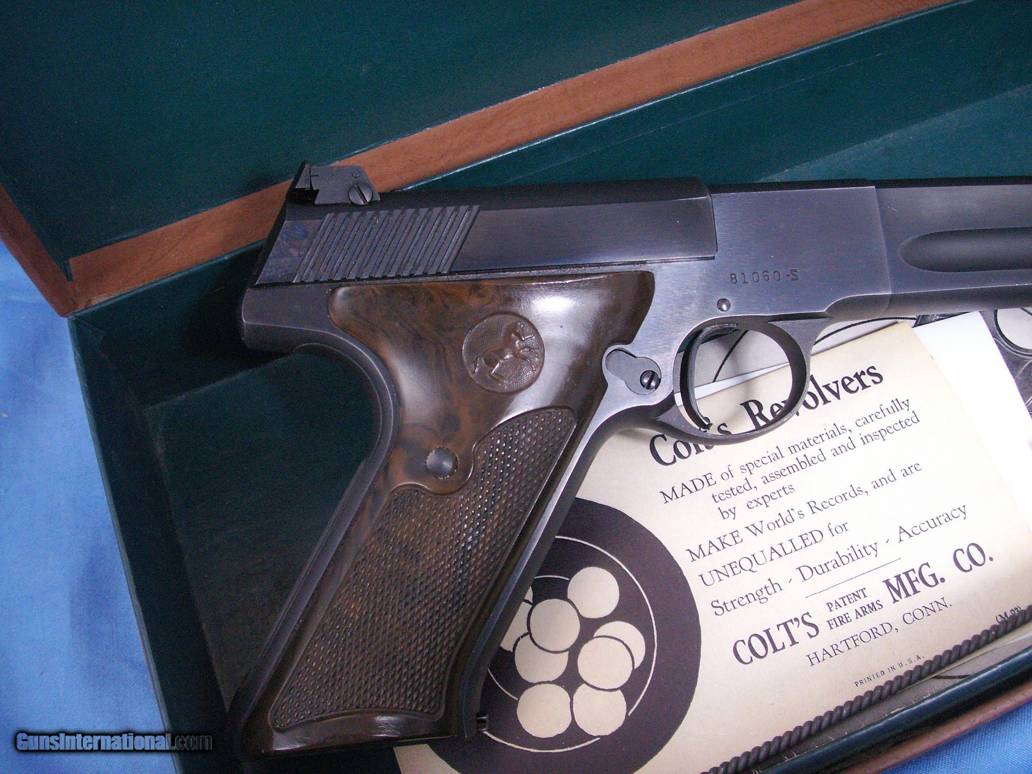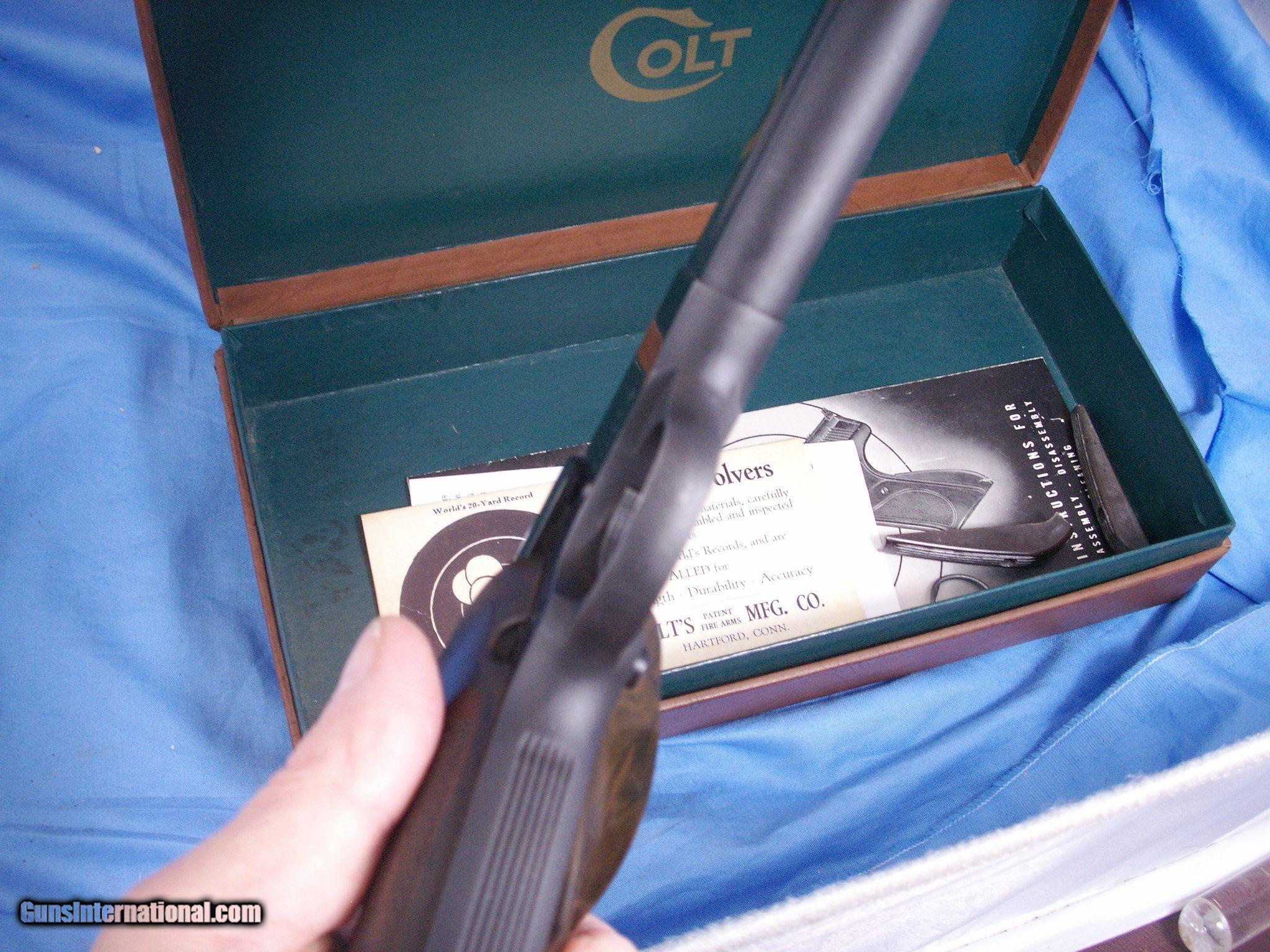 Description: For Sale Colt 2nd SeriesWoodsman Match Target Pistol that was manufactured in 1950. It is in .22 LR caliber with a 6" barrel. This is rated at 97% original condition with box (no label), two grip adapters, cleaning brush, manual and pamphlets. The bore and mechanics are in excellent condition as are the verigated reddish brown grips. These 2nd series Match Target pistols are the most desireable to collectors because of the push button magazine release like the venerable 1911's. A great investment and super addition to any firearms collection. SOLD Curio/Relic: Yes |