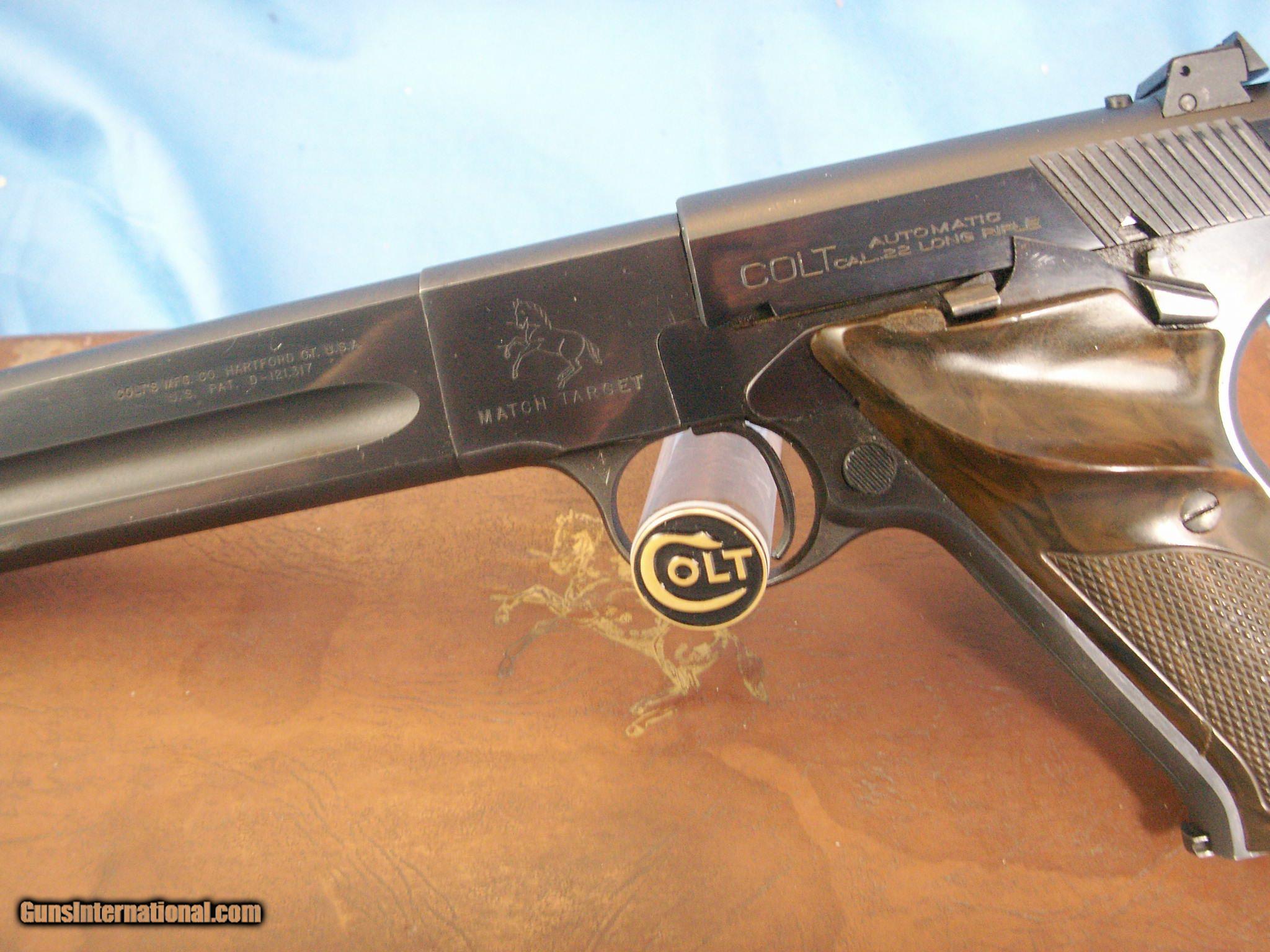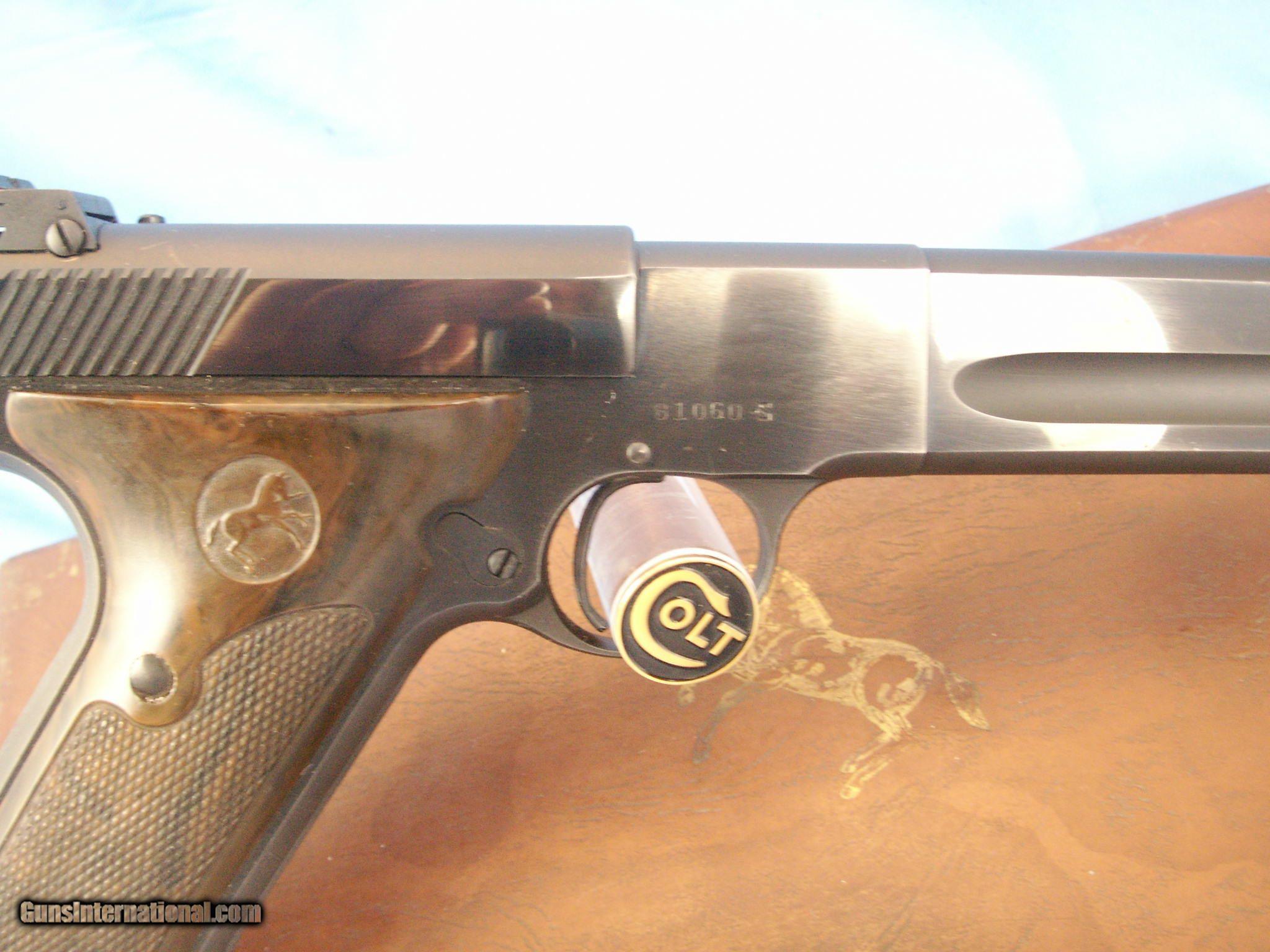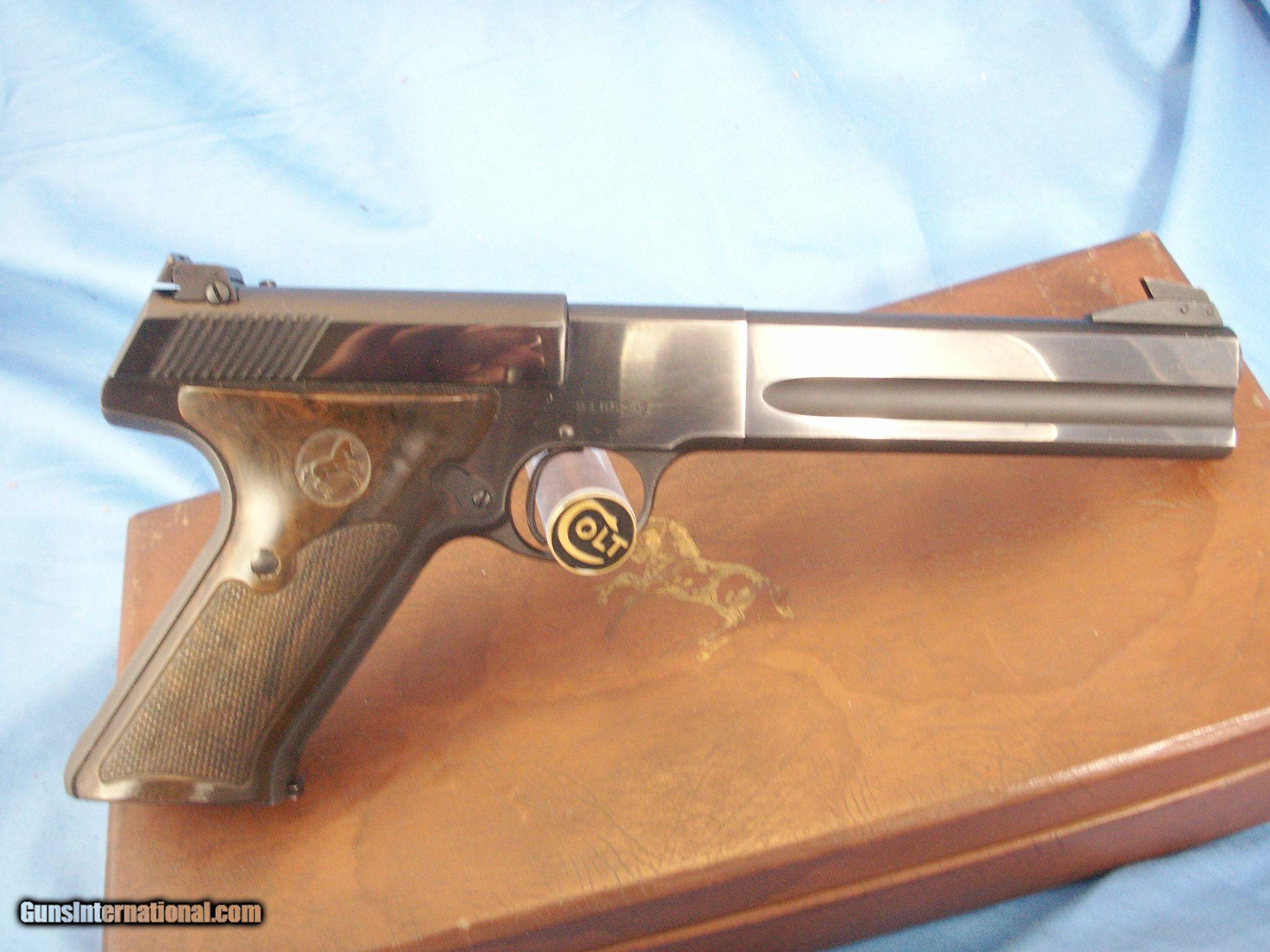 Description: For Sale Colt 2nd SeriesWoodsman Match Target Pistol that was manufactured in 1950. It is in .22 LR caliber with a 6" barrel. This is rated at 97% original condition with box (no label), two grip adapters, cleaning brush, manual and pamphlets. The bore and mechanics are in excellent condition as are the verigated reddish brown grips. These 2nd series Match Target pistols are the most desireable to collectors because of the push button magazine release like the venerable 1911's. A great investment and super addition to any firearms collection. SOLD Curio/Relic: Yes |