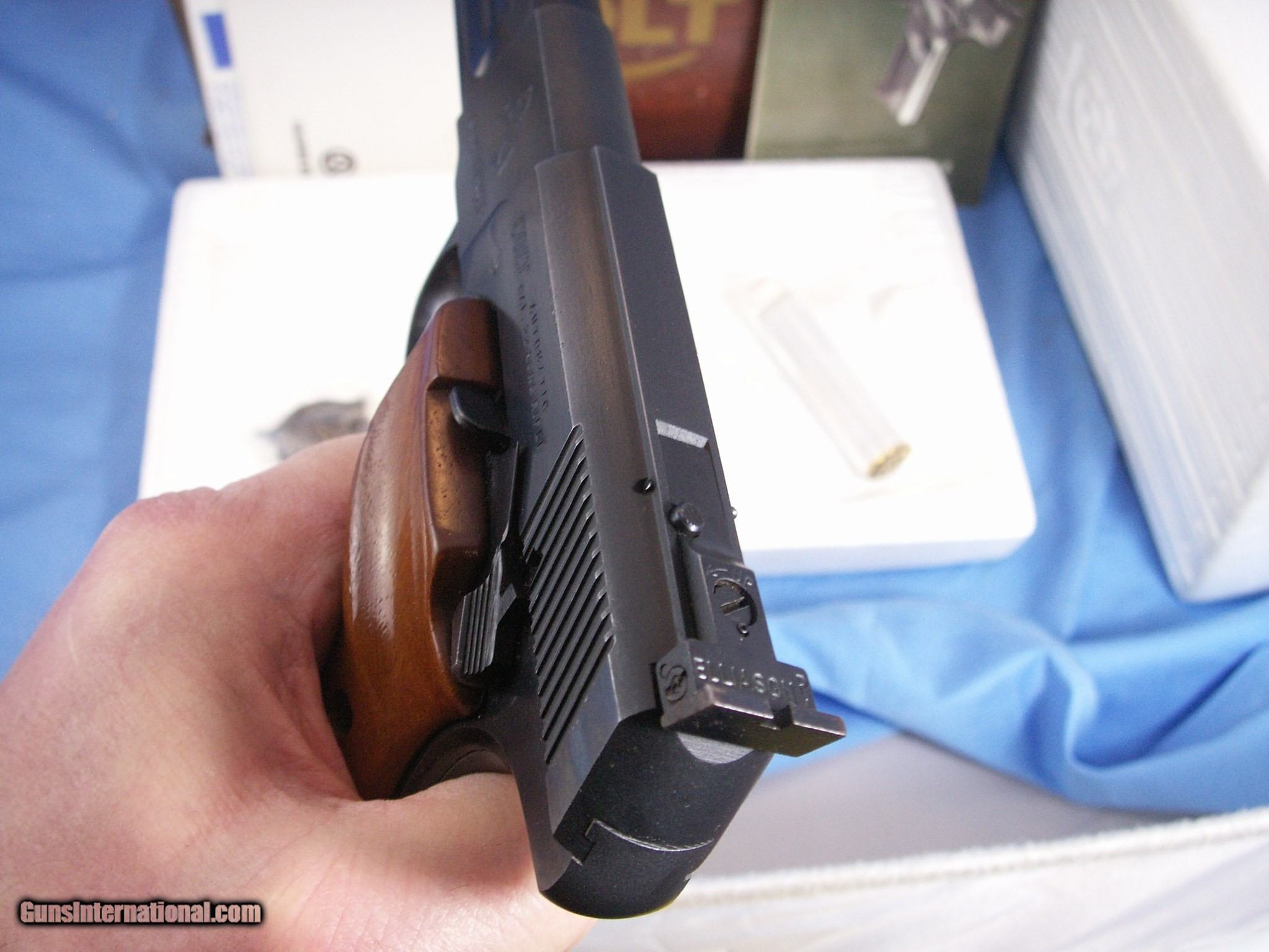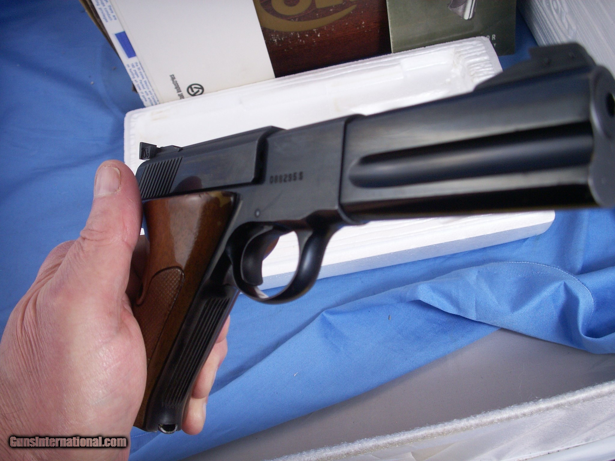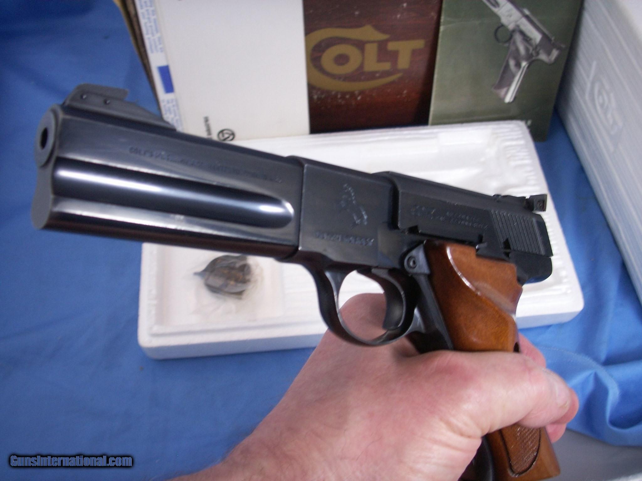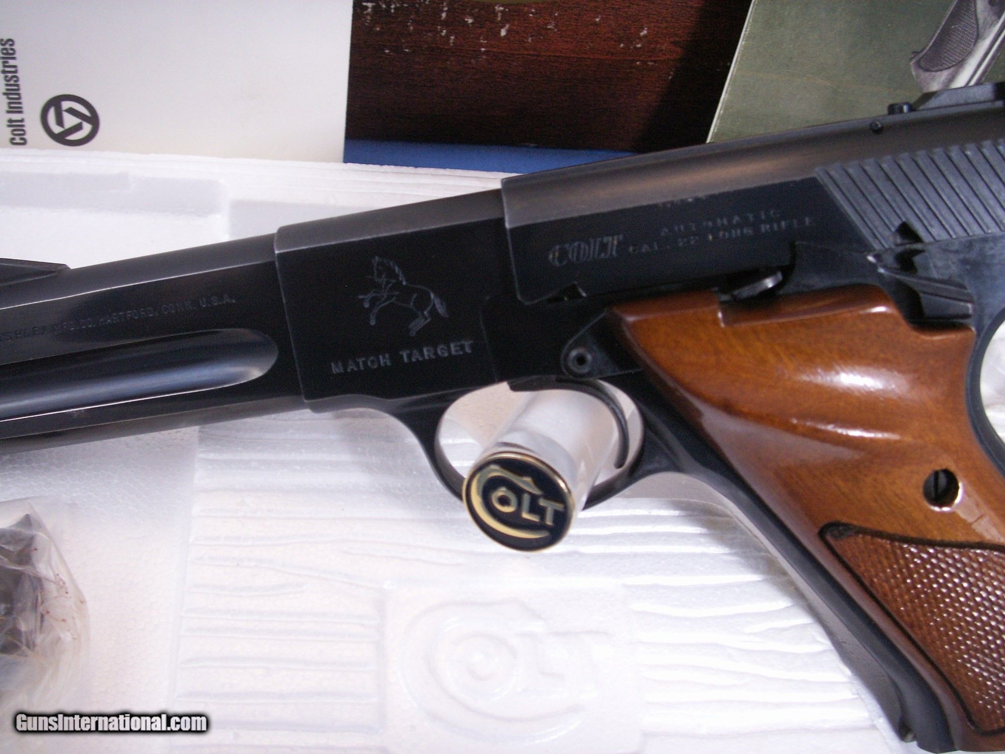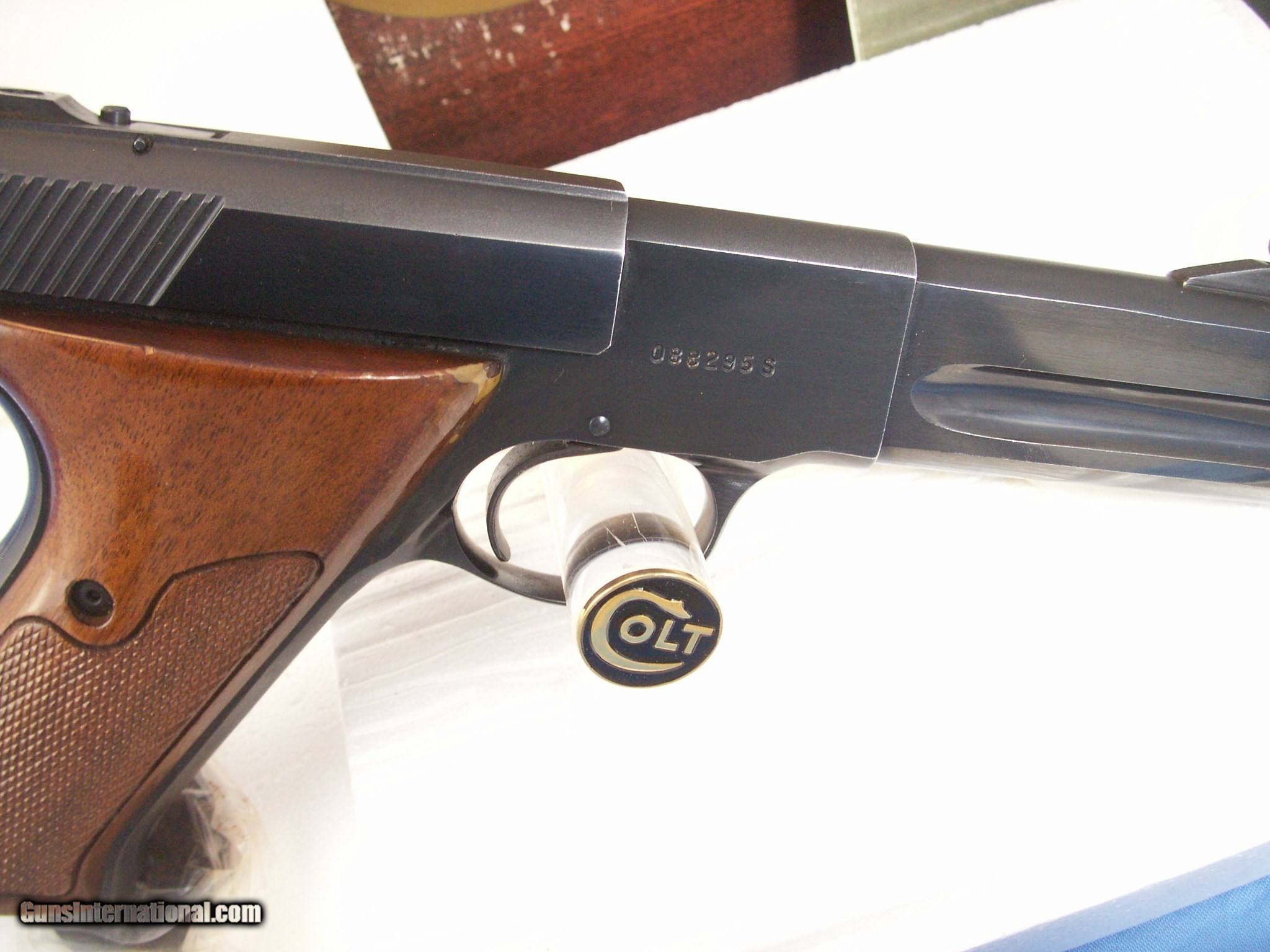 Description: SOLD PENDING FUNDS: Colt 3rd Series Woodsman Match Target. This is in .22 LR caliber with the desireable 4.5" barrel. It is rated at 97% original condition with excellent mechanics and bore. It comes with the Wood grain/styro foam box with all the papers and Colt screwdriver. The box label is comming off and the portion that had the serial number is gone. Therefore I can not definitively say this is the original box, but is period correct for a Colt Wodsman Match Target produced in 1976. This is a great collectable Colt Woodsman in the most desireable configuration. Please see my other listings for more collectable firearms. SOLD |