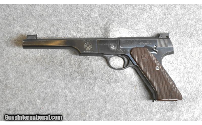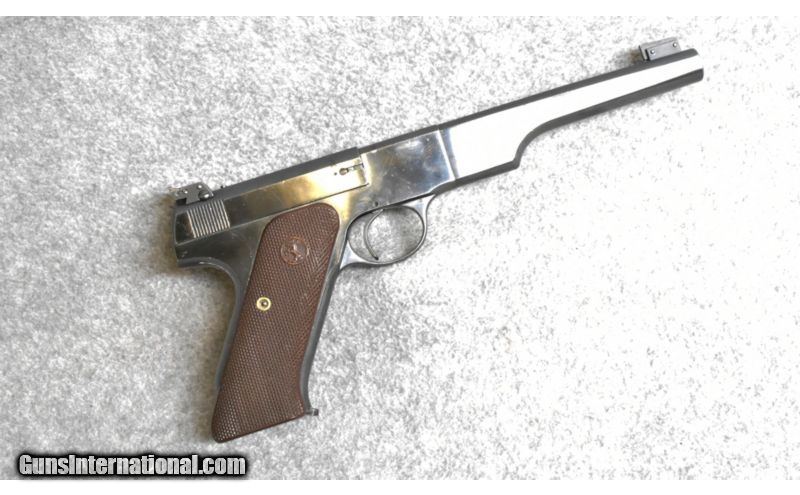Description: Colt Match Target Woodsman, 1939 production, extended ear grips. SOLD Manufacturer: 1939. Caliber Info: .22 LR. Metal Condition: Good, bluing worn off in various areas, scratches and dings. Wood Condition: Very good, some handling wear. Bore Condition: Strong rifling. Barrels: 6 1/2 inch. Triggers: Single curved trigger. Stock: Extended checkered wood ear grips. Weight: 36 oz. Sights: Pinned blade front, adjustable U-notch rear. Item Location: Kansas City, KS |
