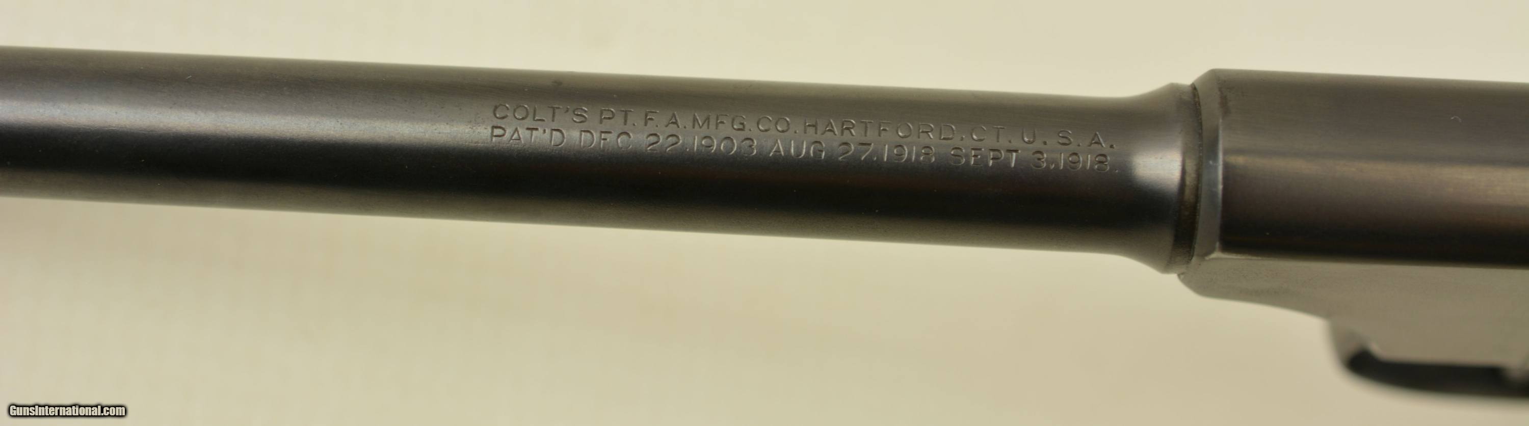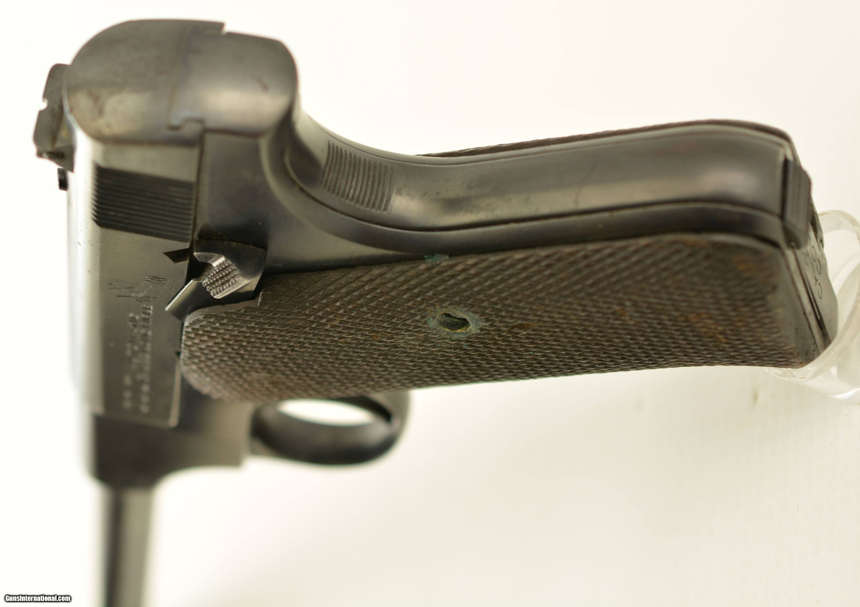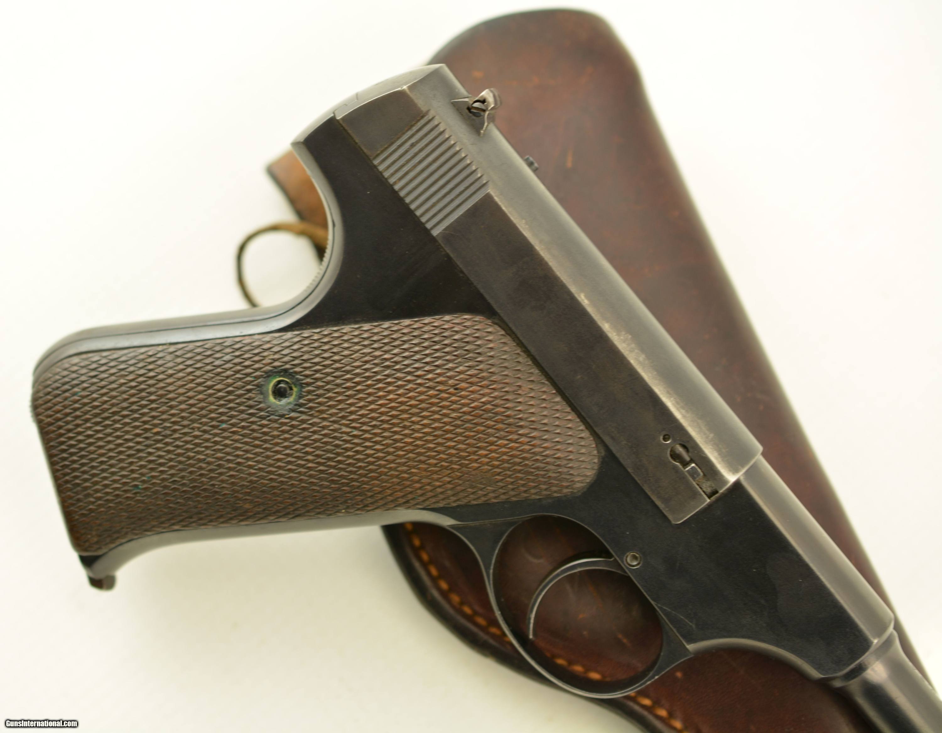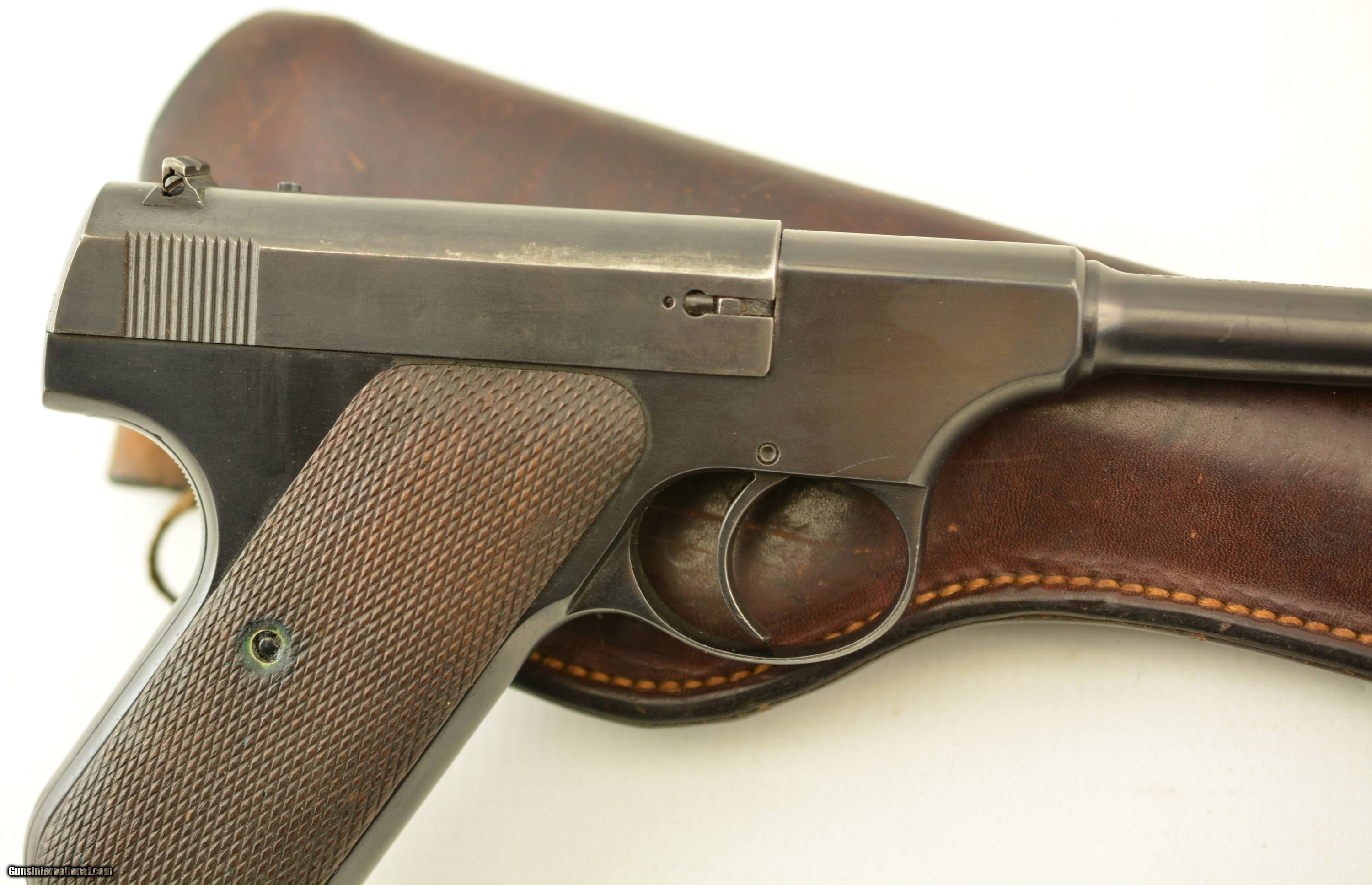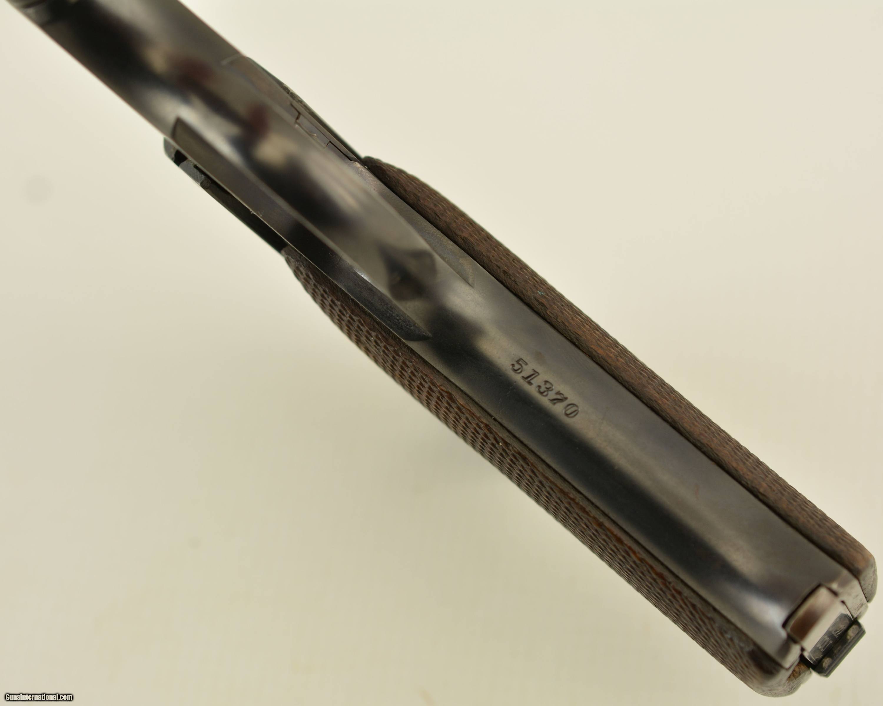 Description: Serial #51370, .22 LR, 6 1/2" barrel with an excellent, bright bore. This is a 1927-made pistol that retains 85-90% of a mixed original blue on the barrel and some of the frame components, with a well done reapplied blue finish on the balance. There is some silvering at the muzzle, and along a few of the high edges and projections. The slide is numbered to the gun and has some graying on both the face of the slide and the barrel breech face. The pistol is outfitted with the later, smokeless mainspring housing (correct for this very late production pistol). The original checkered walnut grips are in fine shape with only minor handling blemishes and some mild flattening of the points on either panel. The pistol is housed in a period, dark brown H.H. Heiser holster that is in fine condition with only a few minor surface scuffs and scratches. The pistol comes with a single original two-tone magazine, and is a very good-fine example of a desirable, late model Pre-Woodsman. FFL or C&R SOLD Curio/Relic: Yes Manufacturer: Colt Model: Woodsman Serial Number: 51370 Caliber Info: .22 Gauge Info: .22 |