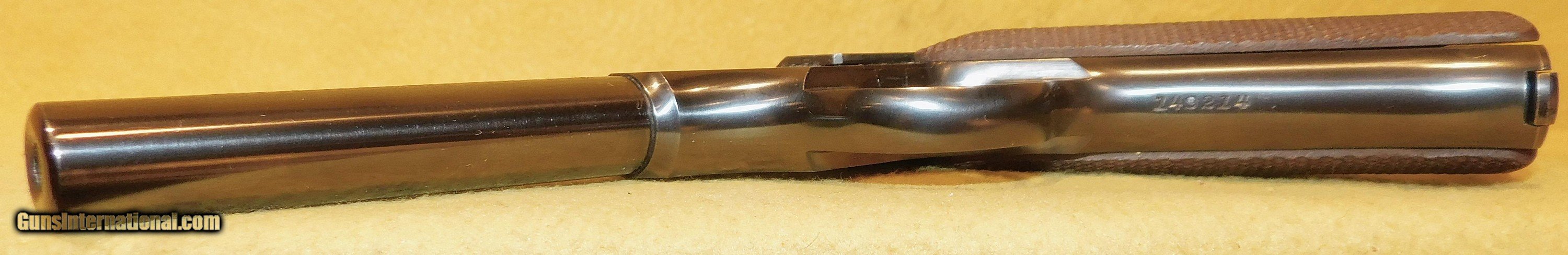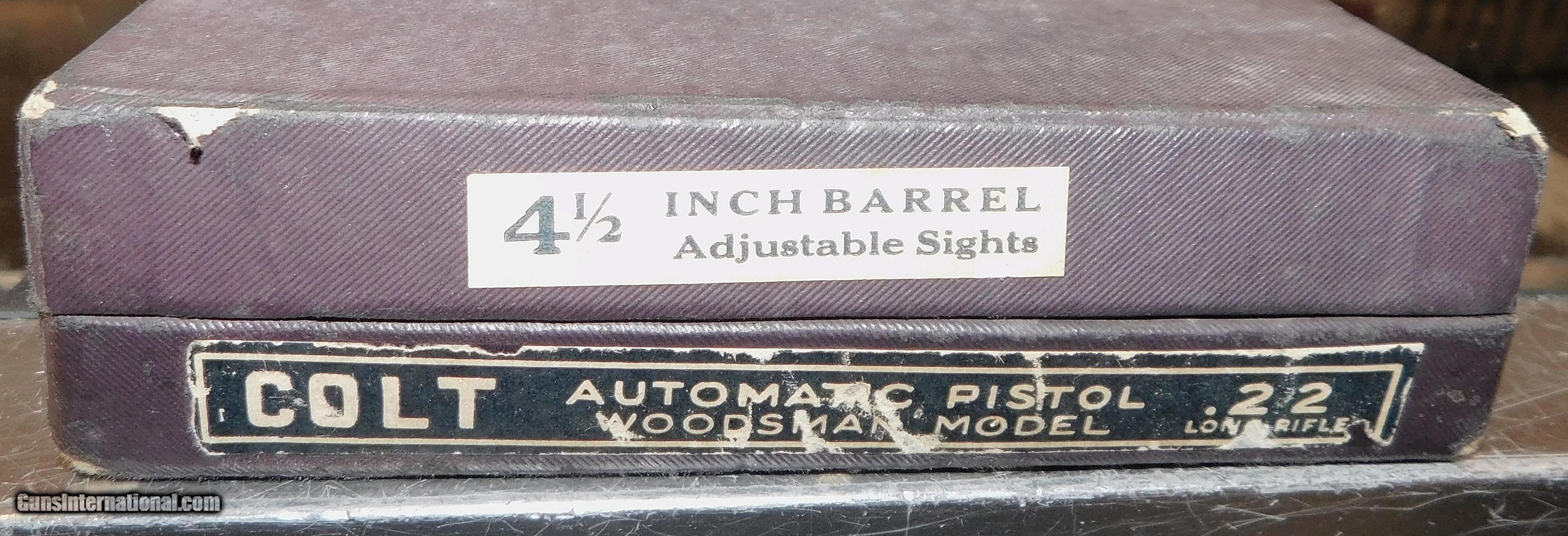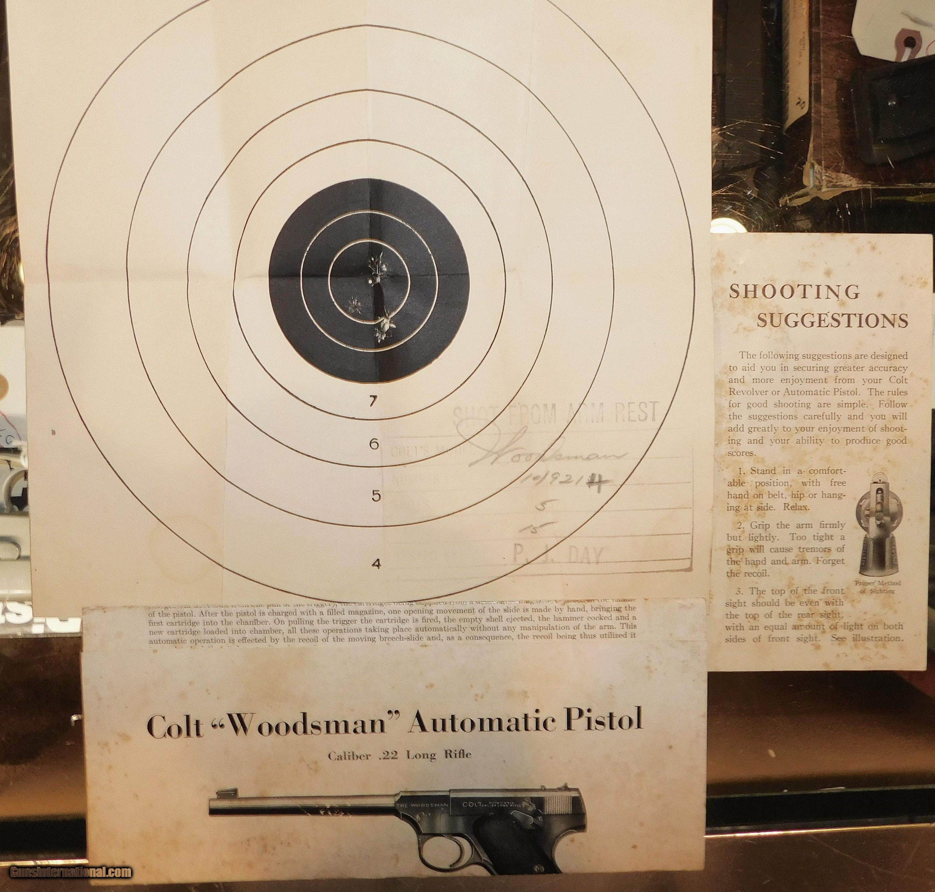 Description: COLT (PRE WAR) THE WOODSMAN (1ST SERIES) IN .22 L.R. CAL., WITH 4 .5" BARREL. COLOR BLUE. CONDITION 98% LIKE NEW. SERIAL NUMBER 149214. COLT MODEL THE WOODSMAN (PRE WAR) 1ST SERIES (CIRCA 1941) IN .22 L.R. CALIBER, CHECKED WALNUT GRIPS EXCELLENT, MIRROR BORE, COMES WITH ONE FACTORY MAGAZINE, TEST TARGET, PAPERS, WRAPPED GLEANING ROD, SERIAL NUMBERED BOX, 98% LIKE NEW OVERALL CONDITION, OUR STOCK # D7858 SOLD |