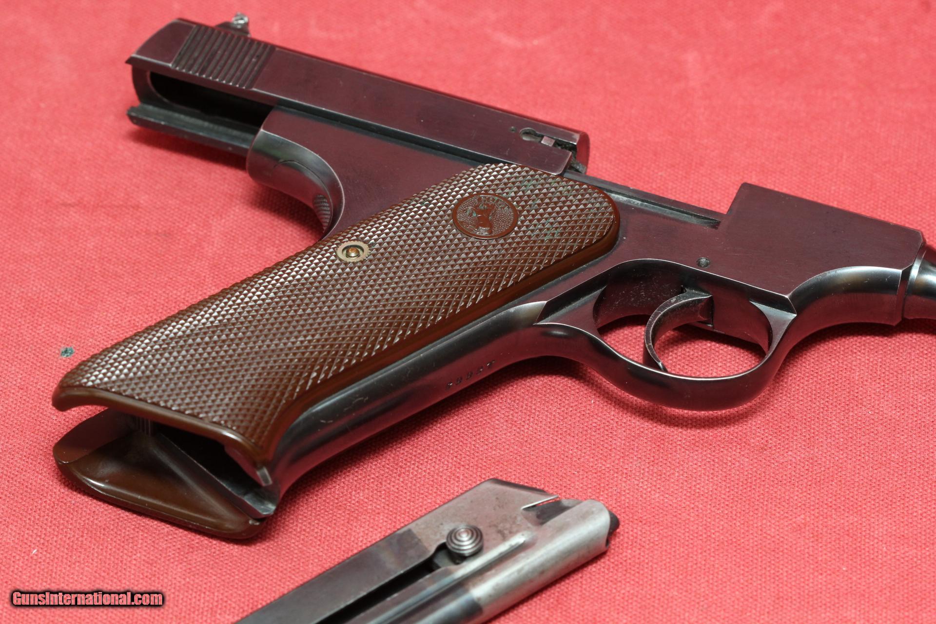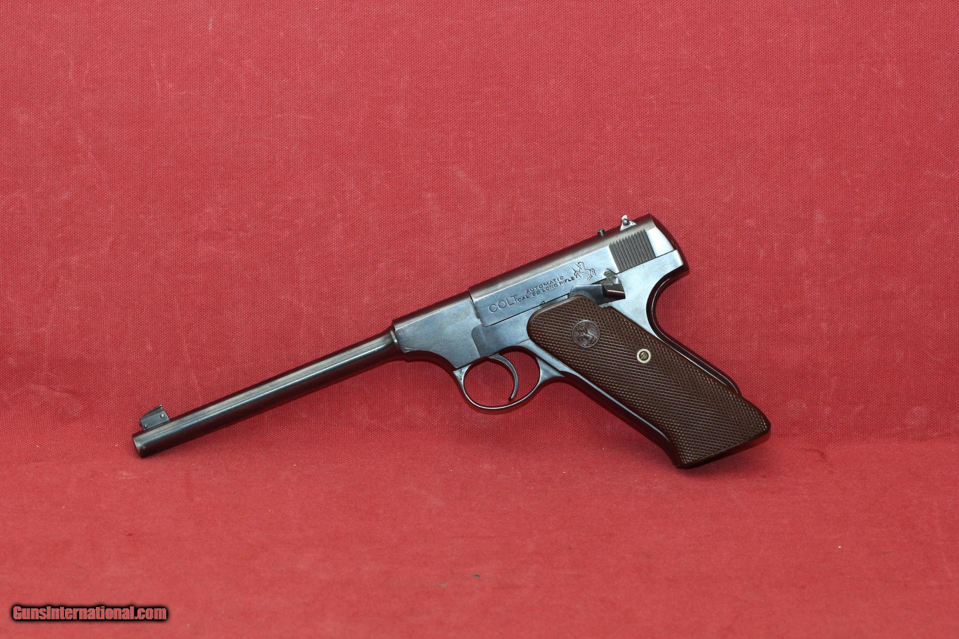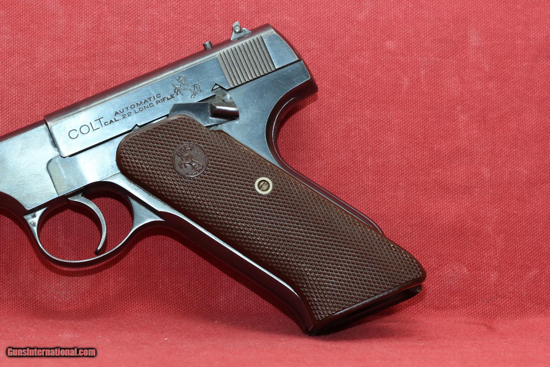 Description: 22lr, serial number 186XX. 6 5/8" pencil barrel, bottom mag release. Non-original Colt checkered plastic grips. Overall in very good condition. Metal shows light wear, slighly heavier on sharp edges. Heavier wear at muzzle and right side under front sight. Pin-point pitting on right side of frame. Bore is excellent. Non-original grips are in very good condition, no cracks or heavy marring. More photos on request. Sold as-is, no returns. Please add $35.00 for shipping and insurance. SOLD |