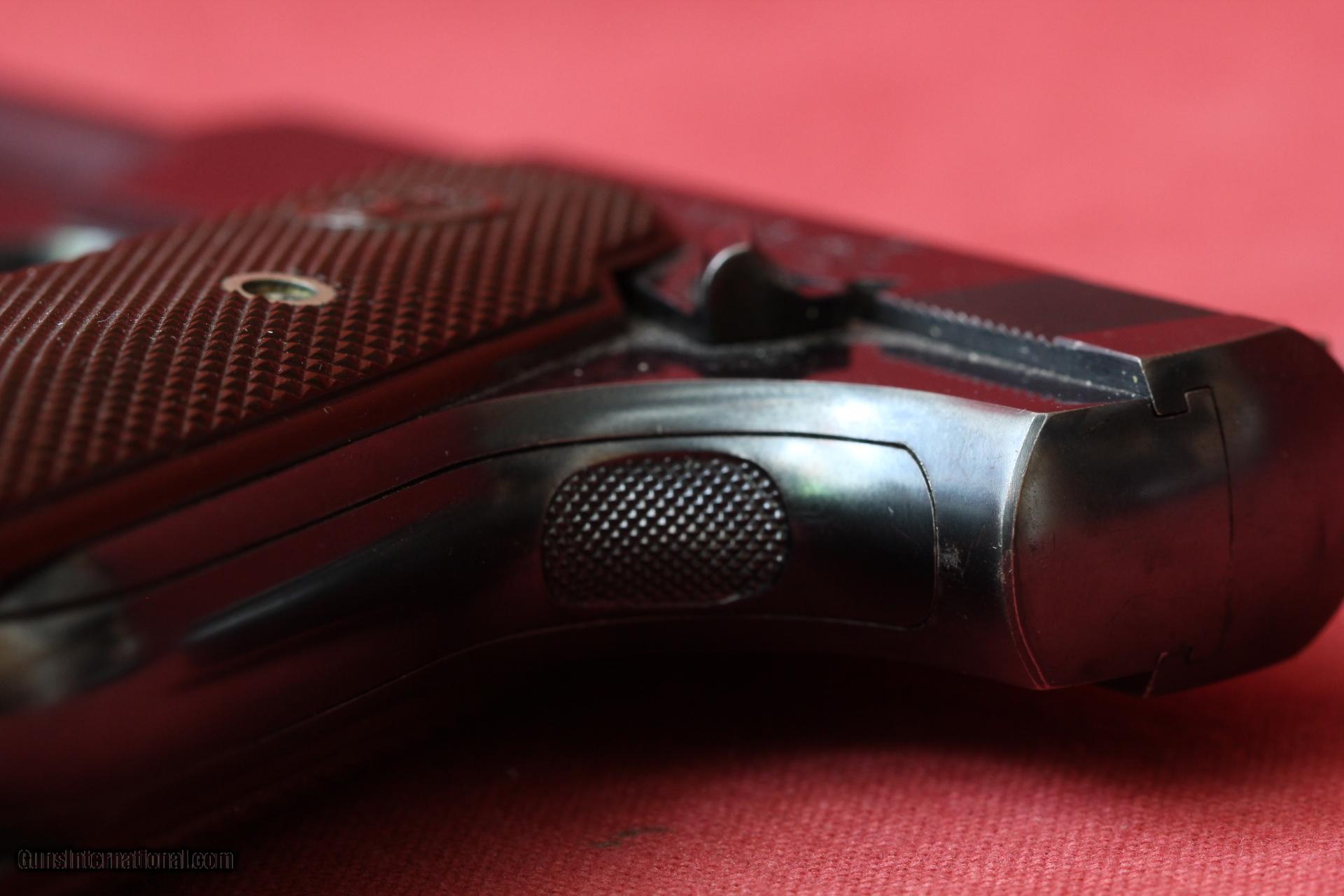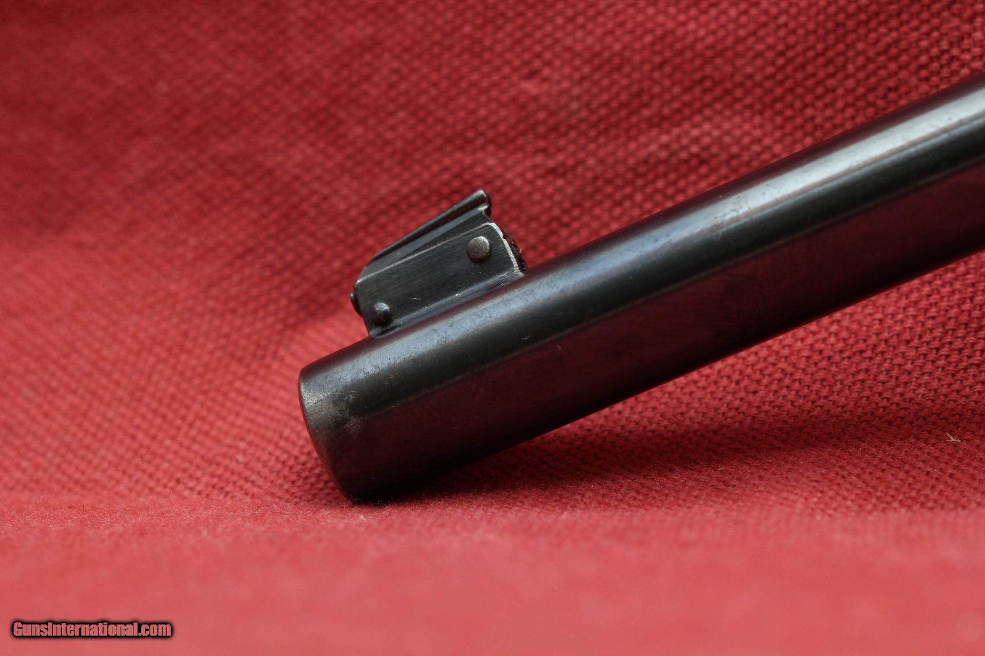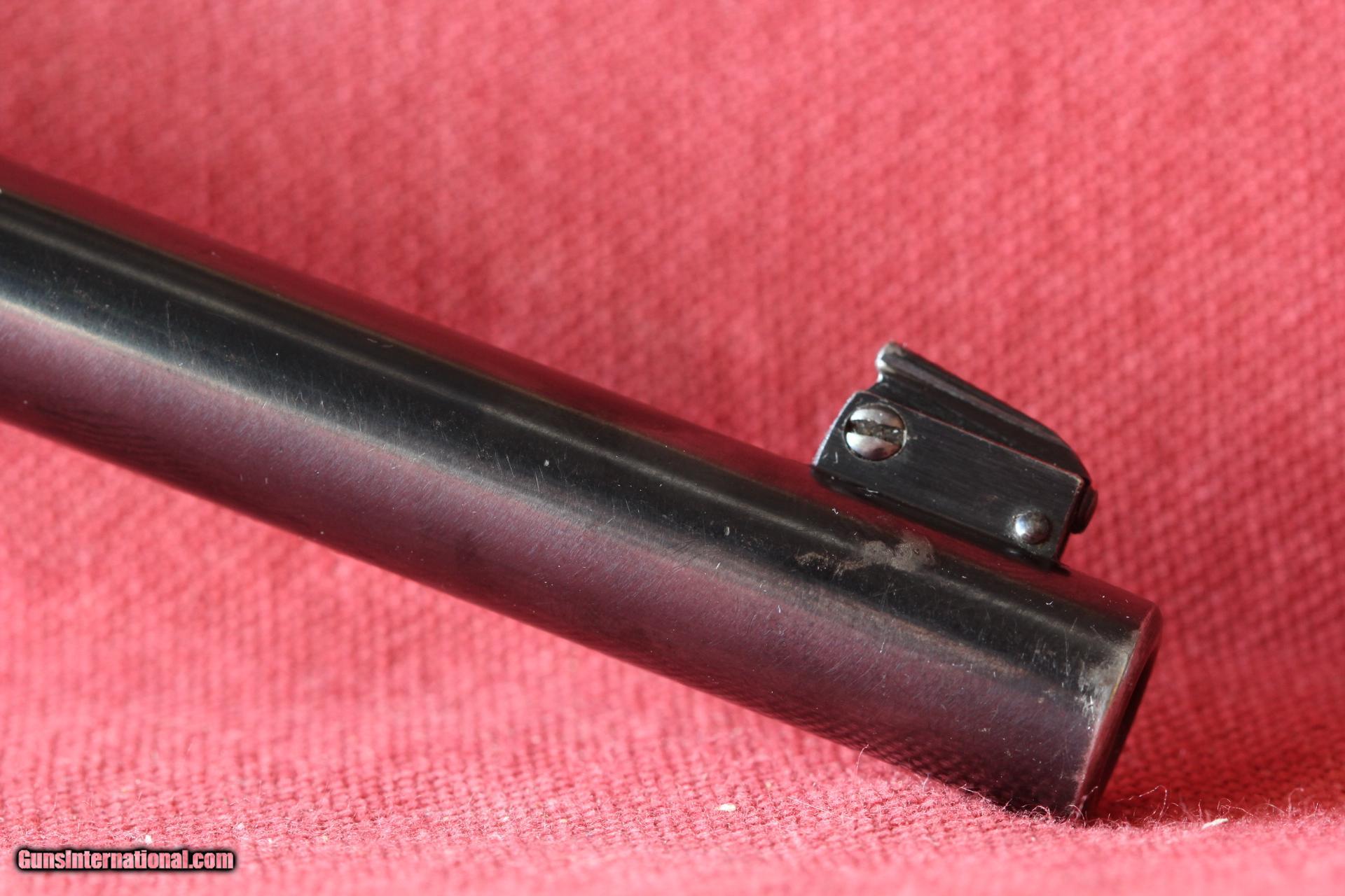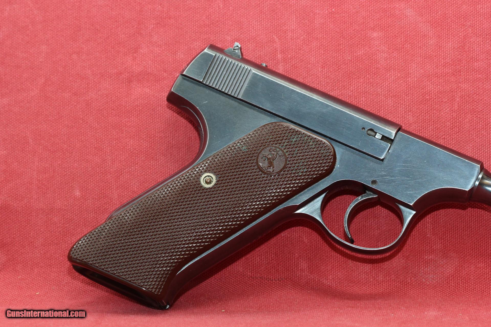Description: 22lr, serial number 186XX. 6 5/8" pencil barrel, bottom mag release. Non-original Colt checkered plastic grips. Overall in very good condition. Metal shows light wear, slighly heavier on sharp edges. Heavier wear at muzzle and right side under front sight. Pin-point pitting on right side of frame. Bore is excellent. Non-original grips are in very good condition, no cracks or heavy marring. More photos on request. Sold as-is, no returns. Please add $35.00 for shipping and insurance. SOLD |
