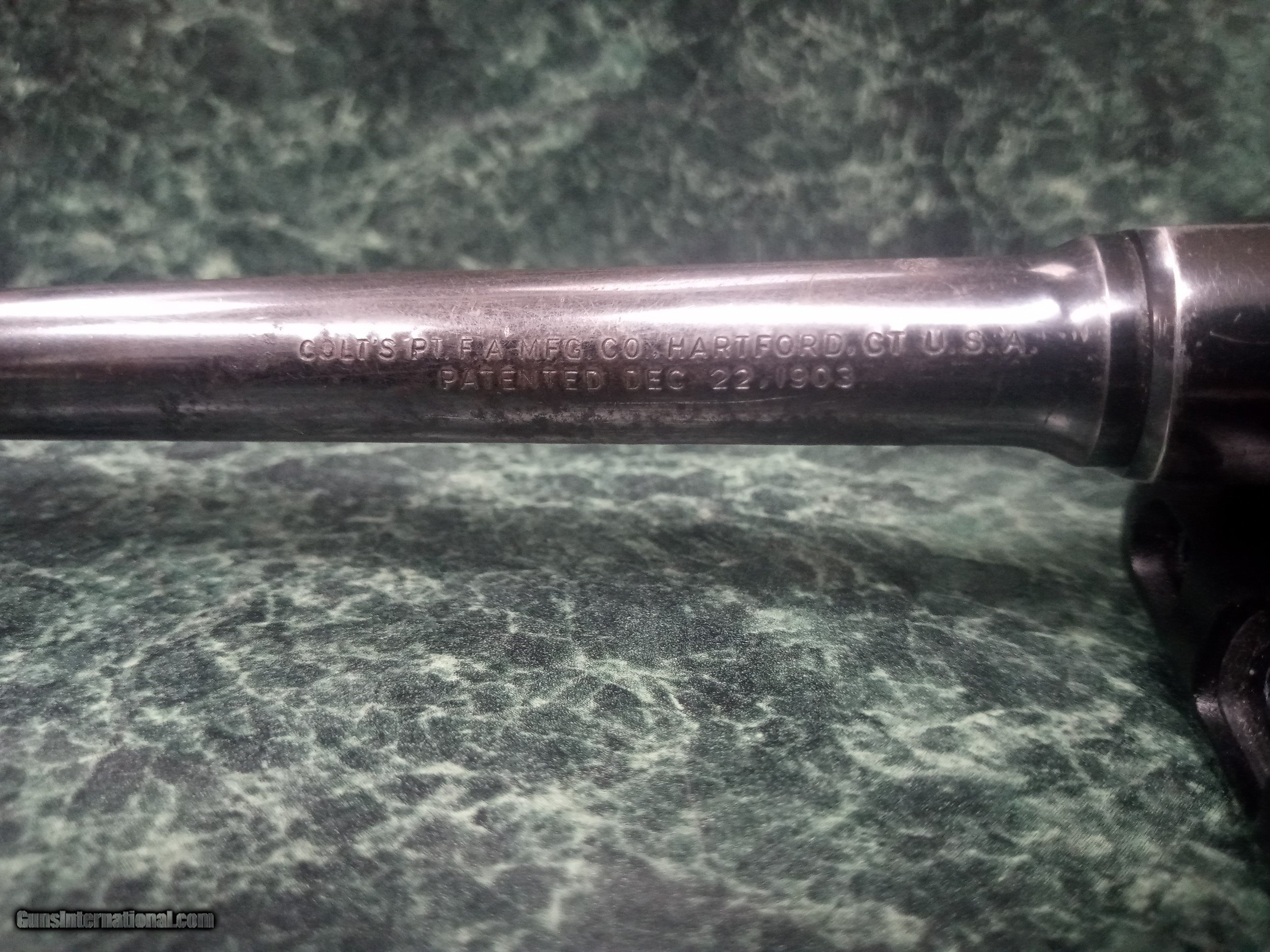 Description: Make: Colt Model: Colt Target Pre-Woodsman Serial Number: 495 Year of Manufacture: 1915 (://colt/serial-lookup) Caliber: .22 Long Rifle Action Type: Single Action Semi-Auto fed by Removable Magazine Markings: The left side of the slide is marked “COLT", "AUTOMATIC / CAL. 22 LONG RIFLE” and with a Rampant Colt logo. The top of the barrel is marked “COLT’S PT. F.A. MFG. CO. HARTFORD, CT. U.S.A. / PATented DEC. 22, 1903”. The left of the trigger guard is marked “P” and with “VP” in a triangle. The front strap is marked “495”, marked again on the bottom of the slide. The left side of the frame is marked “THE WOODSMAN”. Barrel Length: 6 5/8" Sights / Optics: The front sight is a beaded blade pinned to a slotted base fixed to the front of the barrel, adjustable for elevation. The rear sight is a square notch dovetailed to the rear of the slide, adjustable for windage. Stock Configuration & Condition: The grips are two-piece checkered walnut panels. The grips have light handling wear with some scattered scuffing and a few small patches of compressed checkers. The checkering is generally well defined. There are no chips or cracks. Overall, the grips are in Very Good condition. Type of Finish: Blued Finish Originality: Original Bore Condition: The bore is bright and the rifling is sharp. There is no erosion in the bore. Overall Condition: This pistol has been used in is 100 years but still functions very well and it very accurate. The screw head is tool-marked with a strong slot. The markings are clear. Overall, this pistol is in Good condition. Refinished with a 1915 magazine would make this a real jewel. Mechanics: The action functions correctly. The slide is not designed to lock back on an empty magazine but the safety can be used to hold the slide open for cleaning. Box, Paperwork & Accessories: One 10-round Factory magazine is included. Second set of grips also included Shipping / Handling / Insurance: $35 Priority Mail - Shipping to FFL01 Dealer or FFL03 C&R. Add 3% Credit Card Fees SOLD Curio/Relic: Yes Handgun Caliber: .22 Long Rifle Manufacturer: Colt Model: Pre-Woodsman Serial Number: 495 Barrel Length: 6 5/8 Condition: Good |