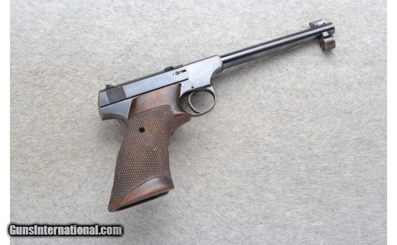 Description: SOLD Manufacturer: S/N 118580 Caliber Info: .22 Long Rifle Chambers: Semi-Auto 10 round magazine. Metal Condition: Fair. Has freckling, handling marks and light wear. Wood Condition: Fair with handling marks and minor wear. Bore Condition: Excellent. Barrels: 6.5 inch barrel with a rear serrated slide. Triggers: Grooved. Stock: Checkered walnut target style grip with a right thumb rest. Weight: 30 oz. Sights: Blade front. Notch rear. Item Location: Richfield, WI |