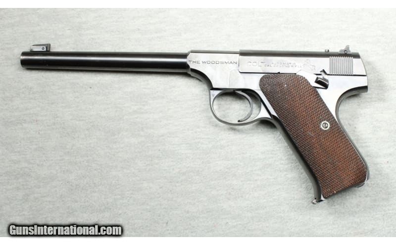 Description: Excellent condition, light finish wear, few small nicks & scratches, comes with one mag and NON original box. Colt "1st Series Target" semi auto rimfire target pistol, 6 1/2" barrel, blued finish, fixed sights, crisp serrated target trigger and checkered wood grips. .22 Long Rifle SOLD Chambers: Semi auto Metal Condition: Excellent Bore Condition: Bright Barrels: 6 1/2 Triggers: Serrated factory trigger Butt Pad: Wood grips Sights: Fixed iron sights Item Location: La Vista, NE |