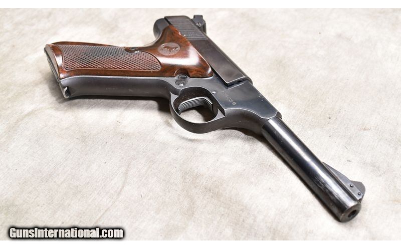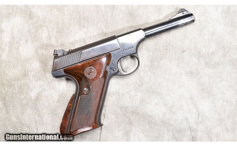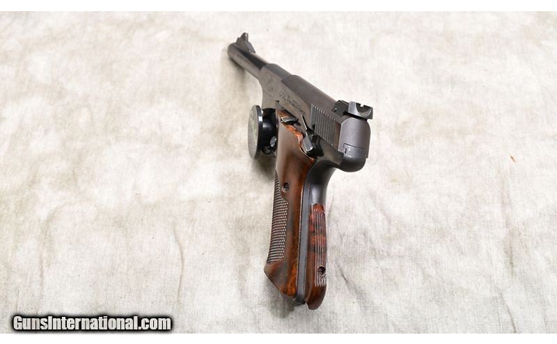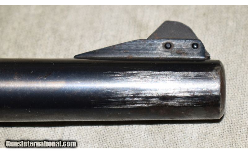 Description: Great little trail gun for the woods-runner. It has nice grips' adjustable sights, and easy-carry 4-1/2 inch barrel. The trigger is grooved and the slide appears tight. It has just enough wear to make a working gun that will be used, not stored. .22 Long Rifle SOLD Chambers: 10 rounds Metal Condition: Good. Some shallow scratches on the slide and frame. Some wear near the muzzle on the barrel. Wood Condition: Very good. Bore Condition: Shiny and bright with good rifling. Barrels: 4-1/2 inch Triggers: Factory single action trigger. Butt Pad: Brown wood-grain plastic with back strap shim. Weight: 31 oz Sights: Post and notch Item Location: Rogers |
