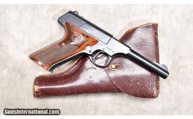 Description: The original trail gun from Colt. The slide release is behind the trigger guard, so it is a second-series gun. It features brown plastic grips, nice residual blue, and it comes with a holster. .22 Long Rifle SOLD Chambers: 10 Metal Condition: "Good. There is some surface rust, nicks, and dings. None are severe but it is there Wood Condition: Very good. Minor handling marks. Bore Condition: Shiny and bright with good rifling. Barrels: 4-1/2 inchc Triggers: Factory trigger Butt Pad: Brown plastic. Weight: 31 oz Sights: Post and notch Item Location: Rogers |