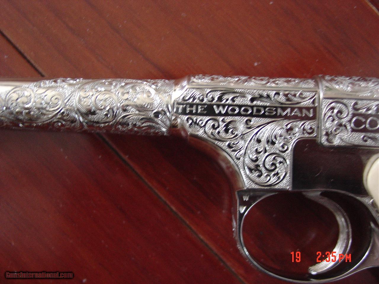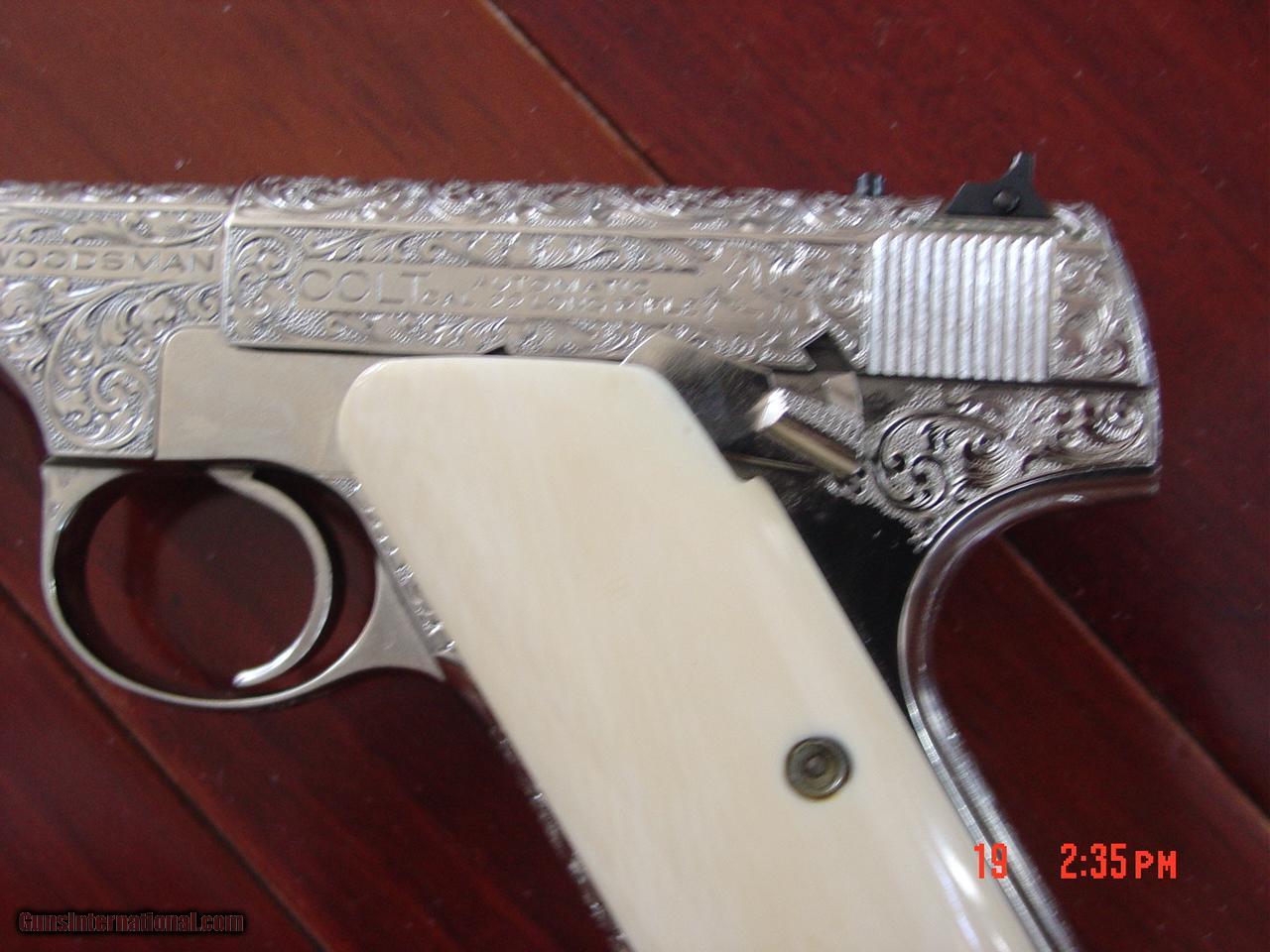 Colt Woodsman 22lr,Master engraved by Denise Therion,refinished bright nickel,real yellowed aged ivory grips,1934,a real masterpiece & rare !